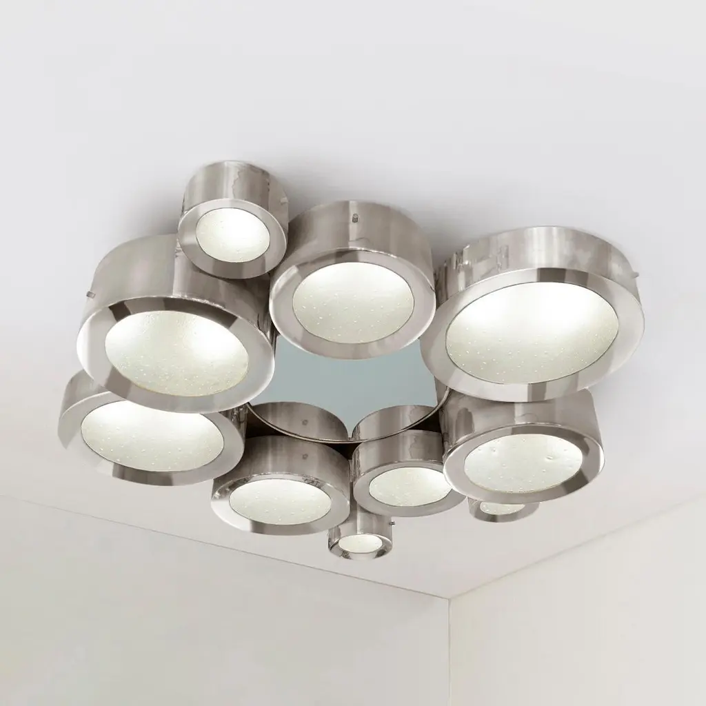 The Helios ceiling light features an imposing composition of illuminated Murano glass shades gravitating around a central tinted mirror. The first images show the fixture in satin brass and satin nickel with a rose center mirror-subsequent pictures show it in a selection of alternative finishes. See Helios 66 for larger version.Starting at $ 18,500 for standard finishes.Starting at $ 19,900 for premium finishes.Customization Options:Each fixture is hand crafted in Italy and can be customized in size, layout and number of shades. Available in any of our 10 finishes and 8 enamel colors. Compatible with our Murano bubble glass and Murano frosted glass. Central mirror can be any of our 7 colors. Can be installed as a flush mount or on stems.Lead Time: 12-14 weeks plus shipping.Diameter: 44”Height: 7”. Overall height can be adjusted as needed.Electrical: 15 E12 40W incandescent or 75W LED equivalentModel#: LTZ647B