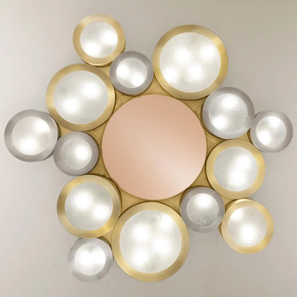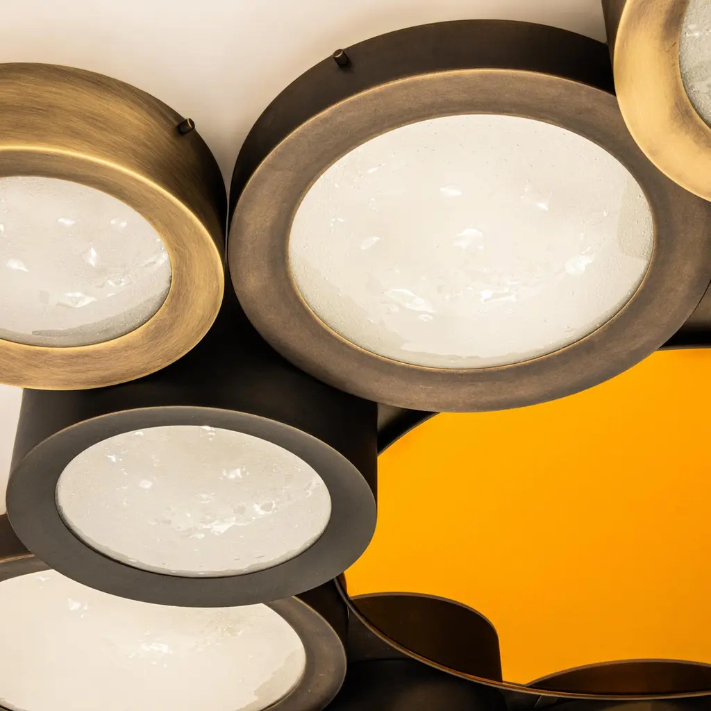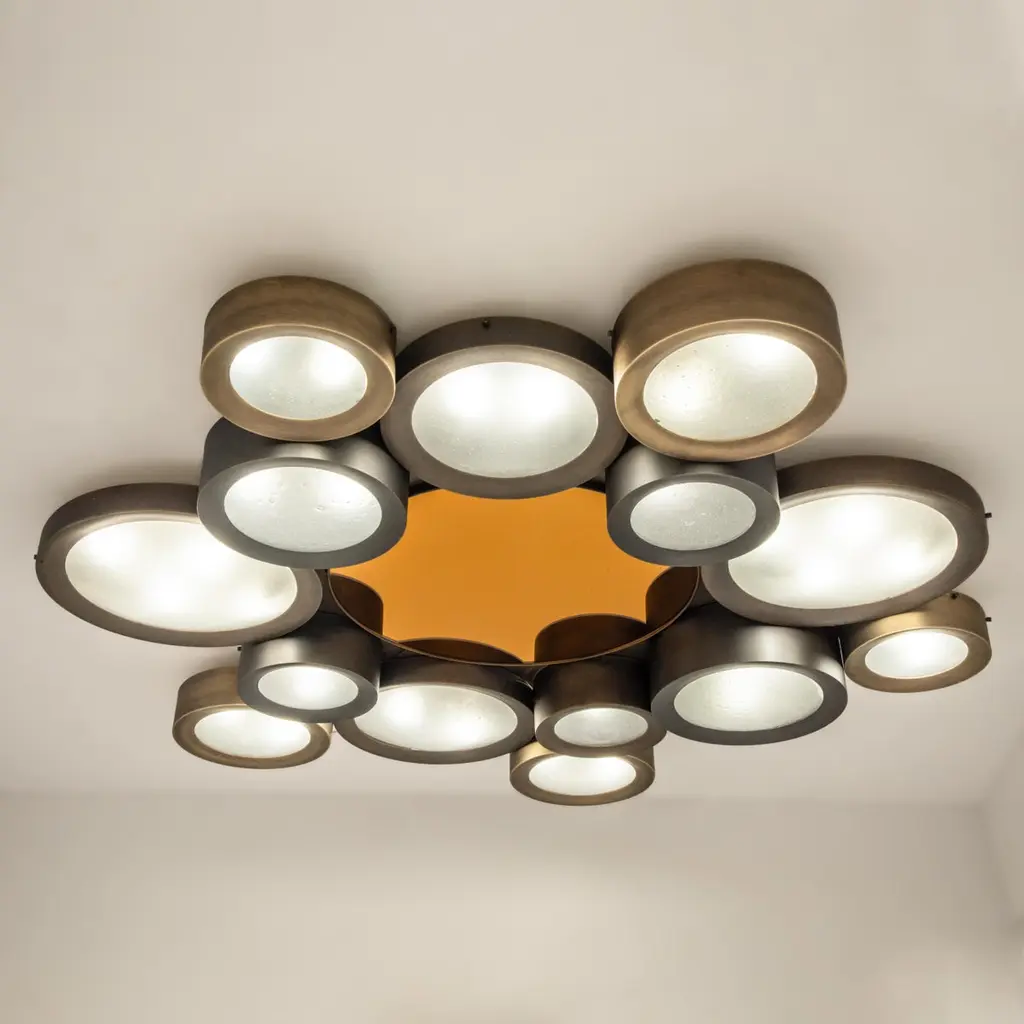 The Helios ceiling light features an imposing composition of illuminated Murano glass shades gravitating around a central tinted mirror. The first images show the fixture in a medley of bronze finishes with an amber center mirror-subsequent pictures show it in a selection of alternative finishes. See Helios 44 for smaller version.Starting at $ 26,900 for standard finishes.Starting at $ 29,900 for premium finishes.Customization Options: Each fixture is hand crafted in Italy and can be customized in size, layout and number of shades. Available in any of our 10 finishes and 8 enamel colors. Compatible with our Murano bubble glass and Murano frosted glass. Central mirror can be any of our 7 colors. Can be installed as a flush mount or on stems.Lead Time: 10-14 weeks plus shipping.Diameter: 66”Height: 7”. Overall height can be adjusted as needed. Electrical: 34 E12 candelabra base LED bulbs, 40W max equivalent. Model#: LTZ647
