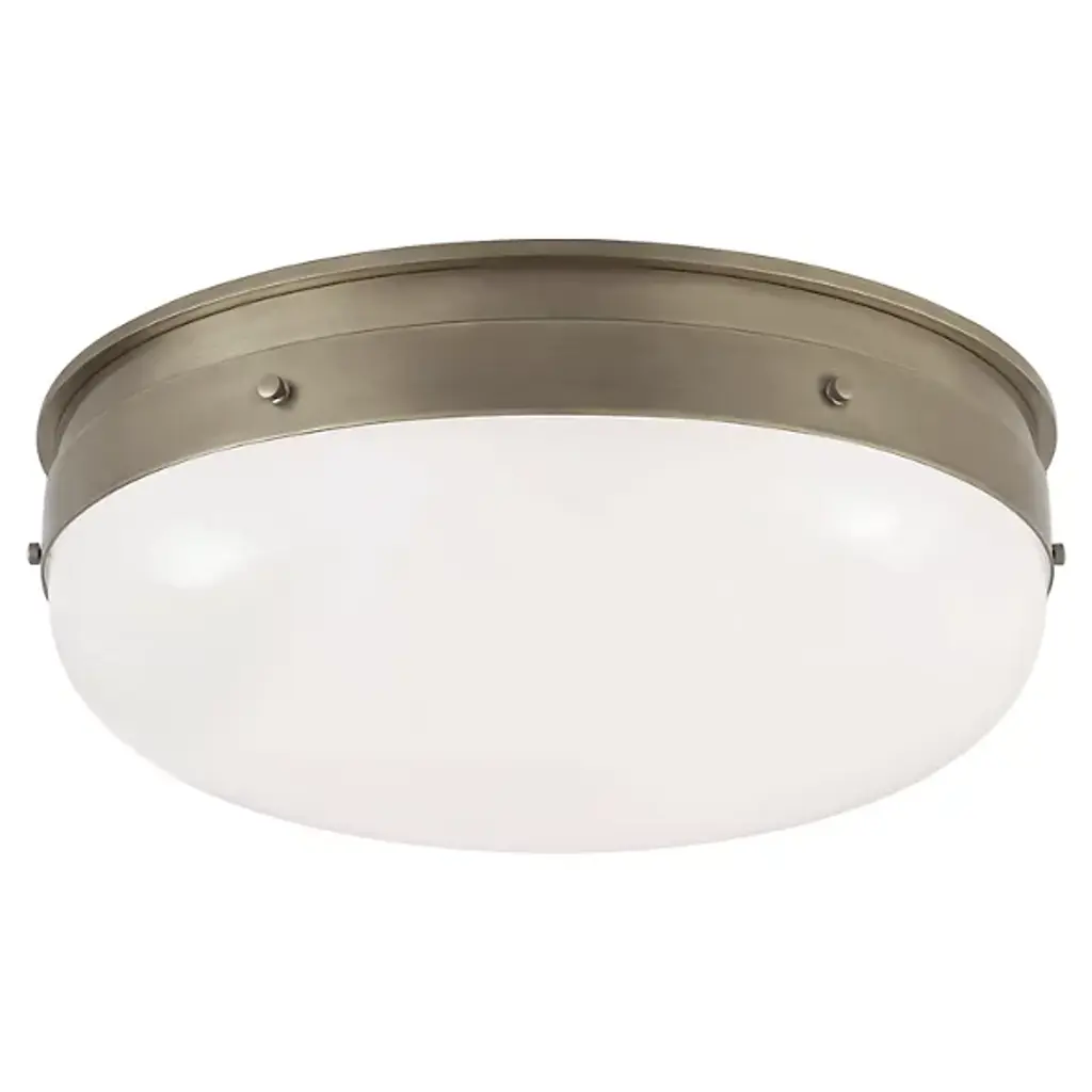 Industrially inspired with a mid-mod flow. The Hicks LED Flushmount is a transitional design from Thomas O’Brien for Visual Comfort Signature, formerly known as Visual Comfort, Featuring exposed bolts around the base for that industrial look and a sleek, flowing bulb-like shade of glass for the mid-mod element, it also boasts integrated LED illumination. LED is great for energy efficiency and has a much longer lifespan than the average lighting unit. Place the Hicks anywhere that would benefit from the elevated aesthetic and illumination experience.