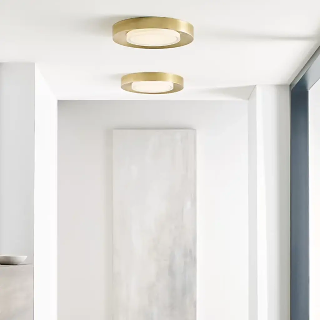 The Hilo LED Flushmount by Visual Comfort Modern, formerly known as Tech Lighting, has a sleek, simple look that was inspired by the popularity of some of Sean Lavin’s other designs that feature pressed glass. Set close to the ceiling in an elegant, circular metal frame with a tapered trim around its edge, a set of diffused, integrated, energy-efficient light sources are surrounded by a pressed glass shade for a layered look. This composition offers plenty of illumination to surroundings, creating a bright, welcoming environment wherever it is installed.