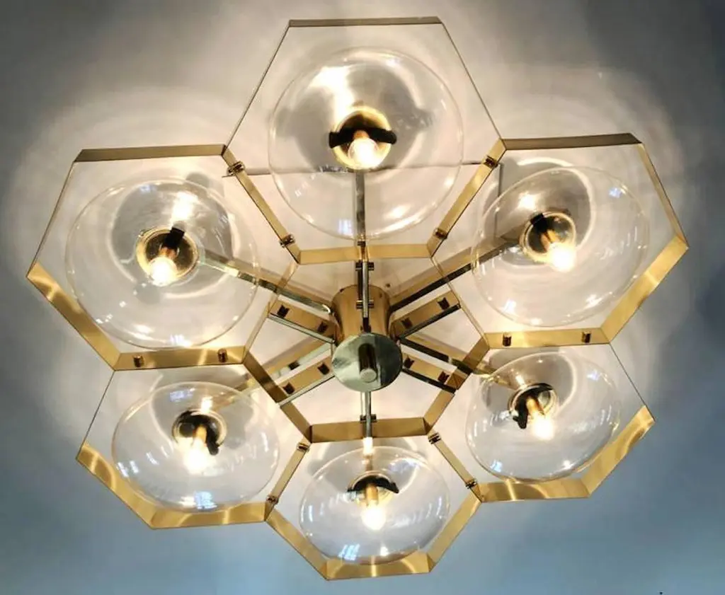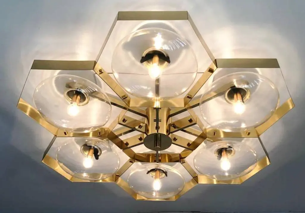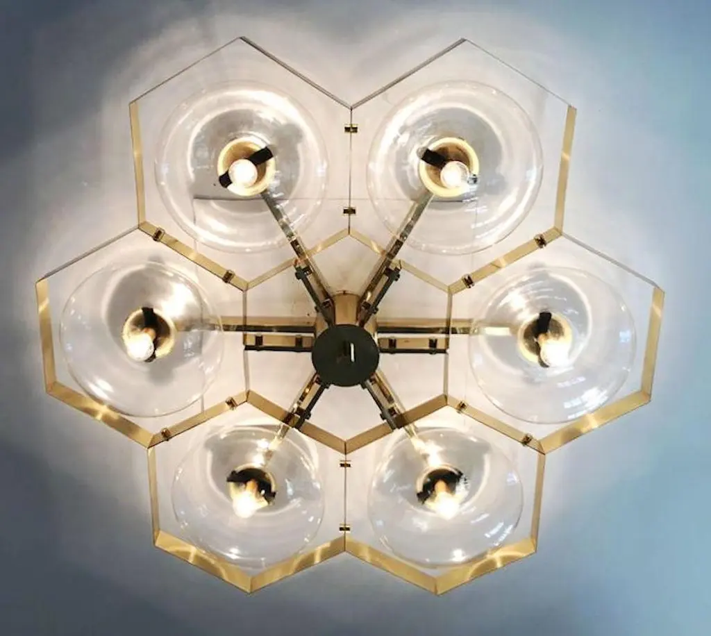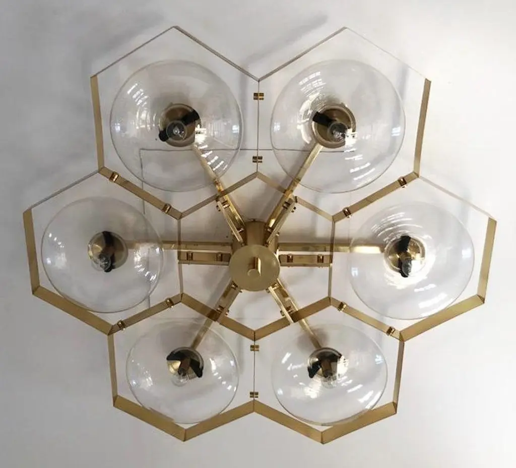 Italian flush mount with Murano glass shades mounted on solid brass frame / Made in ItalyDesigned by Fabio Ltd, inspired by Angelo Lelli and Arredoluce styles6 lights / E12 or E14 / max 40W eachMeasures: Diameter 43 inches / height 10 inchesOrder only / This item ships from ItalyOrder reference #: FABIOLTD HIVE FLUSH MOUNT 6The listed price applies to all Brass finishes : Unlacquered Natural Brass, Unlacquered Polished Brass, Lacquered Polished Brass, Lacquered Satin BrassOther finishes available with upcharge of $600: Bronzed, Polished Chrome, Satin Chrome, Polished Nickel, Satin Nickel, Polished Black Nickel, Satin Black Nickel, Polished Copper, Satin Copper
