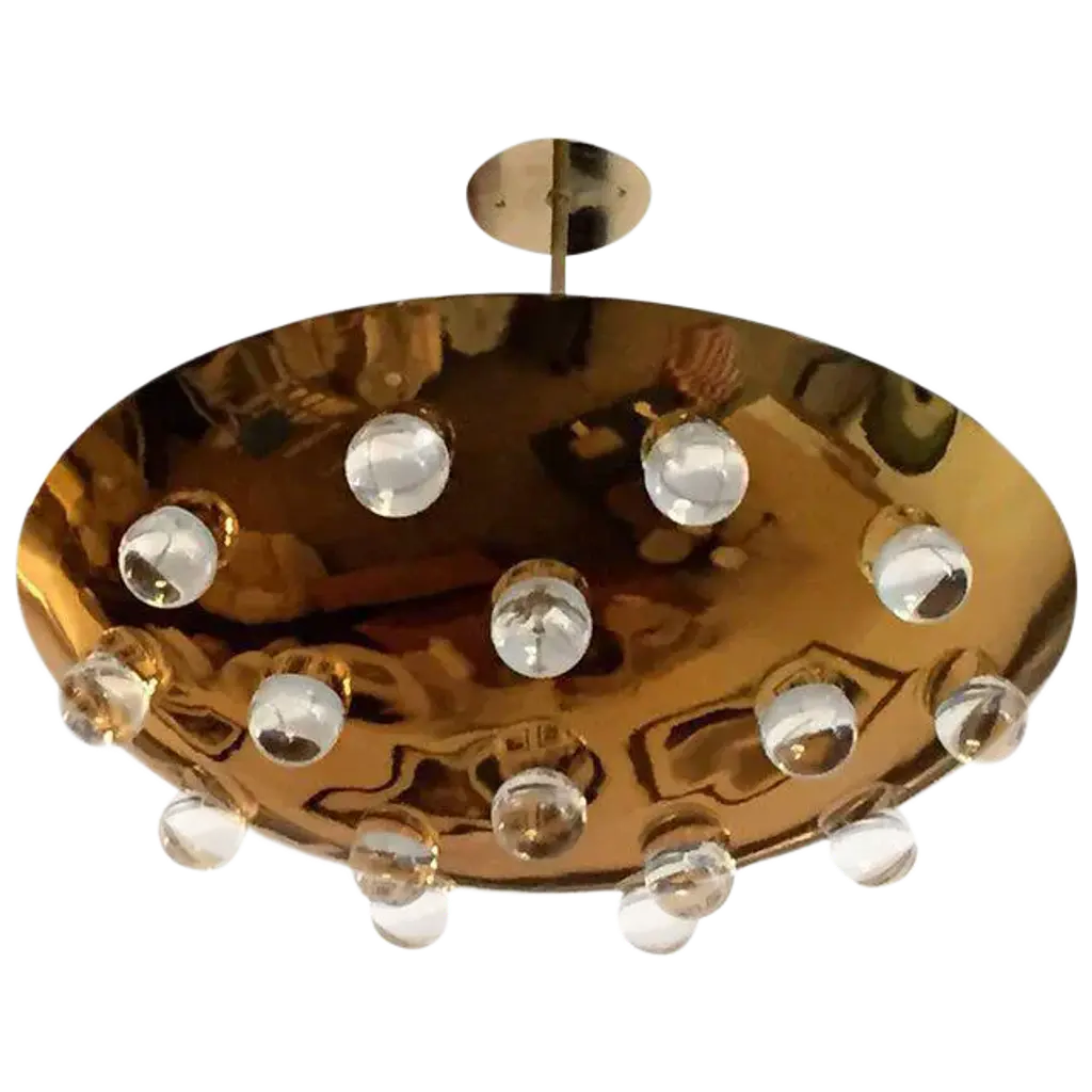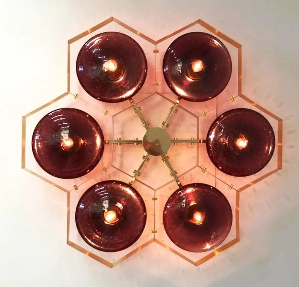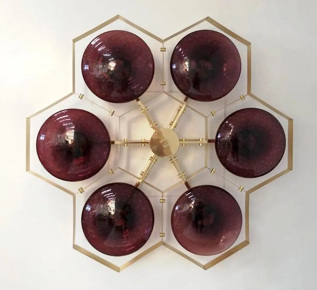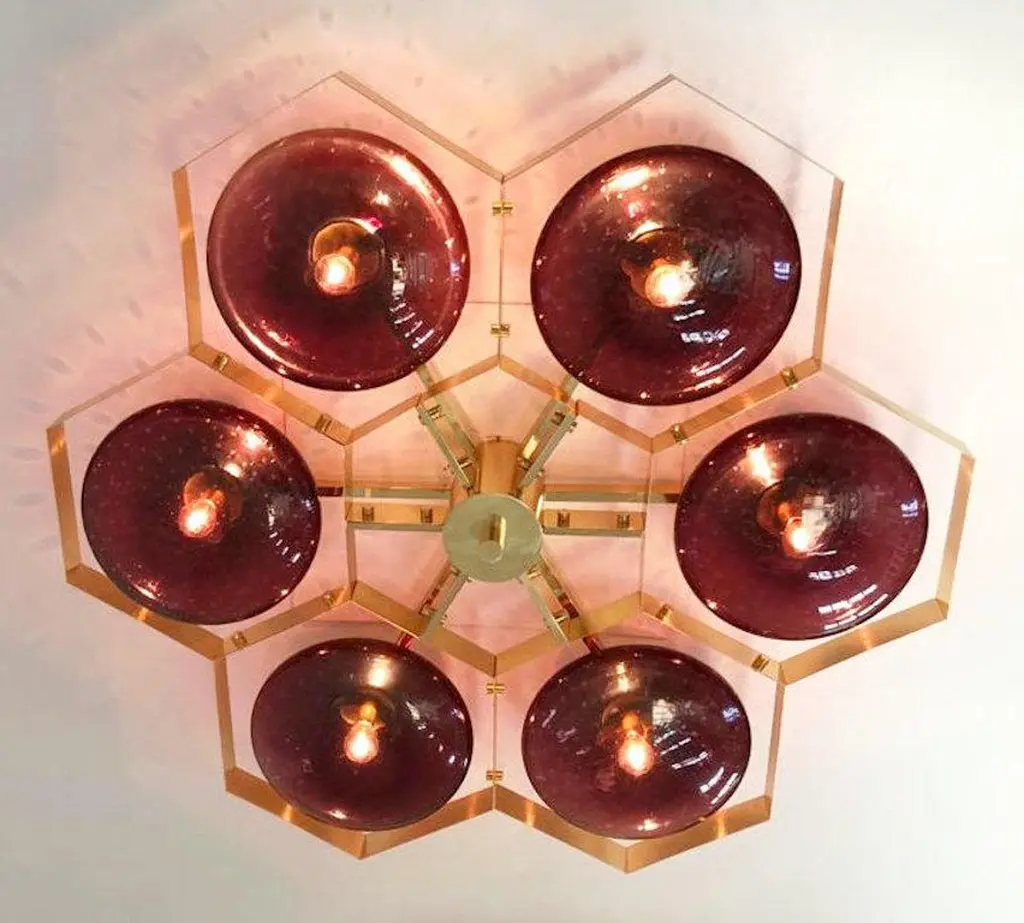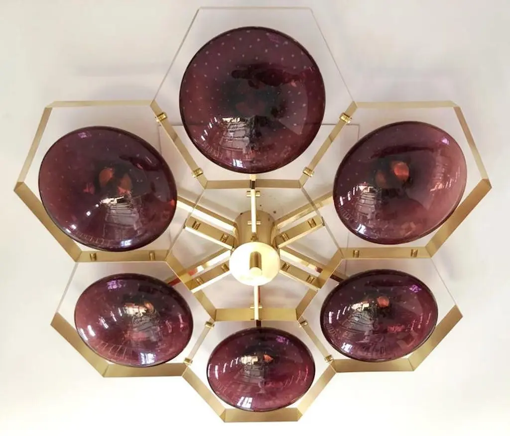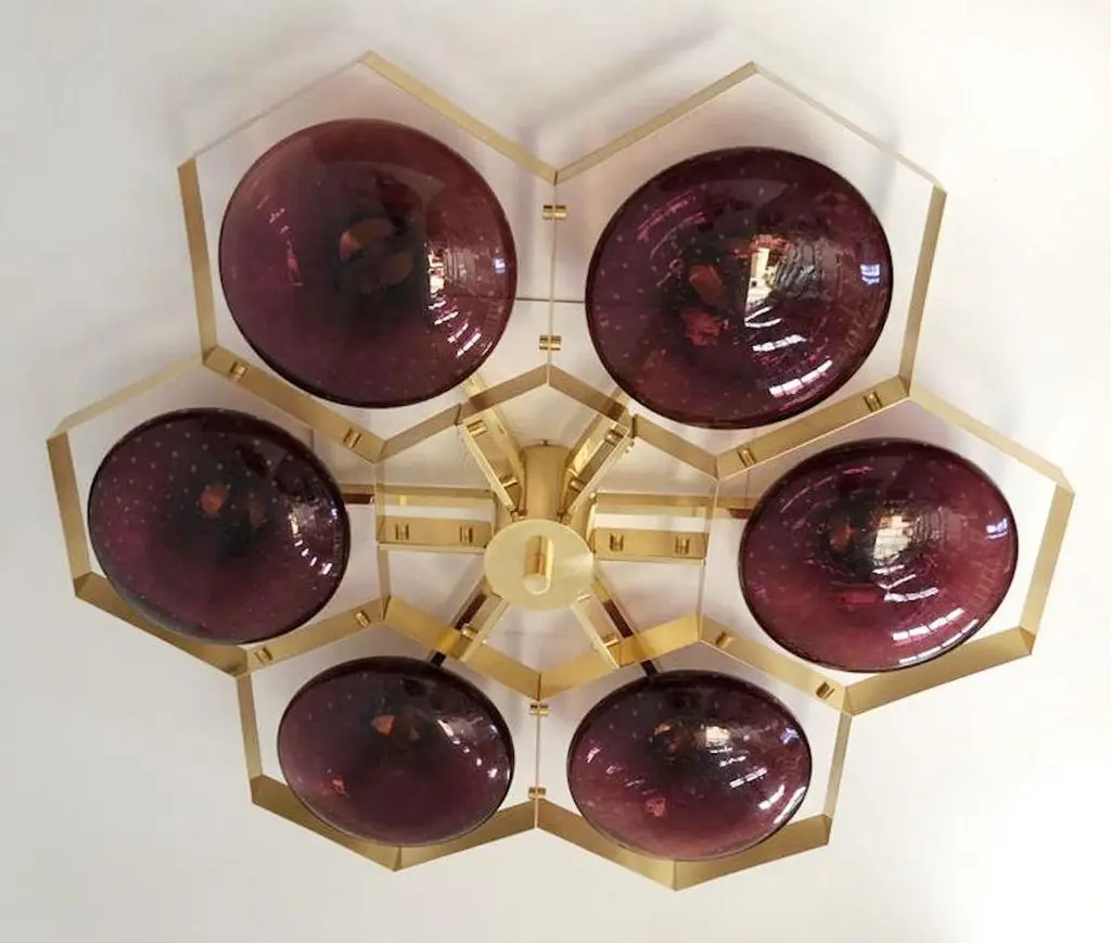 Italian flush mount with Murano glass shades mounted on solid brass frame / Made in ItalyDesigned by Fabio Ltd, inspired by Angelo Lelli and Arredoluce styles6 lights / E12 or E14 / max 40W eachMeasures: Diameter 43 inches / height 10 inchesOrder only / This item ships from ItalyOrder reference #: FABIOLTD HIVE FLUSH MOUNT 6The listed price applies to all Brass finishes : Unlacquered Natural Brass, Unlacquered Polished Brass, Lacquered Polished Brass, Lacquered Satin BrassOther finishes available with upcharge of $600: Bronzed, Polished Chrome, Satin Chrome, Polished Nickel, Satin Nickel, Polished Black Nickel, Satin Black Nickel, Polished Copper, Satin Copper
