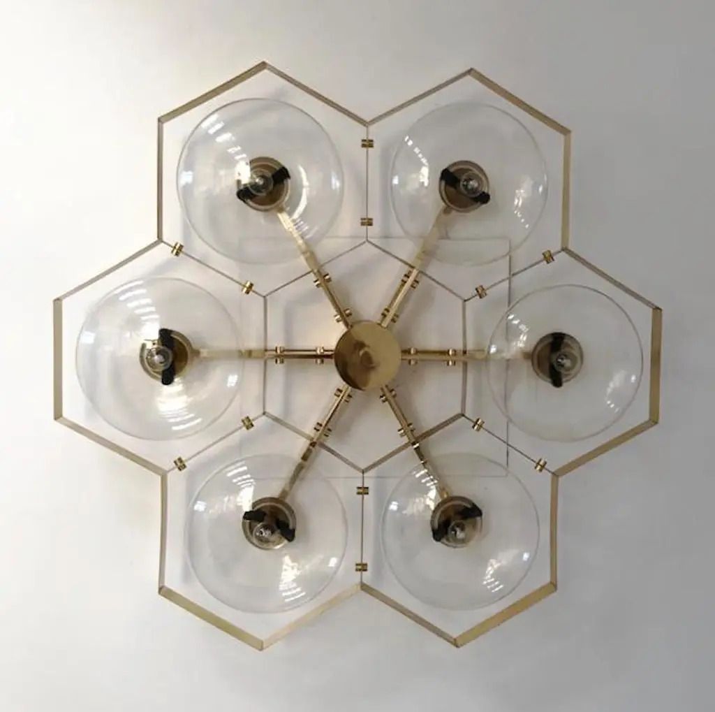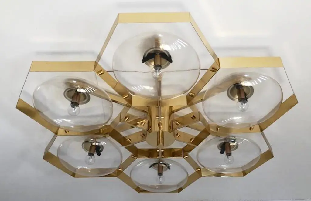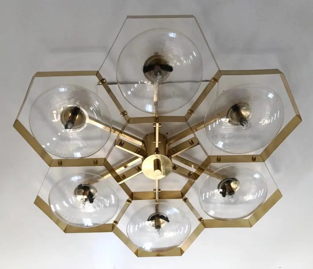 Italian flush mount with Murano glass shades mounted on solid brass frame / Made in ItalyDesigned by Fabio Ltd, inspired by Angelo Lelli and Arredoluce styles6 lights / E12 or E14 / max 40W eachMeasures: Diameter 43 inches / height 10 inchesOrder only / This item ships from ItalyOrder reference #: FABIOLTD HIVE FLUSH MOUNT 6The listed price applies to all Brass finishes : Unlacquered Natural Brass, Unlacquered Polished Brass, Lacquered Polished Brass, Lacquered Satin BrassOther finishes available with upcharge of $600: Bronzed, Polished Chrome, Satin Chrome, Polished Nickel, Satin Nickel, Polished Black Nickel, Satin Black Nickel, Polished Copper, Satin Copper