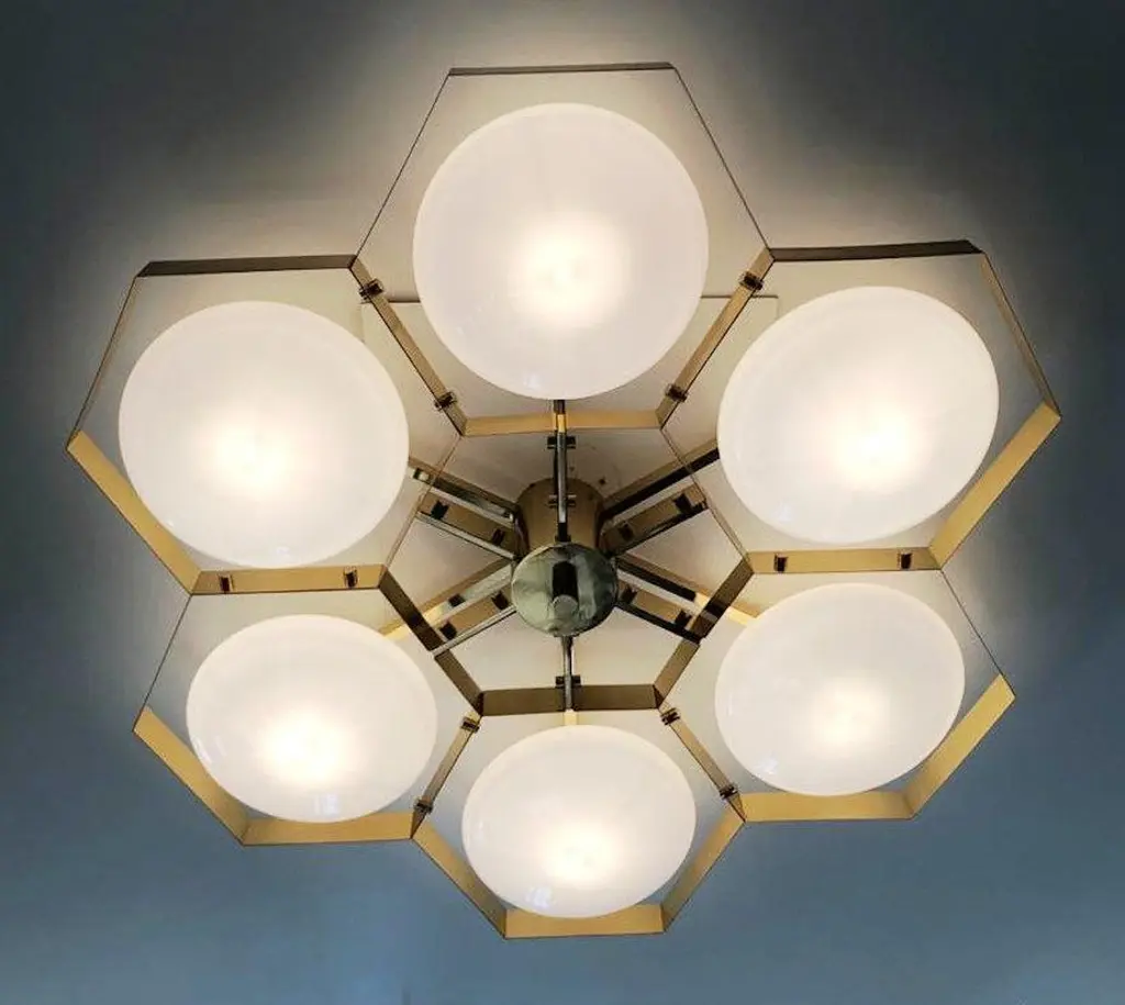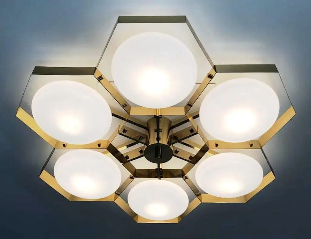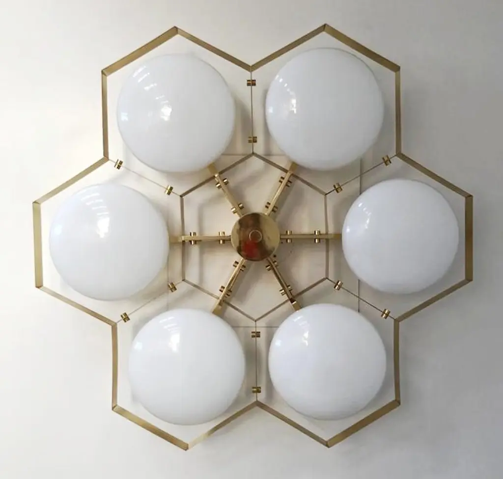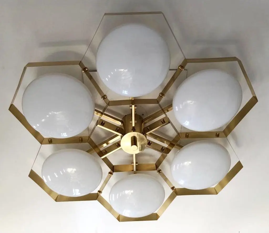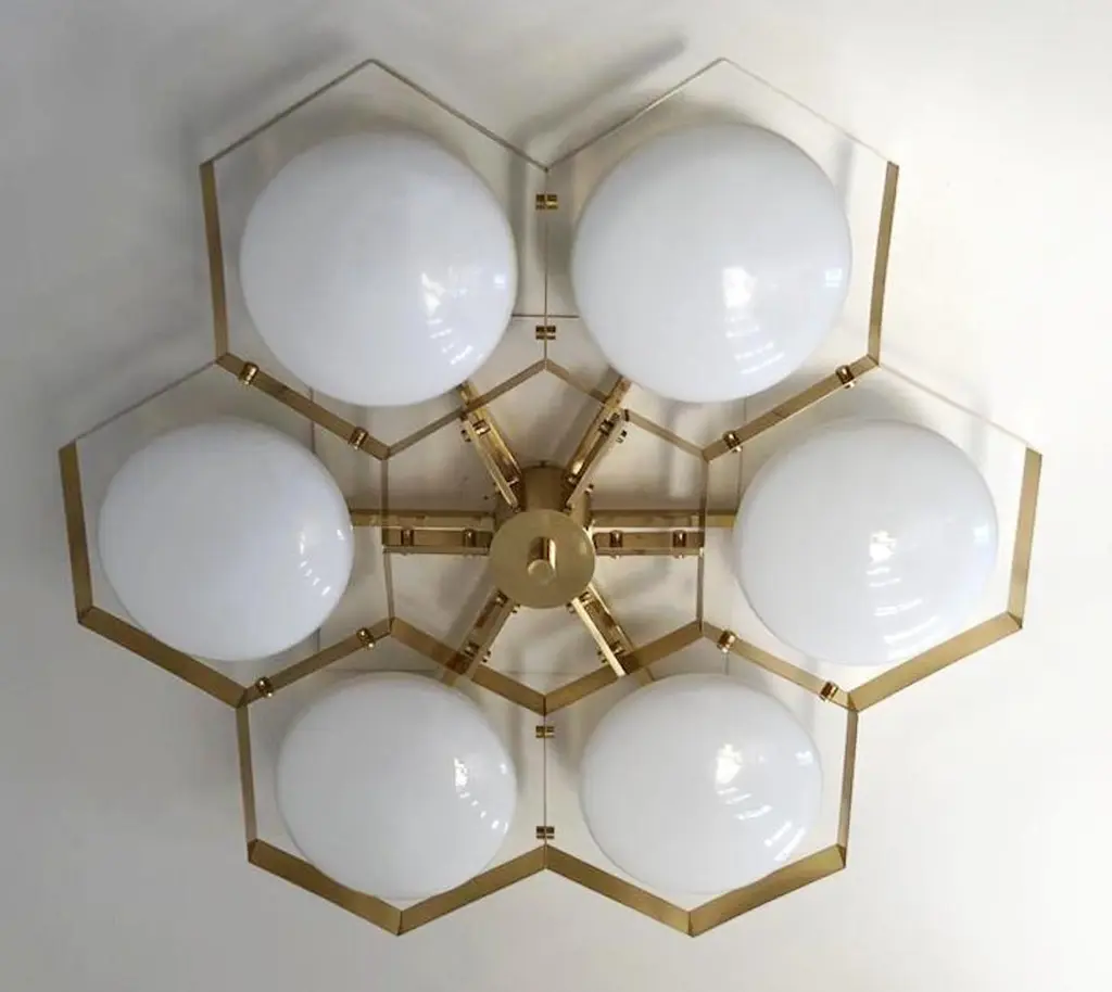 Italian flush mount with Murano glass shades mounted on solid brass frame / Made in ItalyDesigned by Fabio Ltd, inspired by Angelo Lelli and Arredoluce styles6 lights / E12 or E14 / max 40W eachMeasures: Diameter 43 inches / height 10 inchesOrder only / This item ships from ItalyOrder reference #: FABIOLTD HIVE FLUSH MOUNT 6The listed price applies to all Brass finishes : Unlacquered Natural Brass, Unlacquered Polished Brass, Lacquered Polished Brass, Lacquered Satin BrassOther finishes available with upcharge of $600: Bronzed, Polished Chrome, Satin Chrome, Polished Nickel, Satin Nickel, Polished Black Nickel, Satin Black Nickel, Polished Copper, Satin Copper