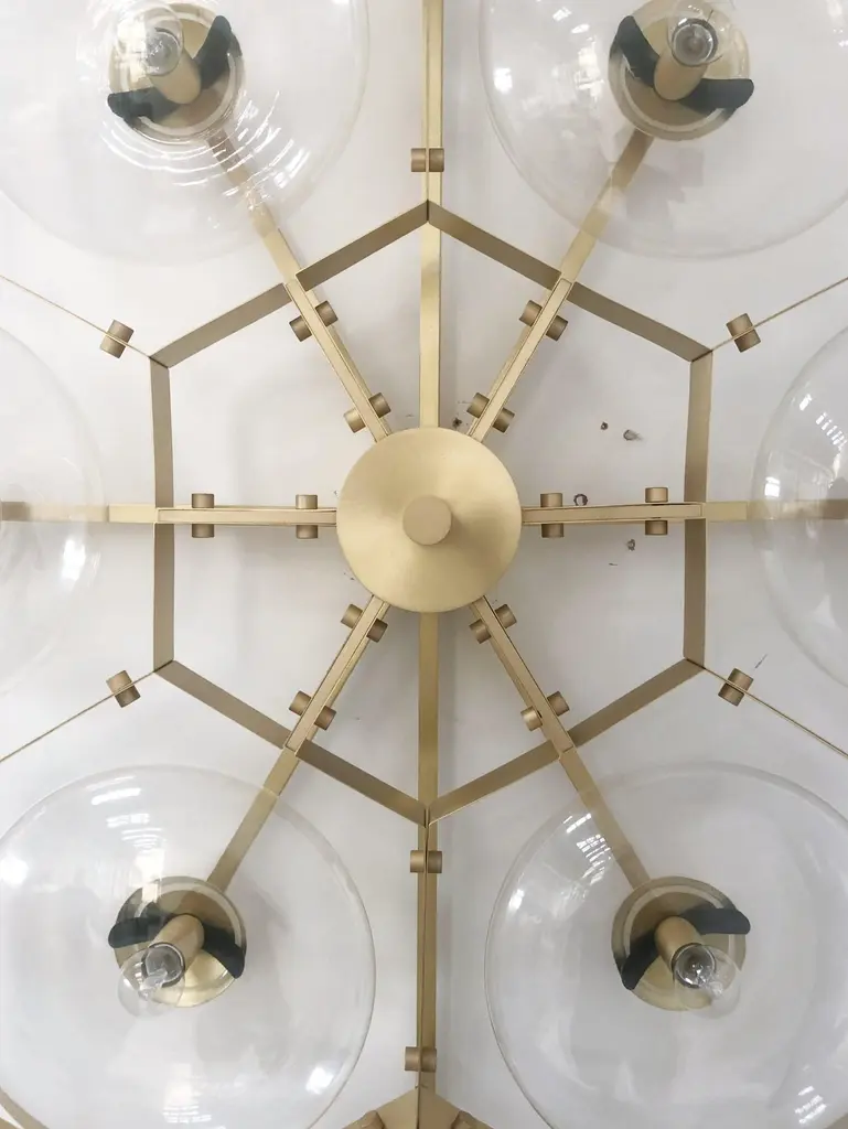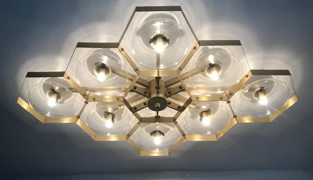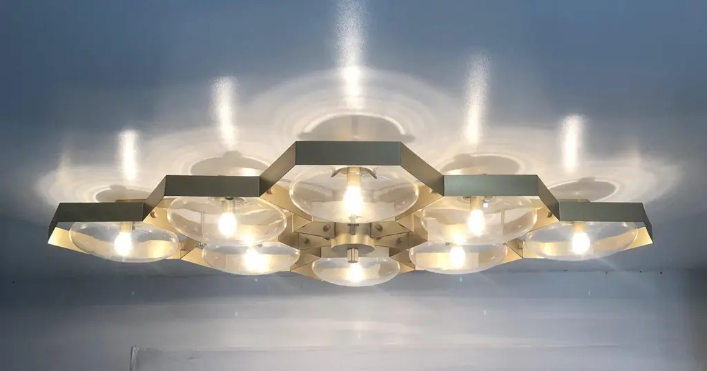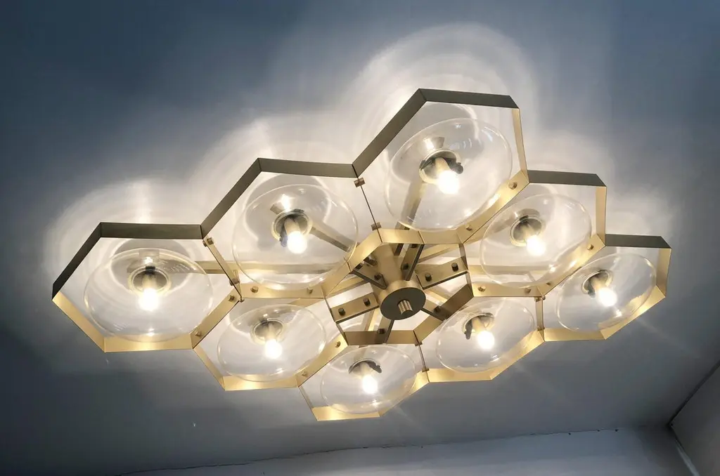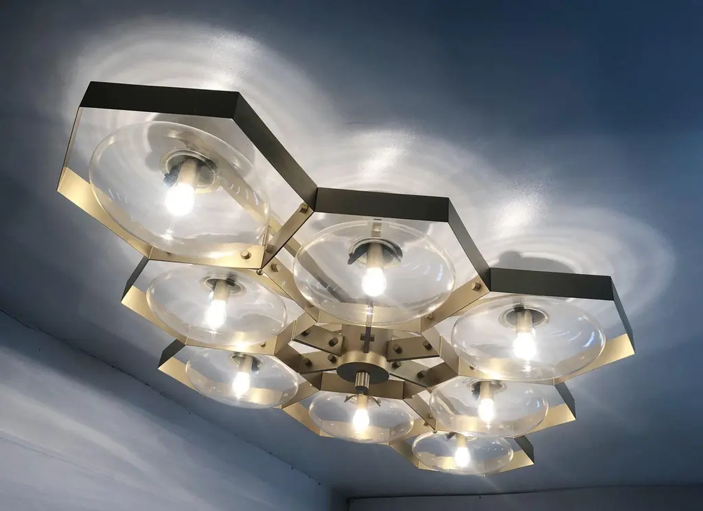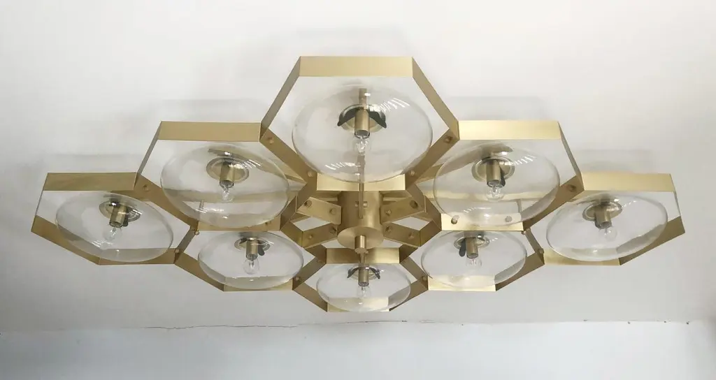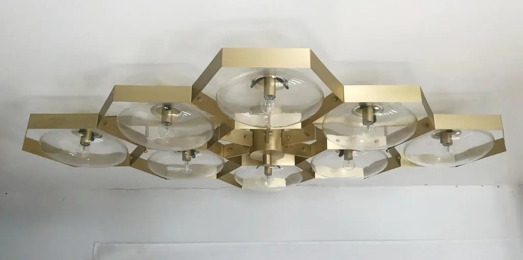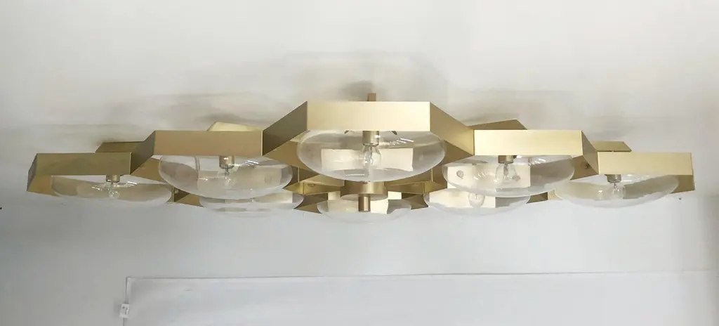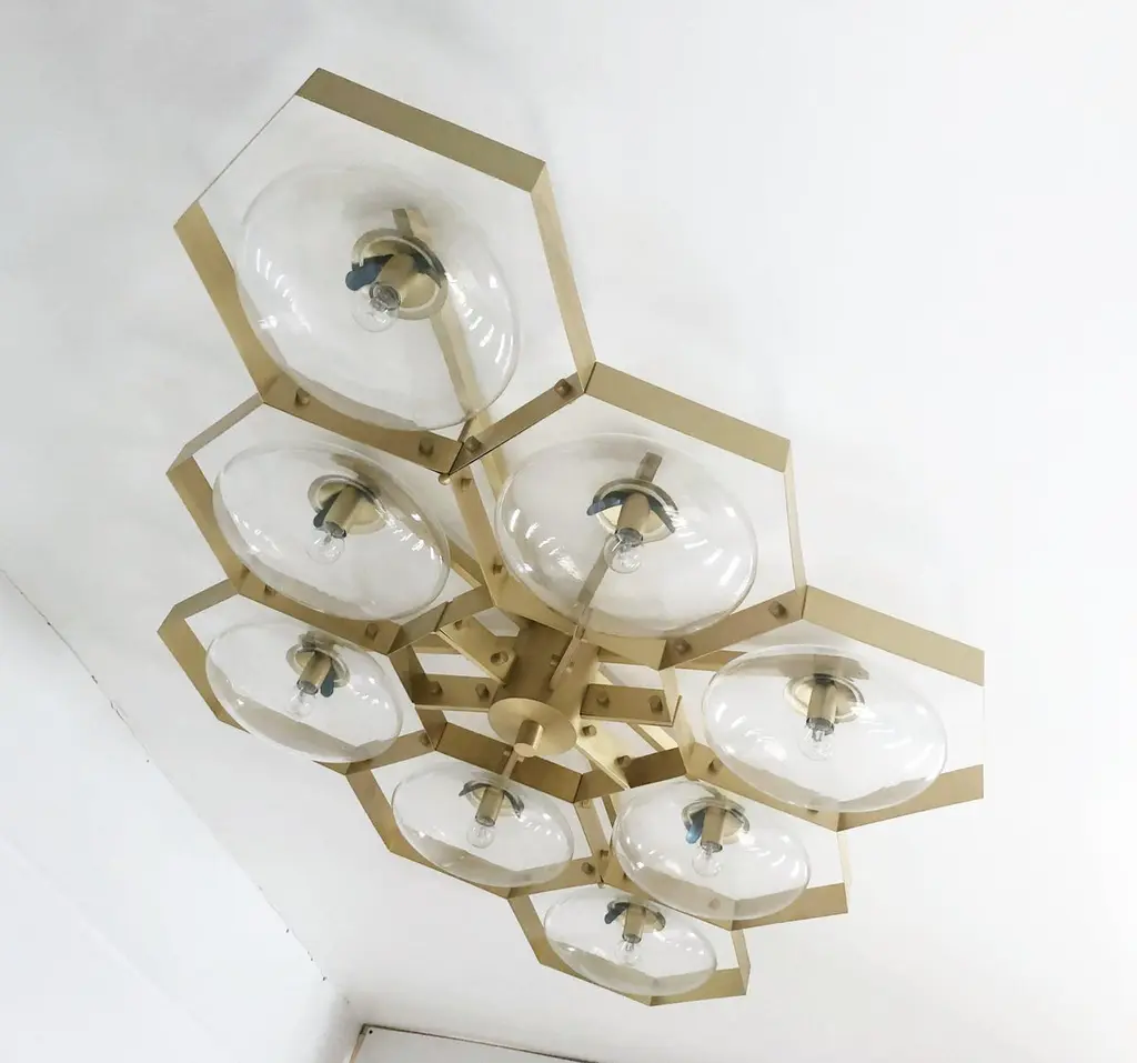 Italian flush mount with Murano glass shades mounted on solid brass frame / Made in ItalyDesigned by Fabio Ltd, inspired by Angelo Lelli and Arredoluce styles8 lights / E12 or E14 / max 40W eachMeasures: Length 65 inches, width 42.5 inches, height 10 inchesOrder only / This item ships from ItalyOrder Reference #: FABIOLTD HIVE FLUSH MOUNT 8The listed price applies to all Brass finishes : Unlacquered Natural Brass, Unlacquered Polished Brass, Lacquered Polished Brass, Lacquered Satin BrassOther finishes available with upcharge of $1,500: Bronzed, Polished Chrome, Satin Chrome, Polished Nickel, Satin Nickel, Polished Black Nickel, Satin Black Nickel, Polished Copper, Satin Copper