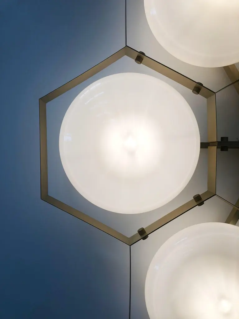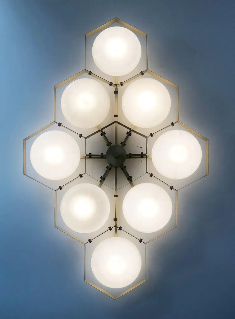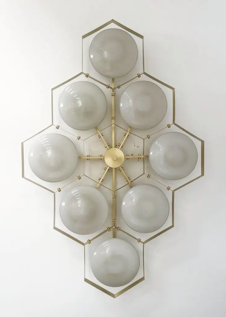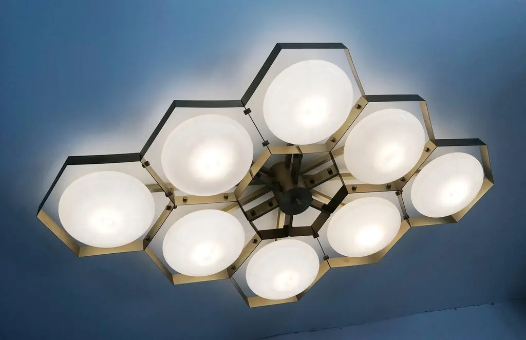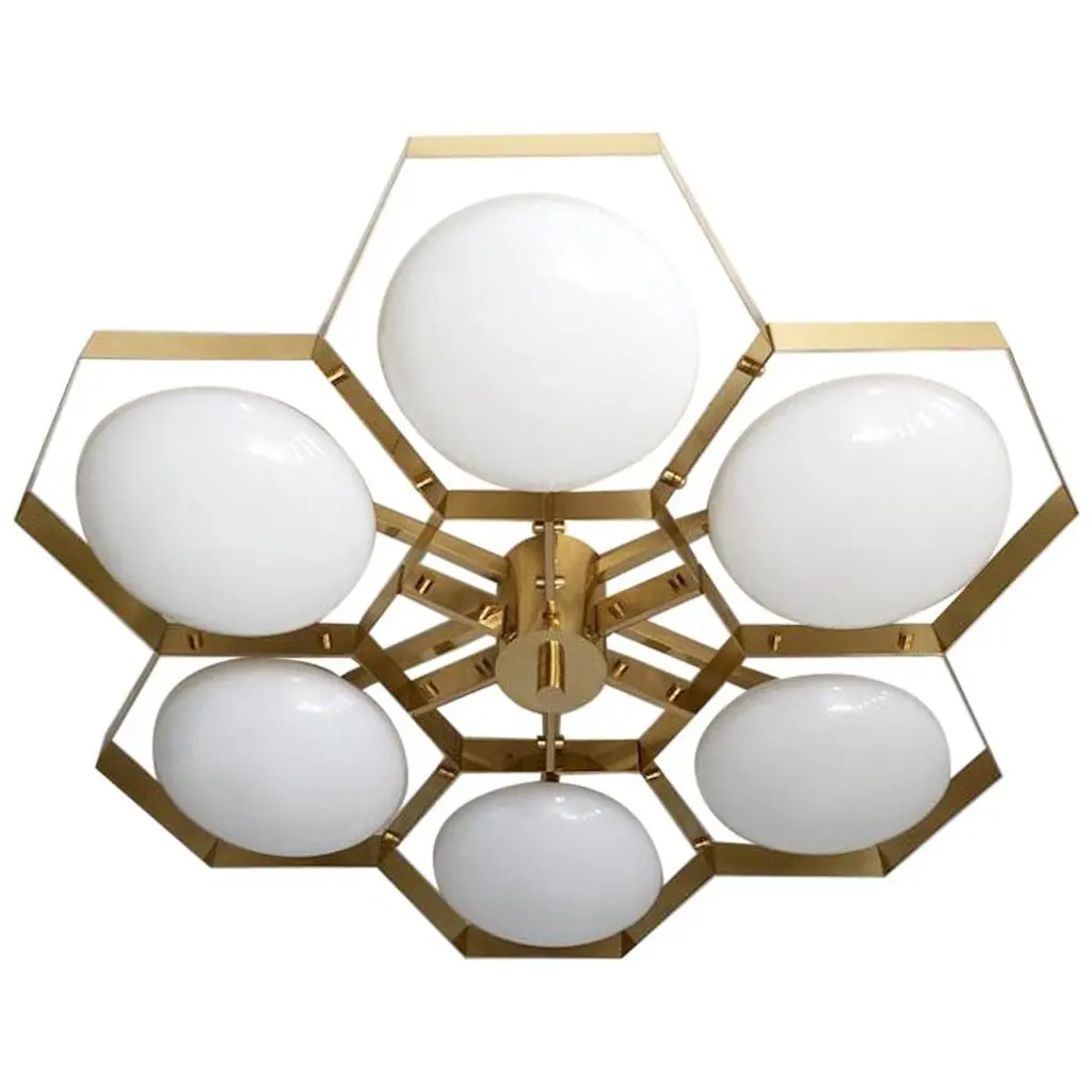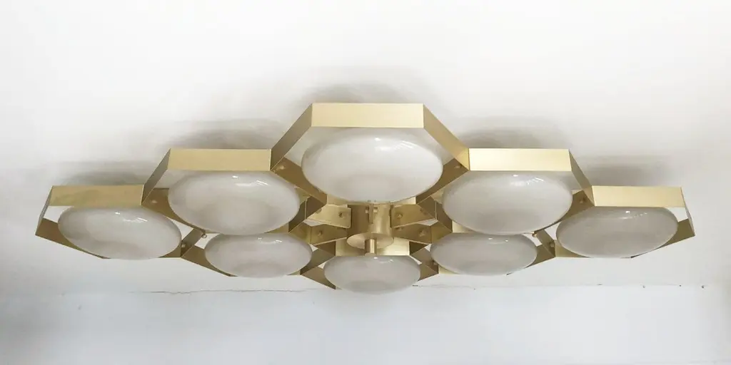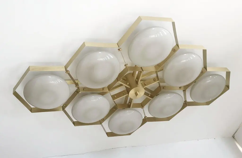 Italian flush mount with Murano glass shades mounted on solid brass frame / Made in ItalyDesigned by Fabio Ltd, inspired by Angelo Lelli and Arredoluce styles8 lights / E12 or E14 / max 40W eachMeasures: Length 65 inches, width 42.5 inches, height 10 inchesOrder only / This item ships from ItalyOrder Reference #: FABIOLTD HIVE FLUSH MOUNT 8The listed price applies to all Brass finishes : Unlacquered Natural Brass, Unlacquered Polished Brass, Lacquered Polished Brass, Lacquered Satin BrassOther finishes available with upcharge of $1,500: Bronzed, Polished Chrome, Satin Chrome, Polished Nickel, Satin Nickel, Polished Black Nickel, Satin Black Nickel, Polished Copper, Satin Copper