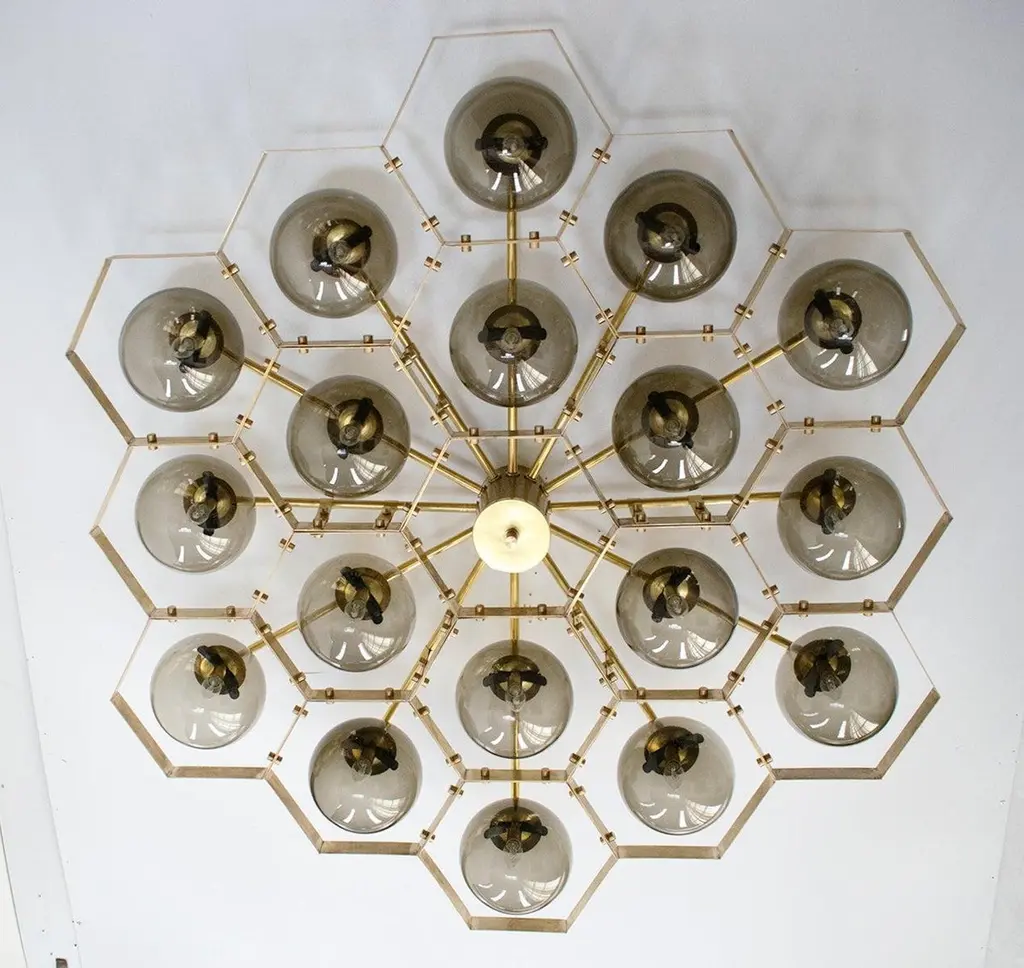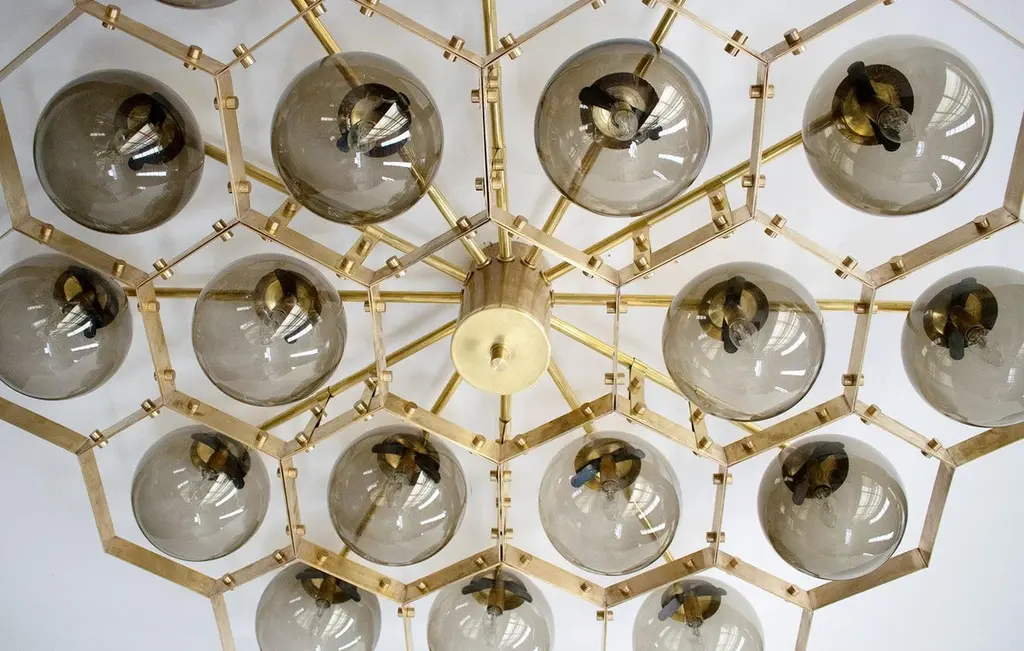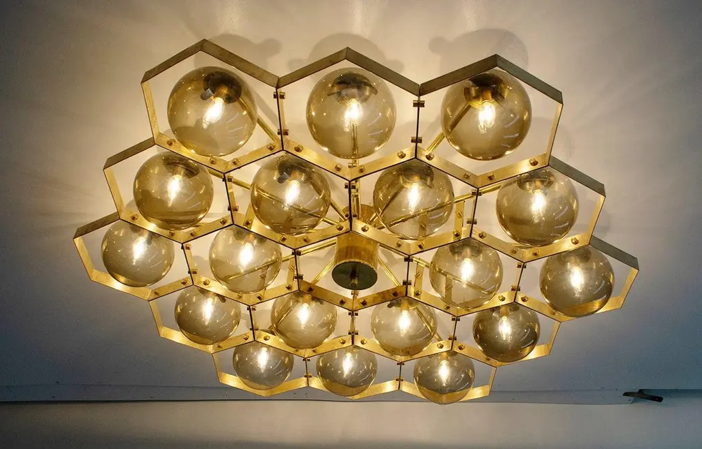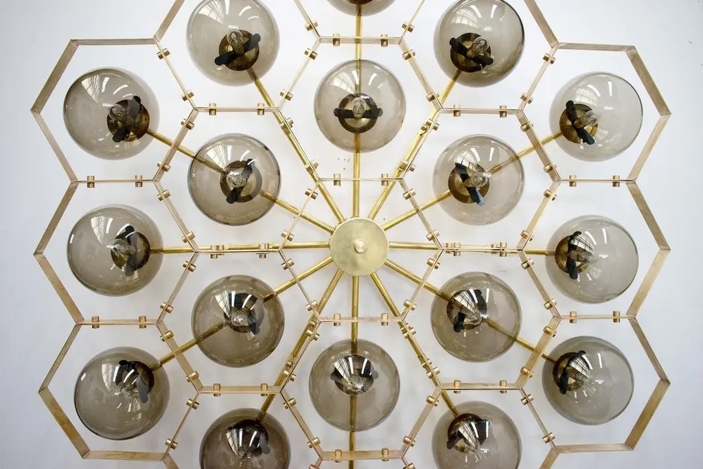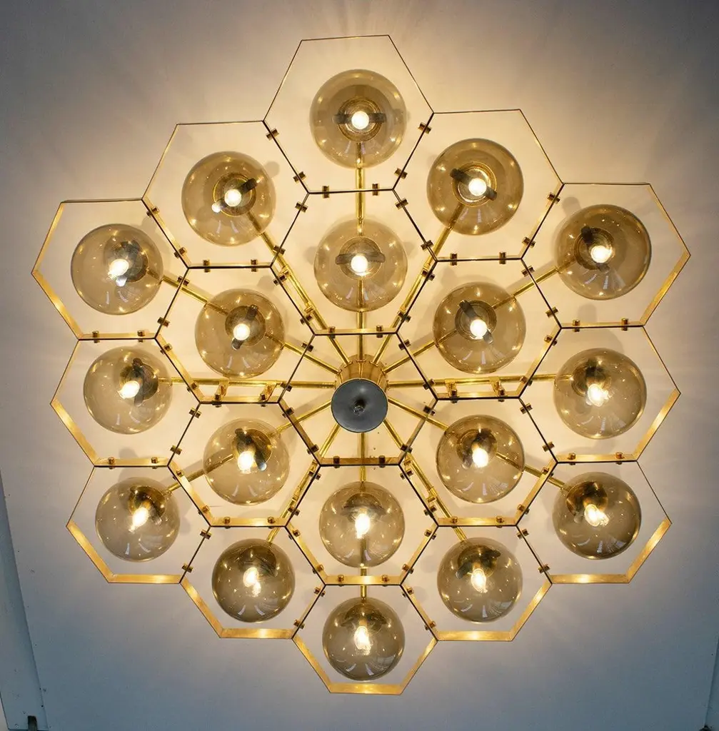Italian flush mount with Murano globes mounted on solid brass frame / Made in ItalyDesigned by Fabio Ltd, inspired by Angelo Lelli and Arredoluce styles18 lights / E12 or E14 type / max 40W each Diameter: 59 inches / Height: 11 inchesOrder only / This item ships from ItalyOrder Reference #: FABIOLTD HONEYCOMB FLUSH MOUNT 18The listed price applies to all Brass finishes : Unlacquered Natural Brass, Unlacquered Polished Brass, Lacquered Polished Brass, Lacquered Satin BrassOther finishes available with upcharge of $2,500: Bronzed, Polished Chrome, Satin Chrome, Polished Nickel, Satin Nickel, Polished Black Nickel, Satin Black Nickel, Polished Copper, Satin Copper