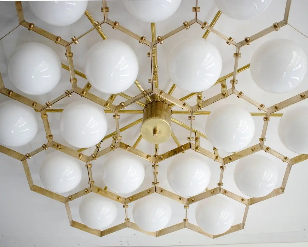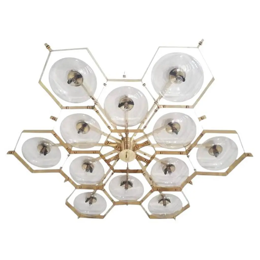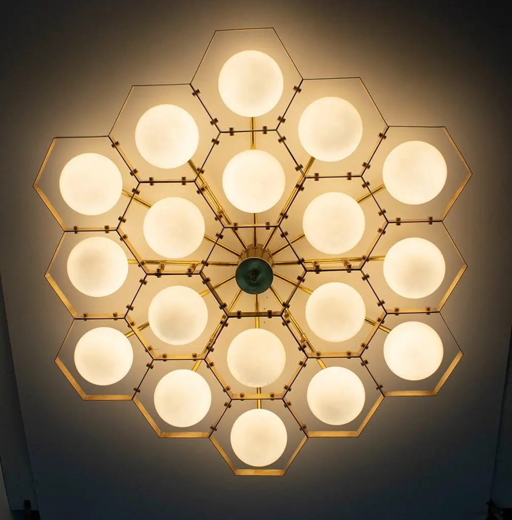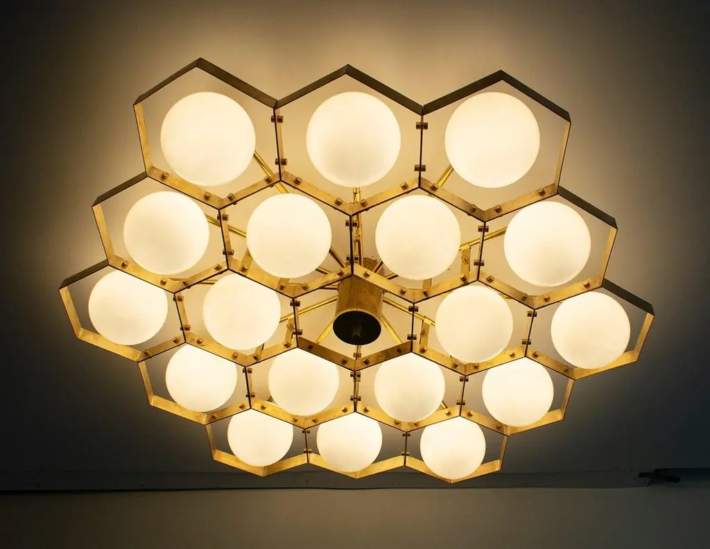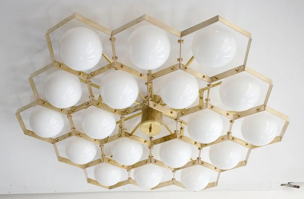Italian flush mount with Murano globes mounted on solid brass frame / Made in ItalyDesigned by Fabio Ltd, inspired by Angelo Lelli and Arredoluce styles18 lights / E12 or E14 type / max 40W each Diameter: 59 inches / Height: 11 inchesOrder only / This item ships from ItalyOrder Reference #: FABIOLTD HONEYCOMB FLUSH MOUNT 18The listed price applies to all Brass finishes : Unlacquered Natural Brass, Unlacquered Polished Brass, Lacquered Polished Brass, Lacquered Satin BrassOther finishes available with upcharge of $2,500: Bronzed, Polished Chrome, Satin Chrome, Polished Nickel, Satin Nickel, Polished Black Nickel, Satin Black Nickel, Polished Copper, Satin Copper