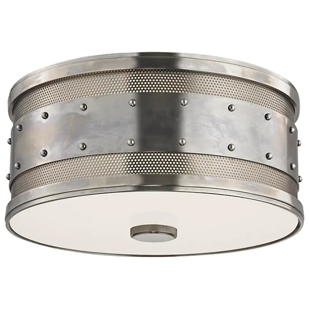 Two Light Flush Mount from Gaines collection in Historic Nickel finish. Number of Bulbs 2. Max Wattage 60.00 . No bulbs included. Our Gaines family applies industrial details such as studded rivets, perforated metalwork, and heavy brass extrusions to twenty-first century fixtures. Gaines offers a chance to add rich textural contrast and Machine Age intrigue to any space. No UL Availability at this time.