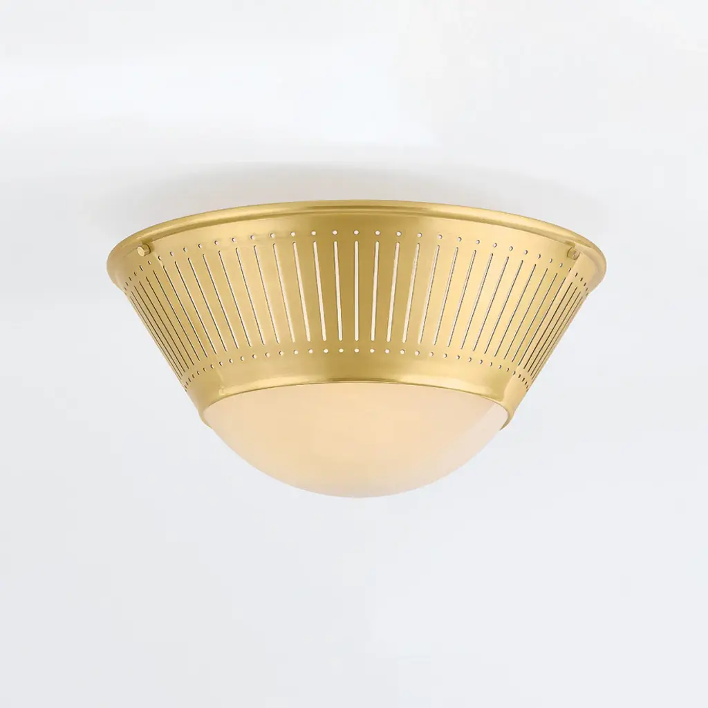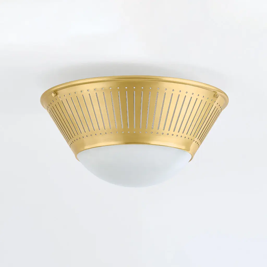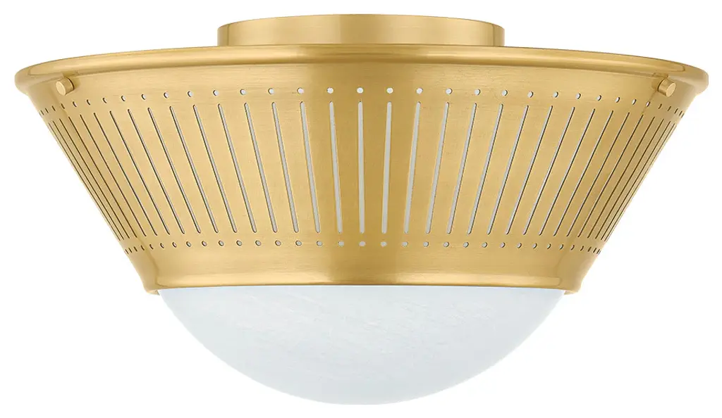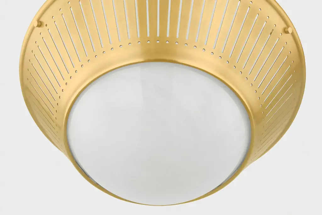 Inspired by the architecture of the Art Deco period, Elsmere makes the case for replacing can lights with a more elevated ceiling fixture. This beautiful flush mount is finished in Aged Brass with decorative perforations that allow light to escape. Even with the metalwork''s edge, the rounded cloud glass shade forms a sun-like visual, with the perforations mimicking rays of light.
