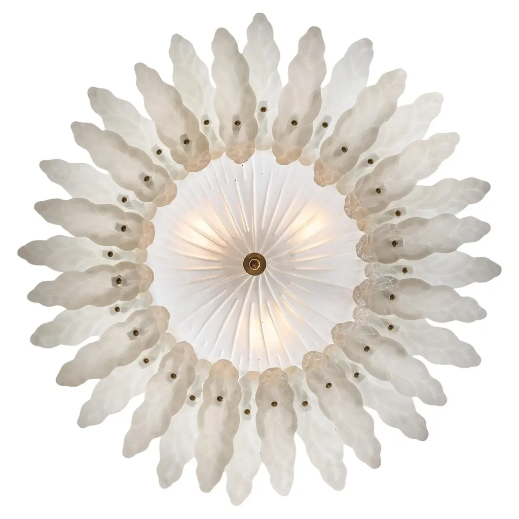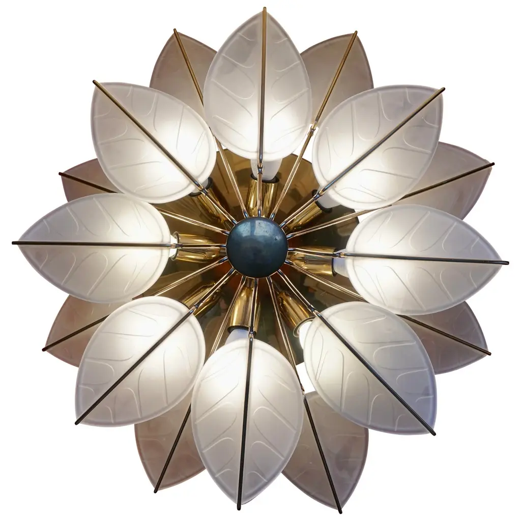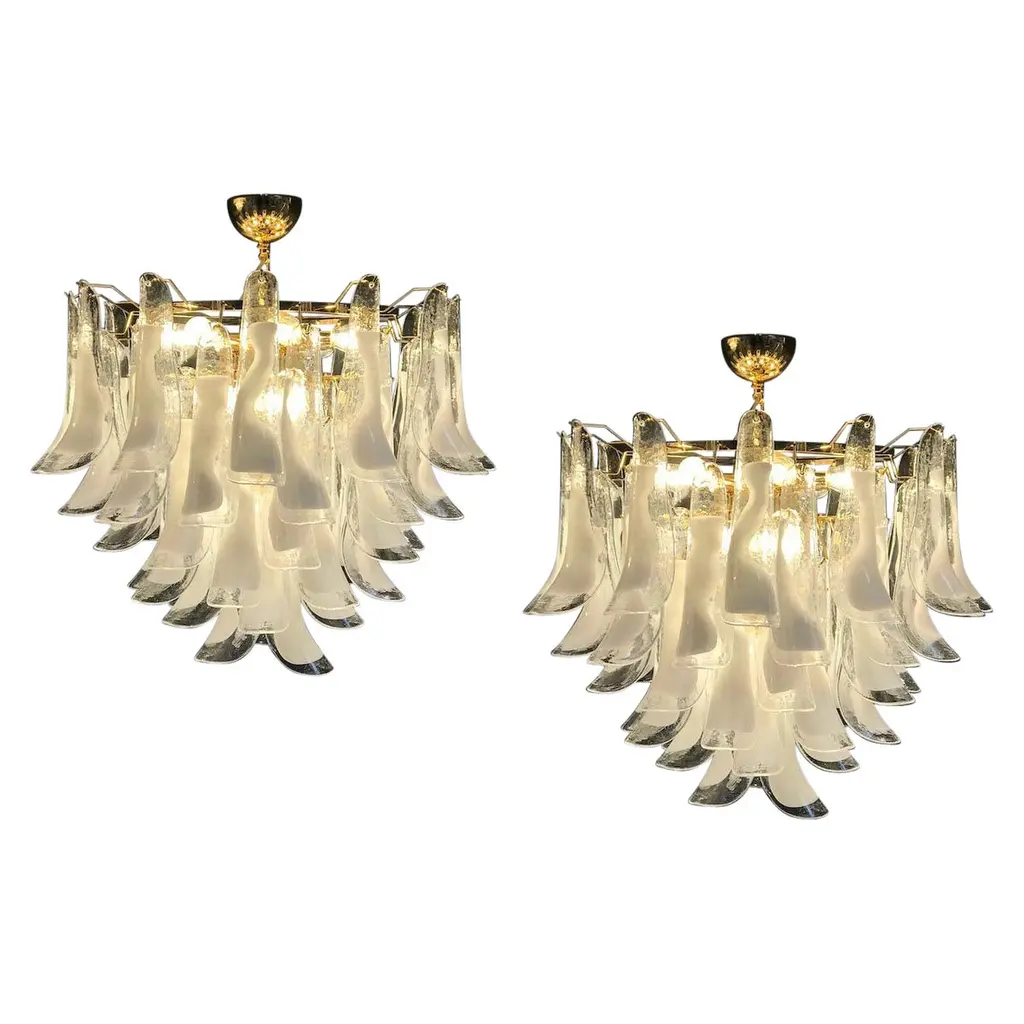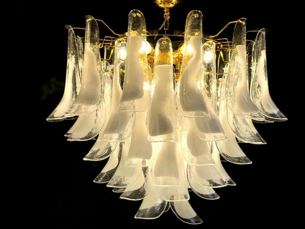 Amazing Italian murano glass chandelier made by clear / white "lattimo" murano glass petals.By Veneziani Arte.Frame available chrome or gold 24-karatDimensions: H- 21.2 inches (55 cm) height without chain using as a ceiling light or flush mount.Diameter 29 inches (75 cm)Chandelier with customizable chain and canopy 43 inches (110 cm) heightDimension glasses 11.40 inches (29 cm) height, 3.15 inches (8 cm) maximum width.Weight: 57.5 lb (40 kg.)Nine E 27 light bulbs suitable for the American electrical system. Price \ item. This light fixture can be disassembled and the glasses individually wrapped for easy transport. We will deliver professionally packed in a wooden case.??