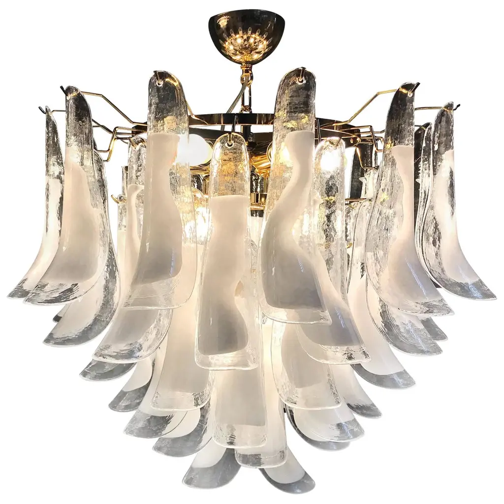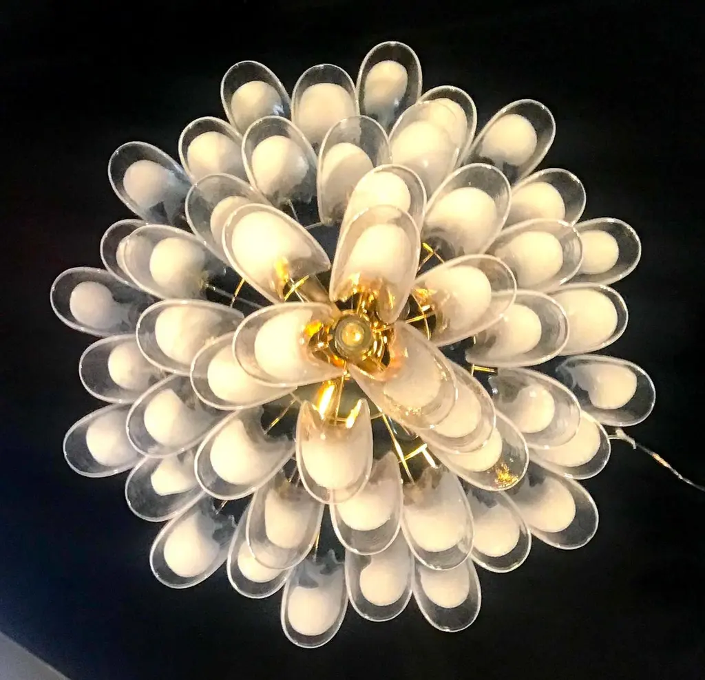 Amazing Italian murano glass chandelier made by clear/white "lattimo" murano glass petals.By Galleria Veneziani.Frame available chrome or gold 24-karatDimensions: H- 21.2 inches (55 cm) height without chain using as a ceiling light or flush mount.Diameter 29 inches (75 cm)Chandelier with customizable chain and canopy 43 inches (110 cm) heightDimension glasses 11.40 inches (29 cm) height, 3.15 inches (8 cm) maximum width.Weight: 57.5 lb (40 kg.)Nine E 27 light bulbs suitable for the American electrical system. Price \ item.