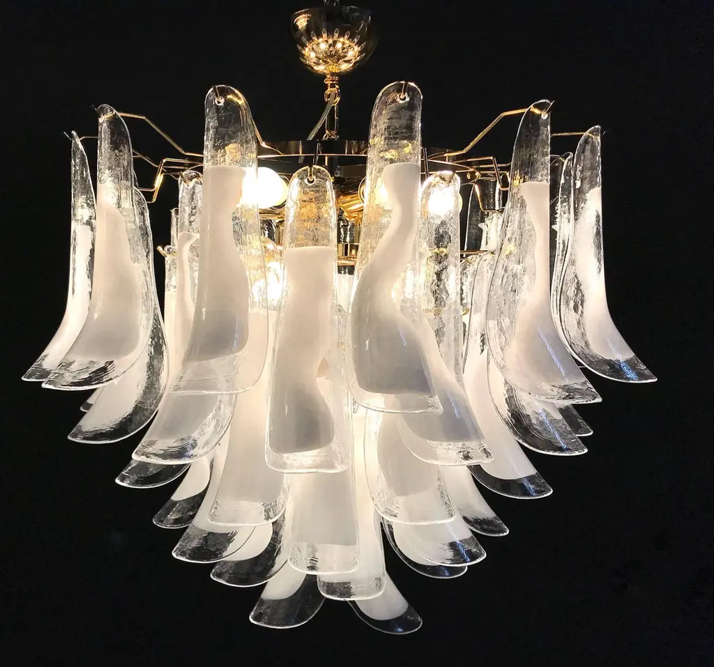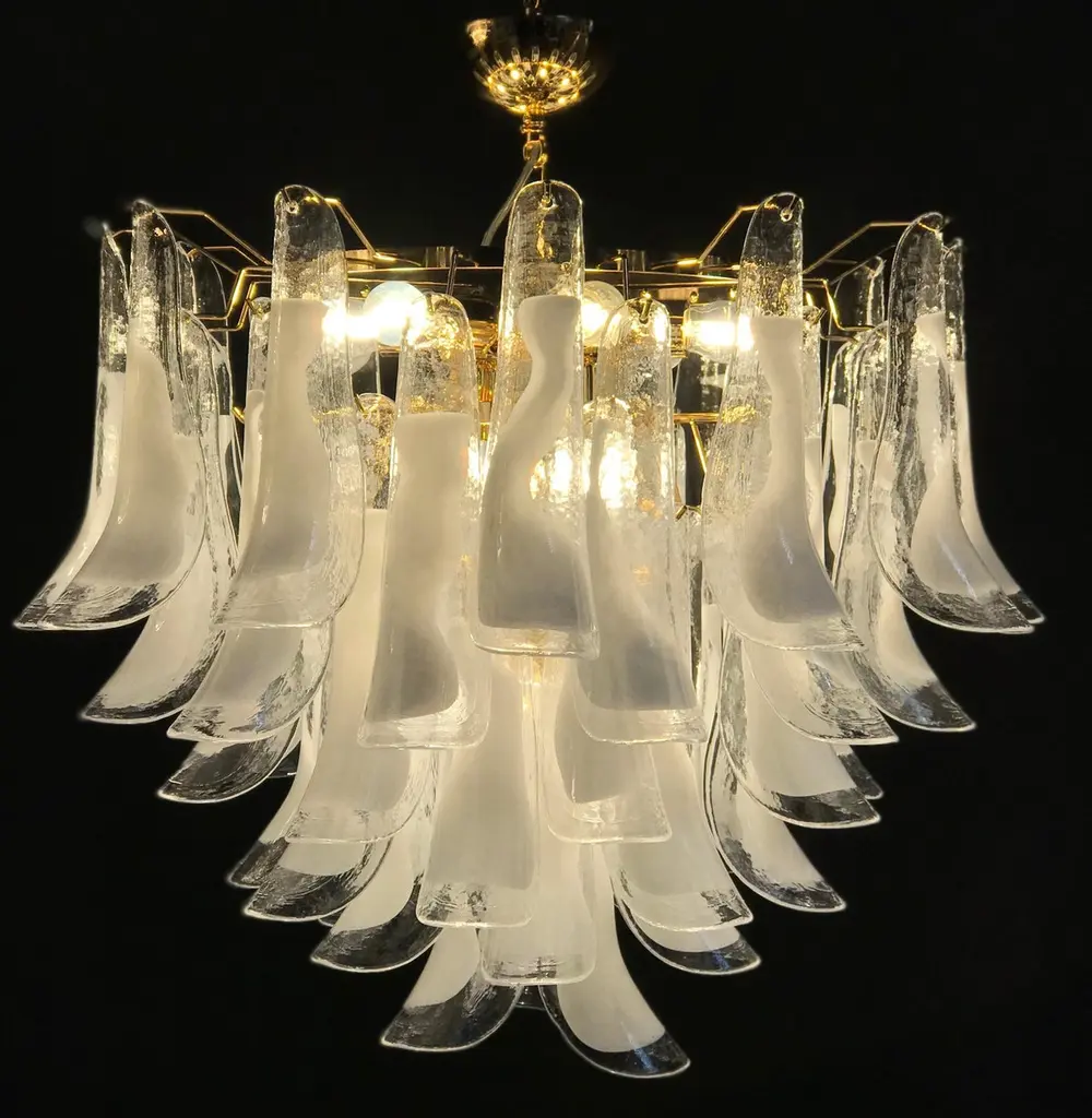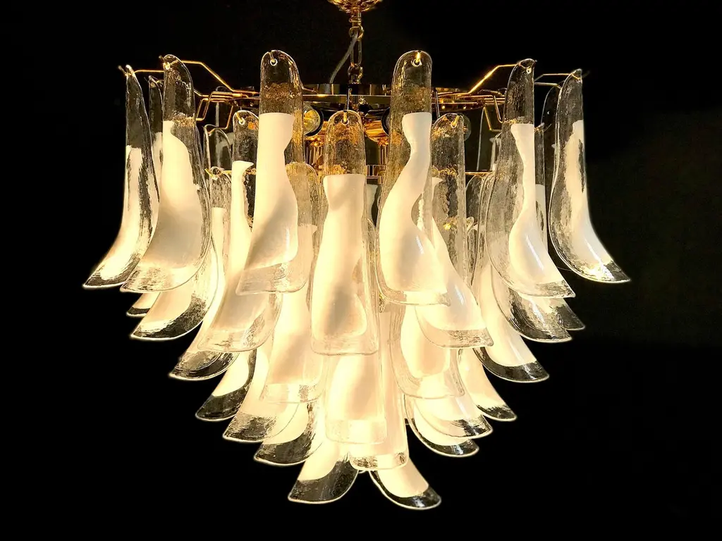 Amazing Italian murano glass chandelier made by clear / white "lattimo" murano glass petals.By Veneziani Arte. Frame available chrome or gold 24-karatDimensions: H- 21.2 inches (55 cm) height without chain using as a ceiling light or flush mount.Diameter 29 inches (75 cm)Chandelier with customizable chain and canopy 43 inches (110 cm) heightDimension glasses 11.40 inches (29 cm) height, 3.15 inches (8 cm) maximum width.Weight: 57.5 lb (40 kg.)Nine E 27 light bulbs suitable for the American electrical system.Price \ item. This light fixture can be disassembled and the glasses individually wrapped for easy transport. We will deliver professionally packed in a wooden case.