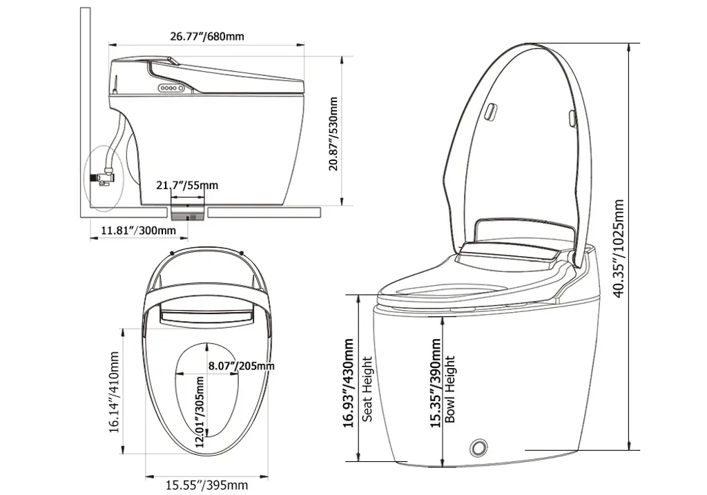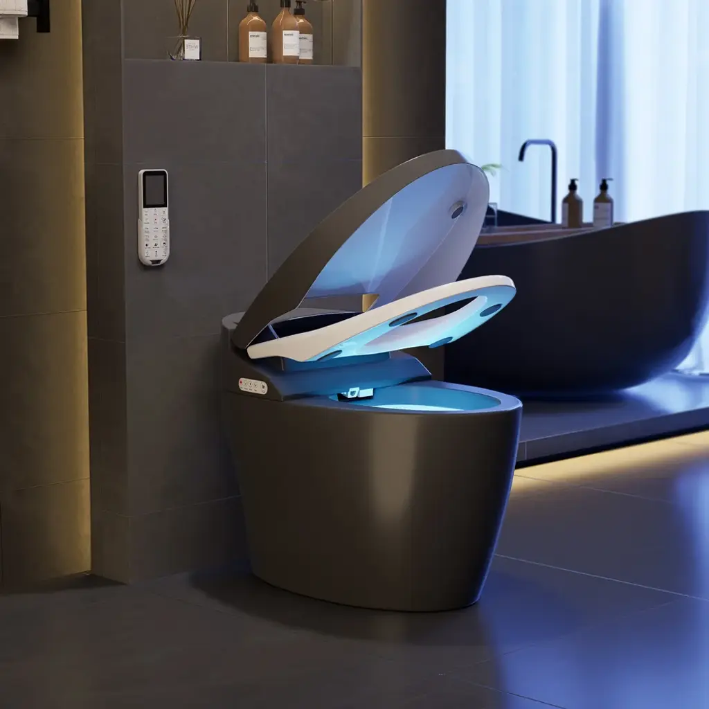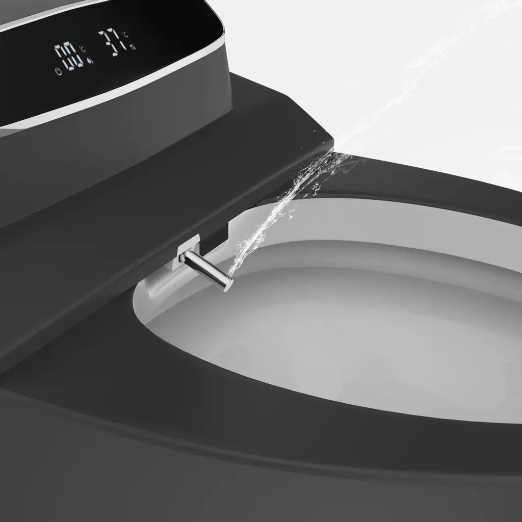 Give your bathroom a boost with this sleek-looking black, floor-mount, elongated smart bidet toilet. From convenience to comfort at its highest level, amenities include a heated seat, a self-cleaning bidet wand, and adjustable water pressure, temperature, and drying options. With the addition of an automatic open/close lid and the soft-close feature, it becomes even more usable. Water usage is effective with the 1.28 GPF siphon jet flush. Featuring built-in night lighting and a concealed trapway in its design, this toilet blends luxury with practicality for a streamlined, modern look for any bathroom.