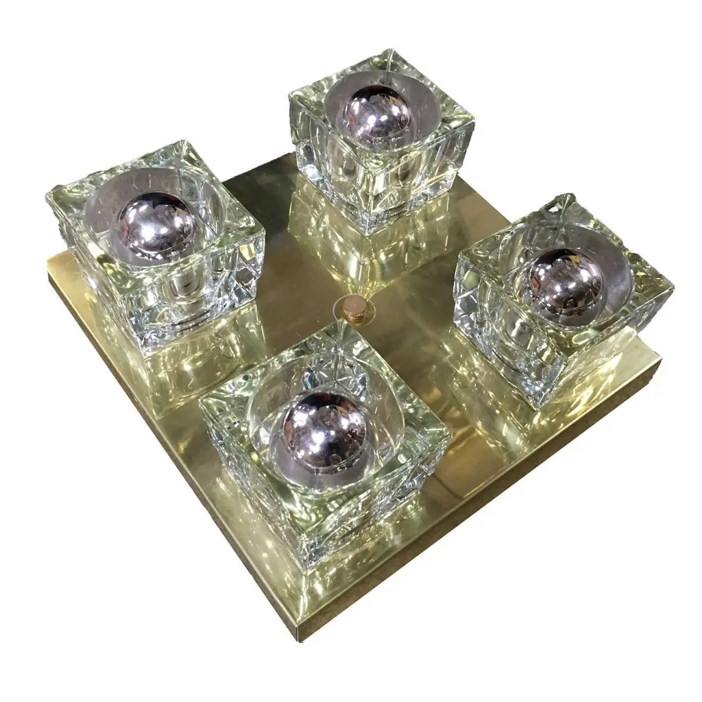 A mid-century flush mount "Ice Cubes" ceiling light fixture by Gaetano Sciolari for Lightolier featuring brass plates with four thick beveled ice block glass shades.Circa 1960s, USA.2- Available