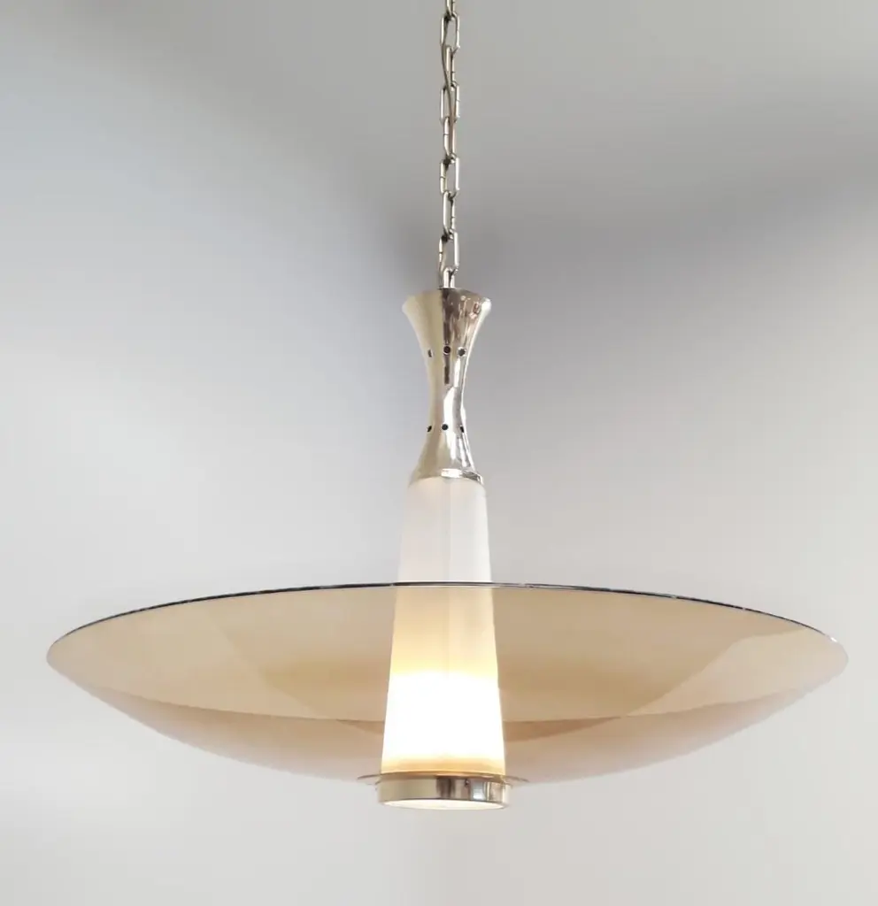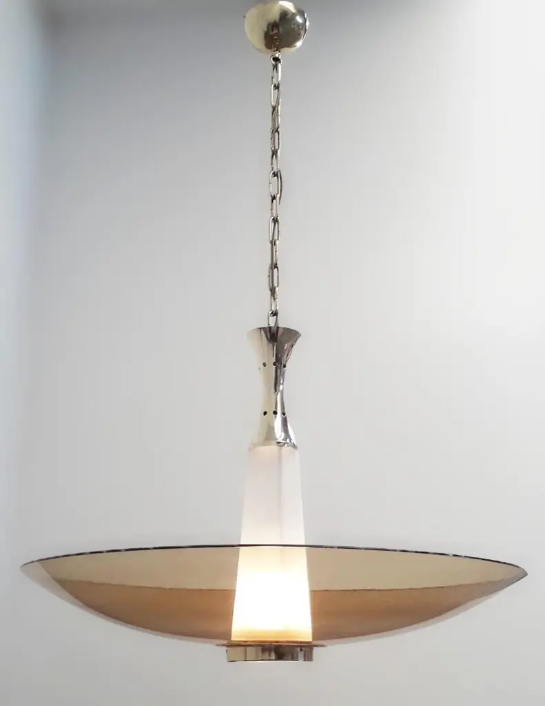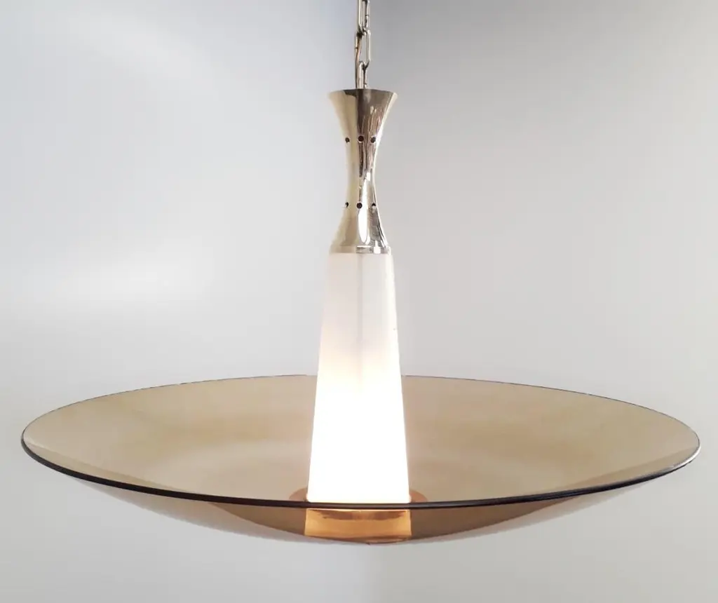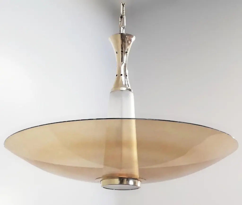 Italian modern chandelier or flushmount shown with smoked amber curved glass shade with a beveled edge and frosted conical glass, mounted on solid polished brass hardware / Made in Italy1 light / E26 or E27 type / max 150WMeasures: Diameter 30 inches, height 22 inches not including chain and canopyOrder only / This item ships from ItalyOrder reference #: FABIOLTD C529