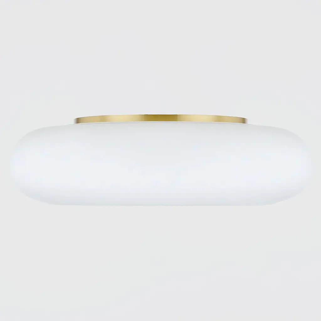 An LED allows Imani's soft, cloud-like form to make a big impact close to the ceiling. A metal button in Aged Brass or Polished Nickel at the center breaks up the large, rounded silhouette. This low profile flush mount is an obvious choice in hallways or bathrooms, but works well on lower ceilings and smaller spaces throughout the home.