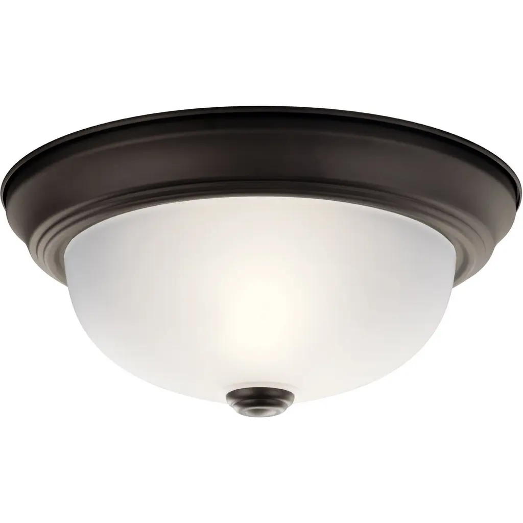 The current and pleasing lines of this flush mount ceiling fixture done in Brushed Nickel finish with Satin-Etched Glass will blend into many decors. 2-Light, 6-W Max. (M). Diameter 11 1/2in., Height 6 1/2in..