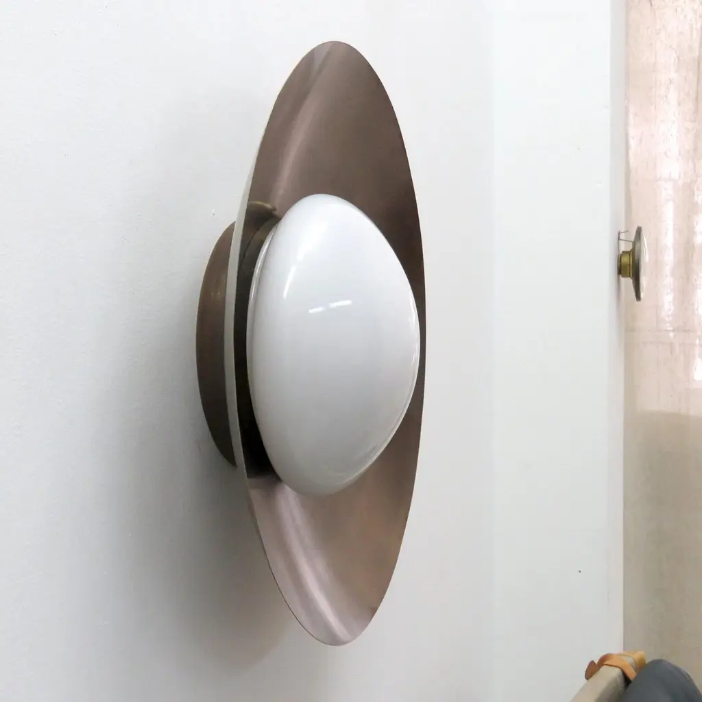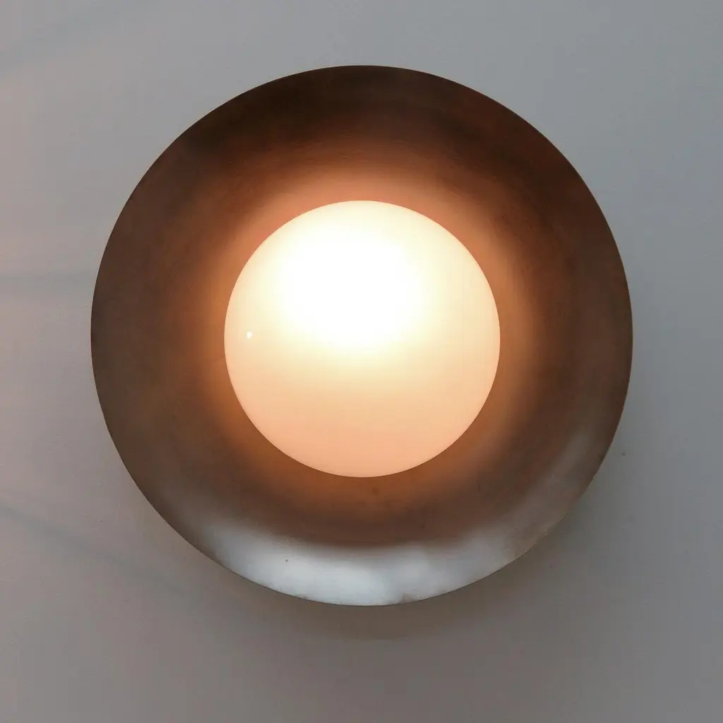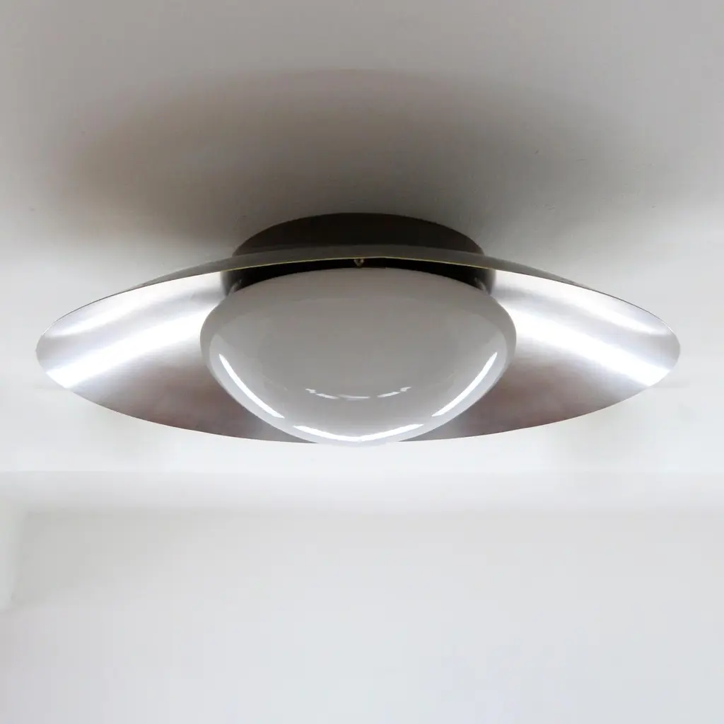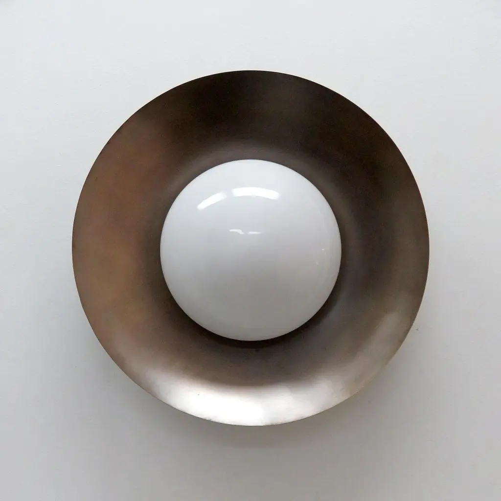 Elegant Iowa flush mount light designed by Gallery L7, handcrafted and finished in Los Angeles from American brass, with an opaline glass shade on an aged raw brass perforated disc. One E26 socket per fixture, max. wattage 60w or 3-7w LED equivalent, wired for US standards or European standards (110v/220v), bulb provided as a onetime courtesy (US only). UL listing available upon request for an additional charge. Multiples available.