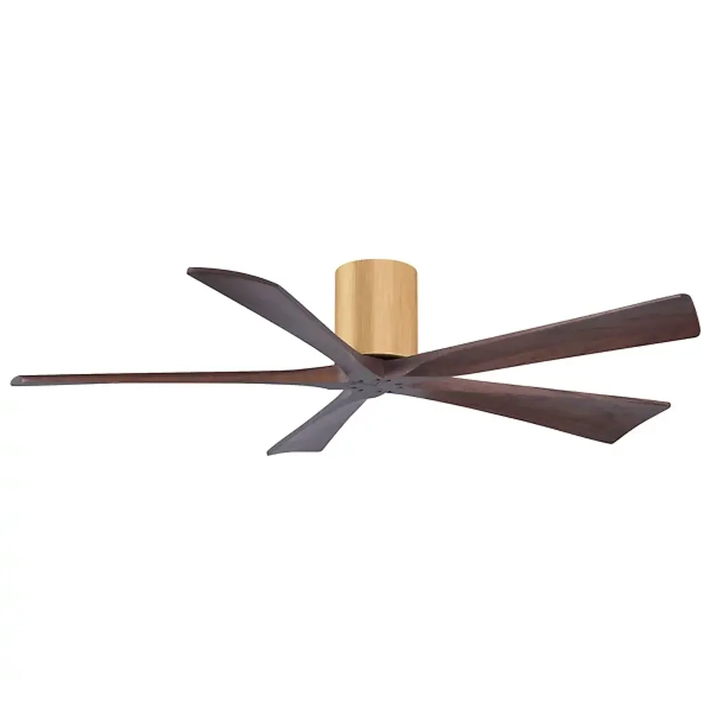 Enjoy the golden age of aviation without the sacrifice of modern technology with the Atlas by Matthews Fan Co. Irene-H Flush Mount 5 Blade Ceiling Fan. Wide paddle-style fan blades recall the style of classic planes, while it's flushmount style efficient 6-speed DC motor has incredible airflow for every watt. The Irene-H Flushmount 5 Blade Ceiling Fan's wood tone matches with the simple cylinder body, bringing a dynamic contradiction to the whole fan.