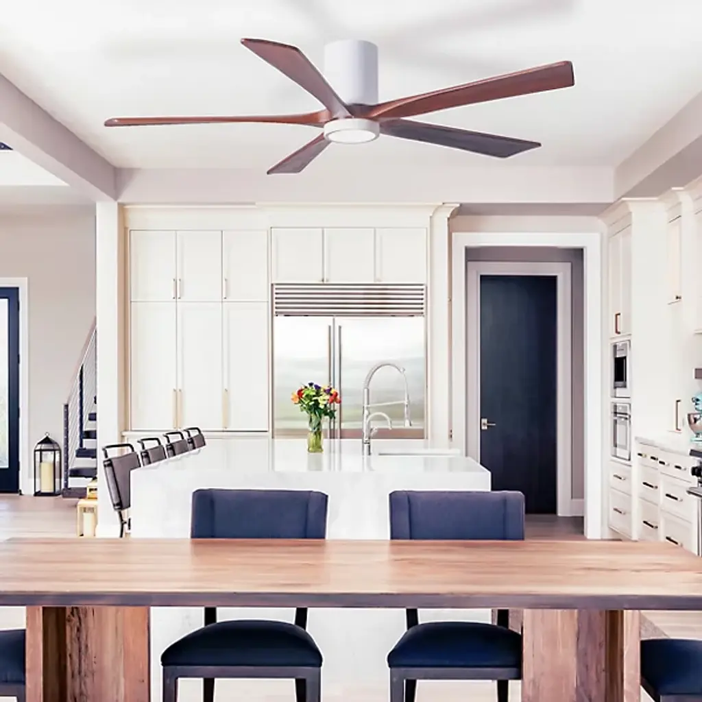 Enjoy the golden age of aviation without the sacrifice of modern technology with the Atlas by Matthews Fan Co. Irene-H Flush Mount 5 Blade Ceiling Fan. Wide paddle-style fan blades recall the style of classic planes, while it's flushmount style efficient 6-speed DC motor has incredible airflow for every watt. The Irene-H Flushmount 5 Blade Ceiling Fan's wood tone matches with the simple cylinder body, bringing a dynamic contradiction to the whole fan.