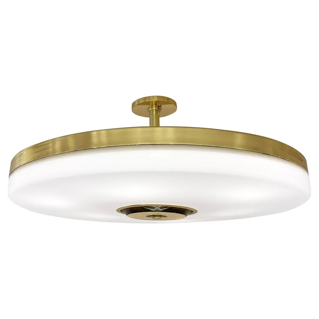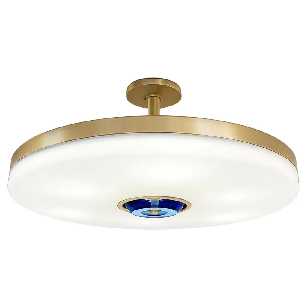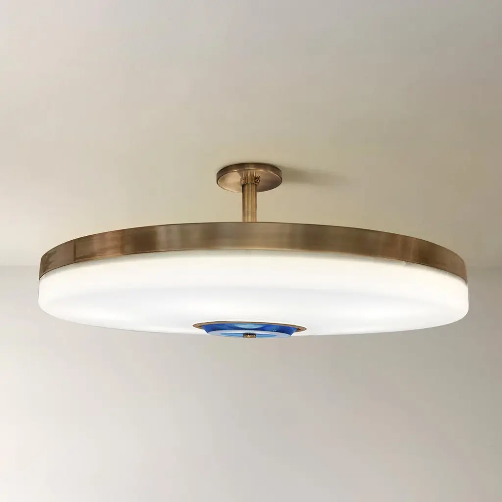 The Iris ceiling light is designed around an expansive acrylic shade with a hand carved glass center. This versatile fixture can be installed as a pendant on a stem or as a true flush mount. The first images show the fixture in our Bronzo Ottone (Bronze) finish-subsequent pictures show it in a selection of alternative finishes. Starts at $7,200.00 in polished or satin brass. With premium finishes the price is $7,800.00. See the Iris Classico for the 25.5” size and Iris Piccolo for the 18”. For multi-light models see the Iris N.2, Iris N.3 and Iris N.5.Customization Options:Each fixture is hand crafted in Italy and is available in any of our 10 finishes and 8 enamel colors. Compatible with our 5 carved glass colors. Can be installed as a flush mount or on a stem.Lead Time: 10-12 weeks plus shipping. Diameter: 32”Height: Minimum 5” + stem if needed.Electrical: Six E12 base LED bulbs up to 40W. UL Listed.Model#: LTZ743C.
