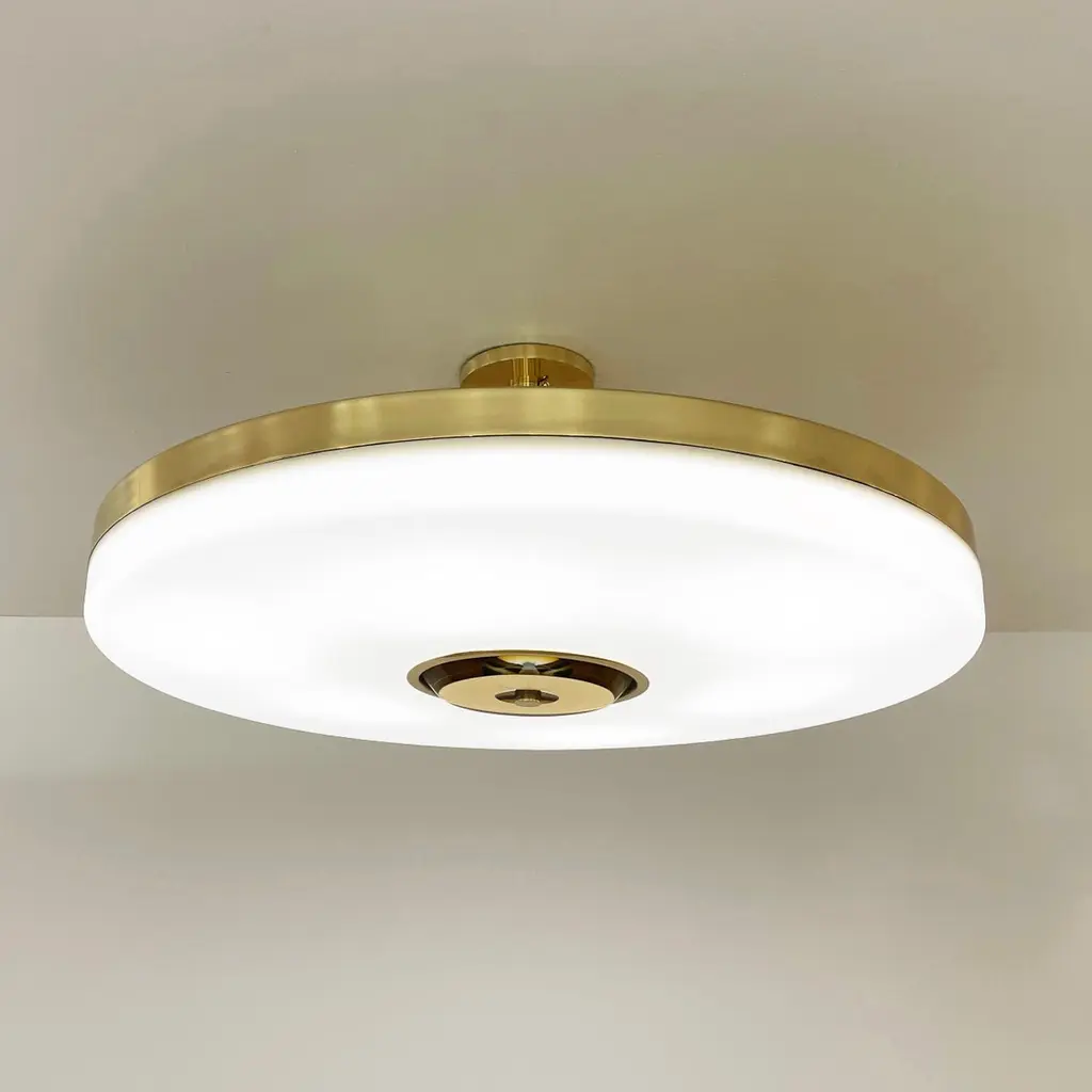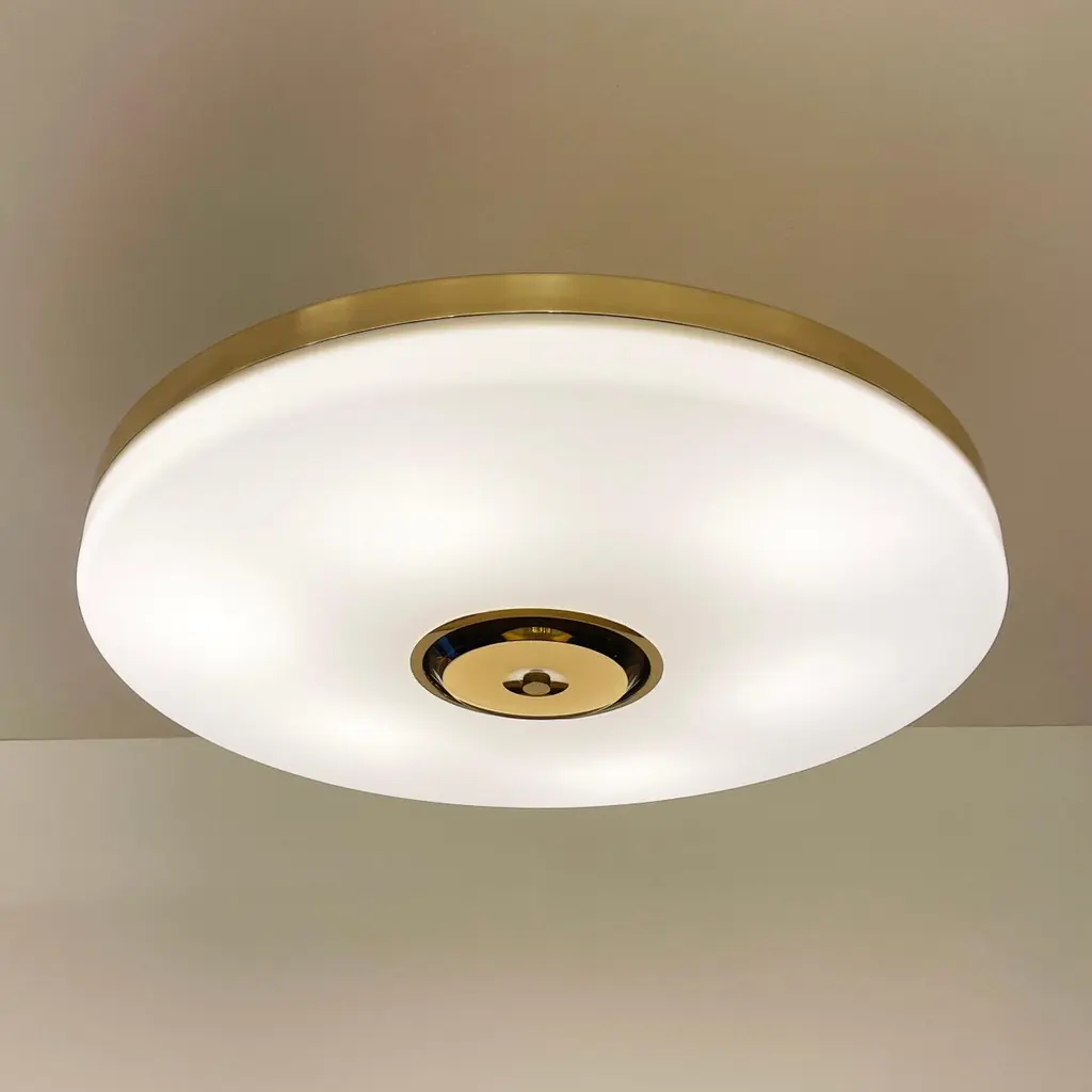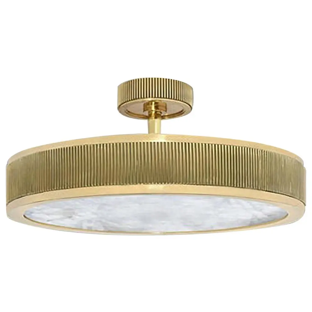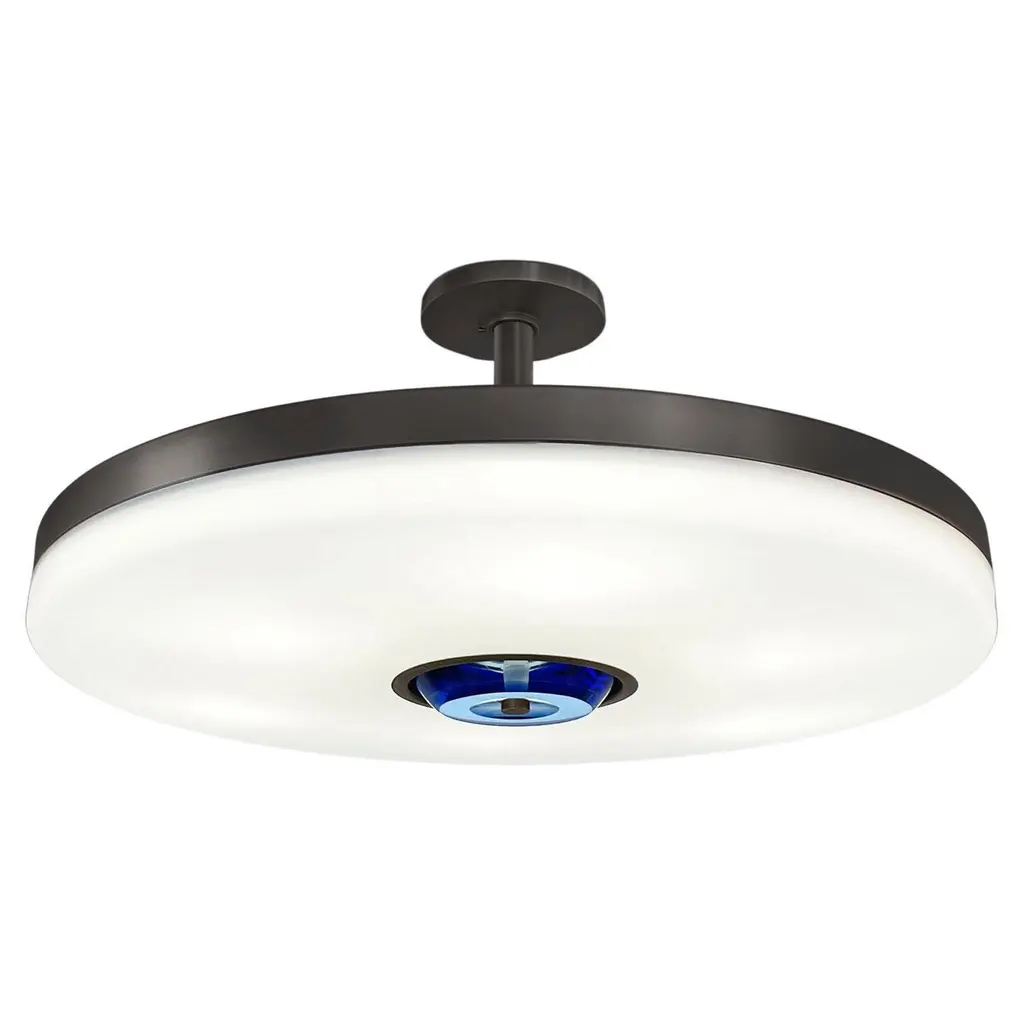 The Iris ceiling light is designed around an expansive acrylic shade with a hand carved glass center. This versatile fixture can be installed as a pendant on a stem or as a true flush mount. The first images show the fixture in our Bronzo Ottone (Bronze) finish-subsequent pictures show it in a selection of alternative finishes. Starts at $7,200.00 in polished or satin brass. With premium finishes the price is $7,800.00. See the Iris Classico for the 25.5” size and Iris Piccolo for the 18”. For multi-light models see the Iris N.2, Iris N.3 and Iris N.5.Customization Options:Each fixture is hand crafted in Italy and is available in any of our 10 finishes and 8 enamel colors. Compatible with our 5 carved glass colors. Can be installed as a flush mount or on a stem.Lead Time: 10-12 weeks plus shipping. Diameter: 32”Height: Minimum 5” + stem if needed.Electrical: Six E12 base LED bulbs up to 40W. UL Listed.Model#: LTZ743C.
