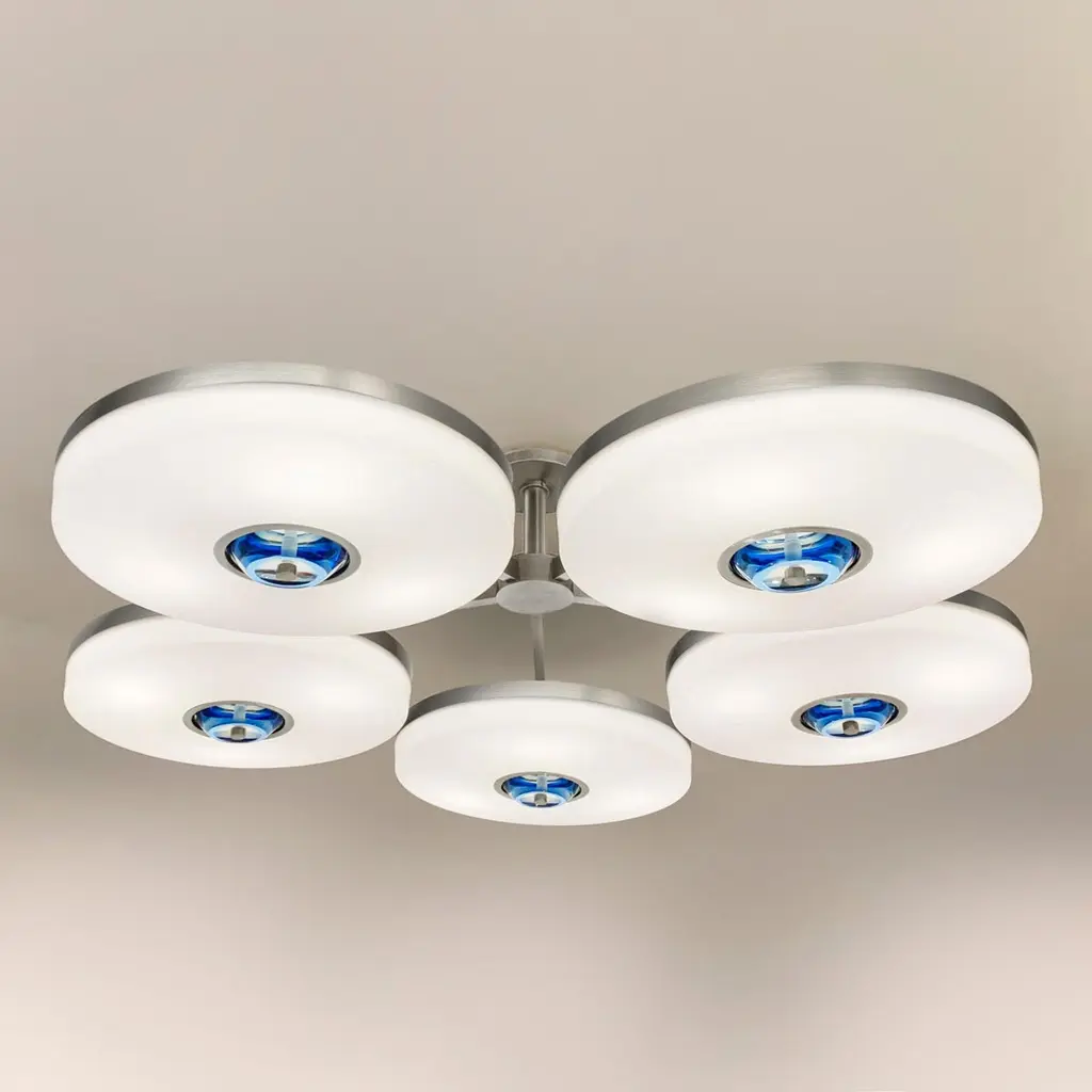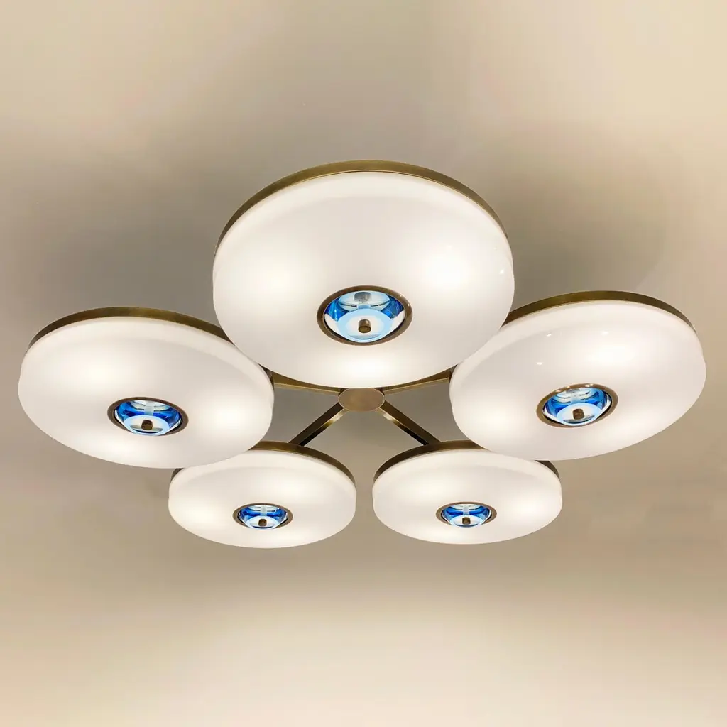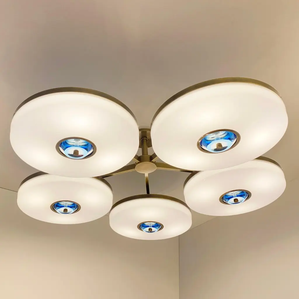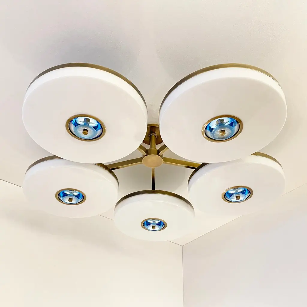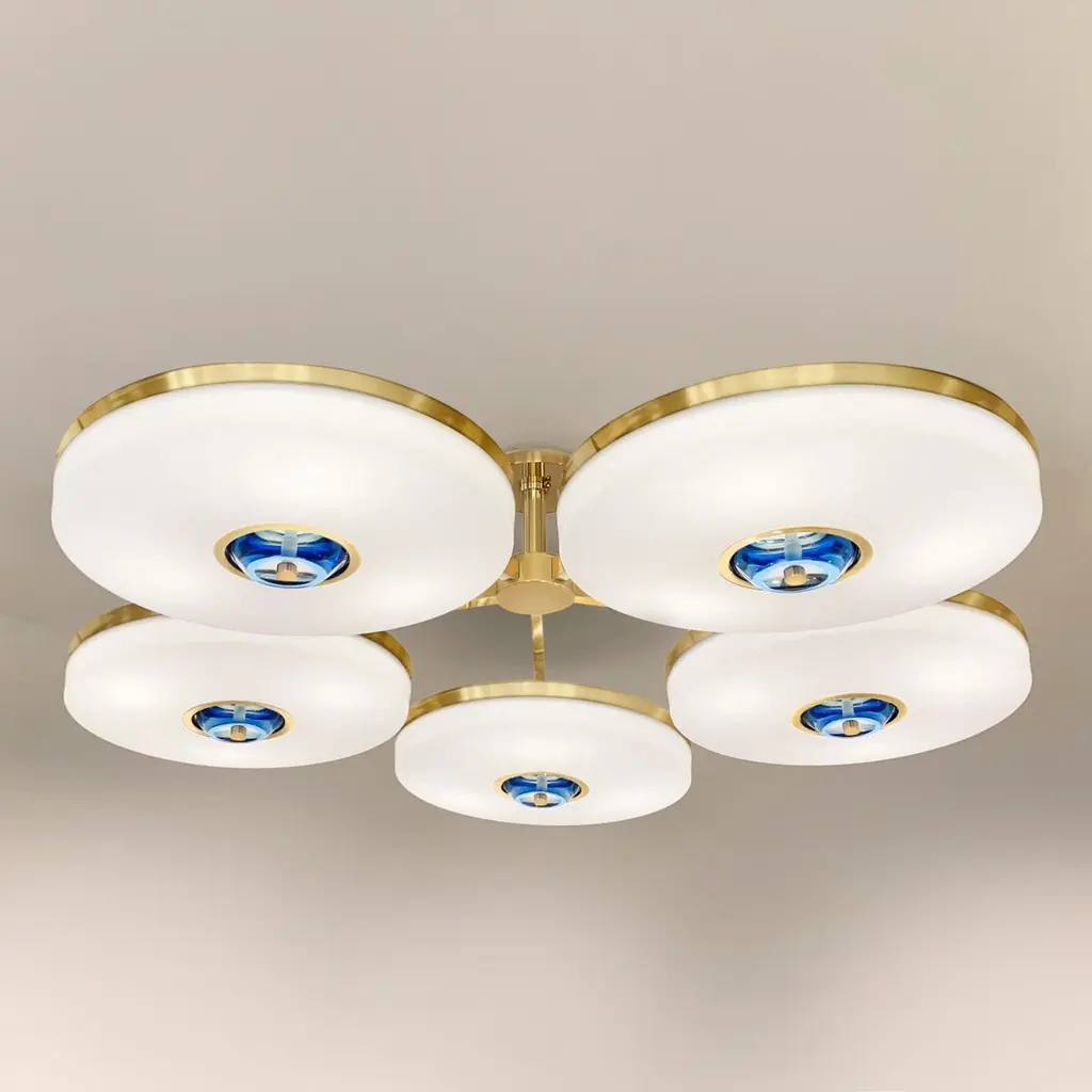 The Iris N.5 ceiling light is designed around five expansive acrylic shades with hand carved glass centers. This versatile fixture can be installed on a stem or as a flush mount. The first images show the fixture in our Bronzo Ottone (bronze) finish-subsequent pictures show it in a selection of alternative finishes. Starts at $18,900.00 in polished and satin brass. With upgraded finishes the price is $20,800.00. For more configurations see the Iris, Iris Piccolo, Iris N.2 and Iris N.3.Customization Options:Each fixture is hand crafted in Italy and can be customized in size, layout and number of shades. Available in any of our 10 finishes and 8 enamel colors. Compatible with our carved glass. Can be installed as a flush mount or on a stem.Lead Time: 10-12 weeks plus shipping.Measures: Diameter: 52”Height: Minimum 7” - stem height as requestedElectrical: Fifteen E12 40W incandescent or 75W LED equivalentModel#: LTZ900.