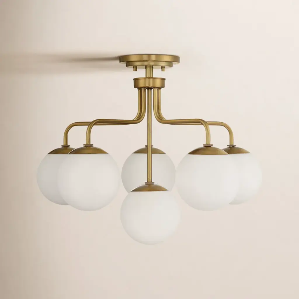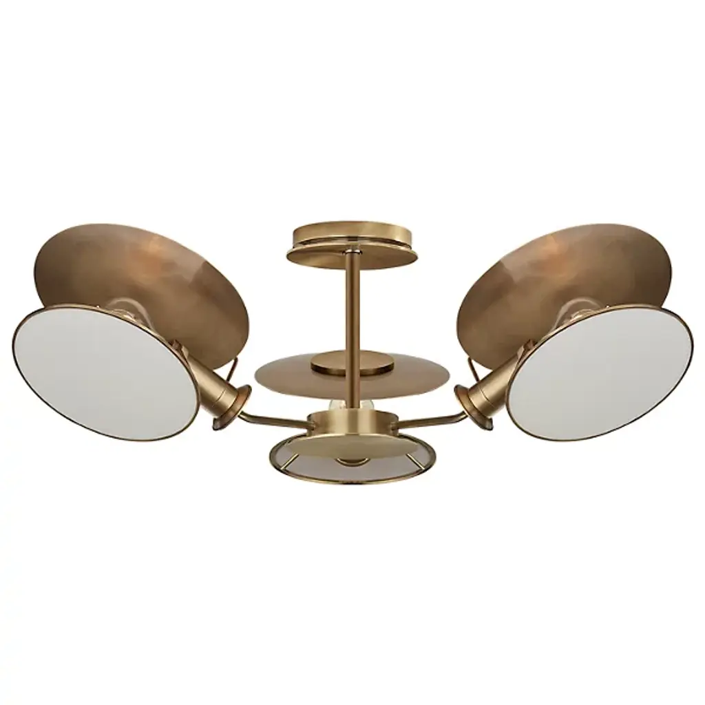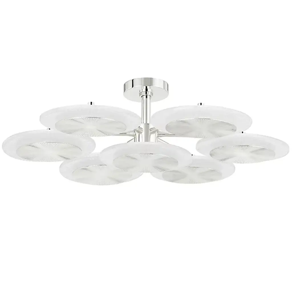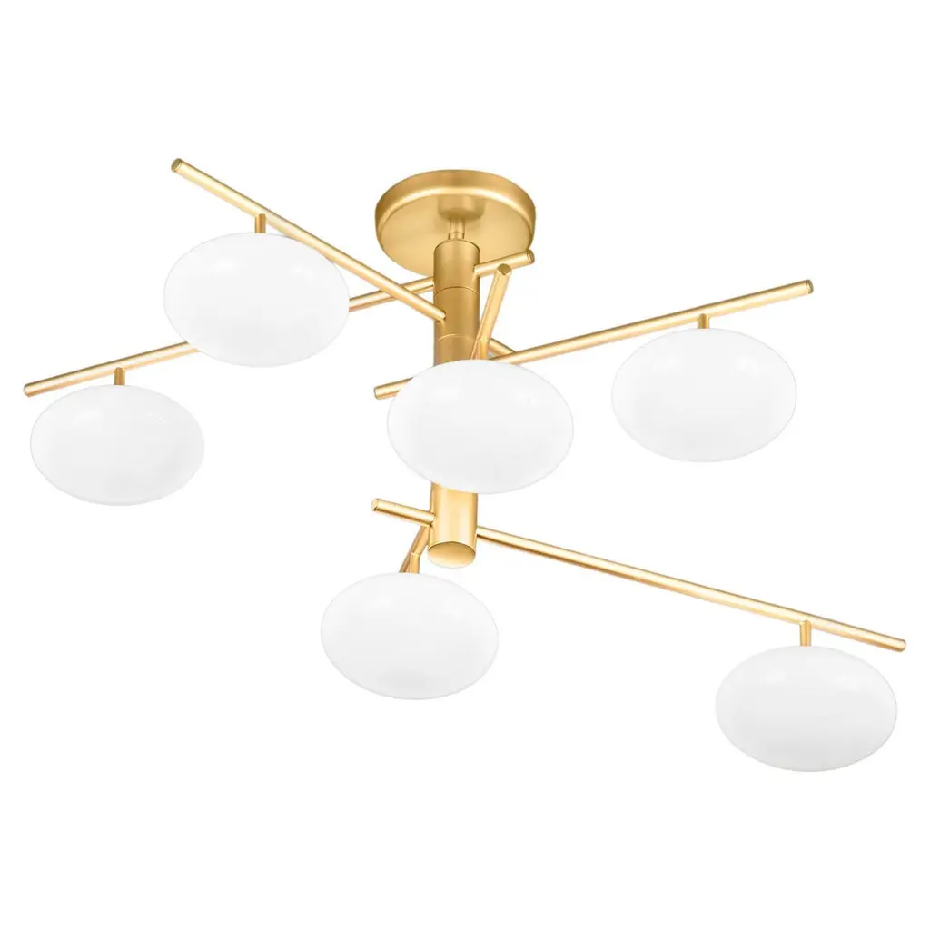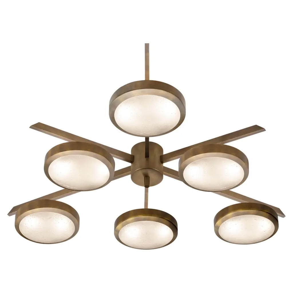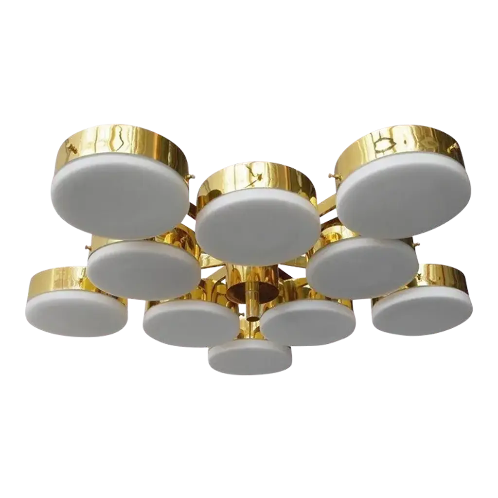 The Iris N.5 ceiling light is designed around five expansive acrylic shades with hand carved glass centers. This versatile fixture can be installed on a stem or as a flush mount. The first images show the fixture in our Bronzo Ottone (bronze) finish-subsequent pictures show it in a selection of alternative finishes. Starts at $18,900.00 in polished and satin brass. With upgraded finishes the price is $20,800.00. For more configurations see the Iris, Iris Piccolo, Iris N.2 and Iris N.3.Customization Options:Each fixture is hand crafted in Italy and can be customized in size, layout and number of shades. Available in any of our 10 finishes and 8 enamel colors. Compatible with our carved glass. Can be installed as a flush mount or on a stem.Lead Time: 10-12 weeks plus shipping.Measures: Diameter: 52”Height: Minimum 7” - stem height as requestedElectrical: Fifteen E12 40W incandescent or 75W LED equivalentModel#: LTZ900.