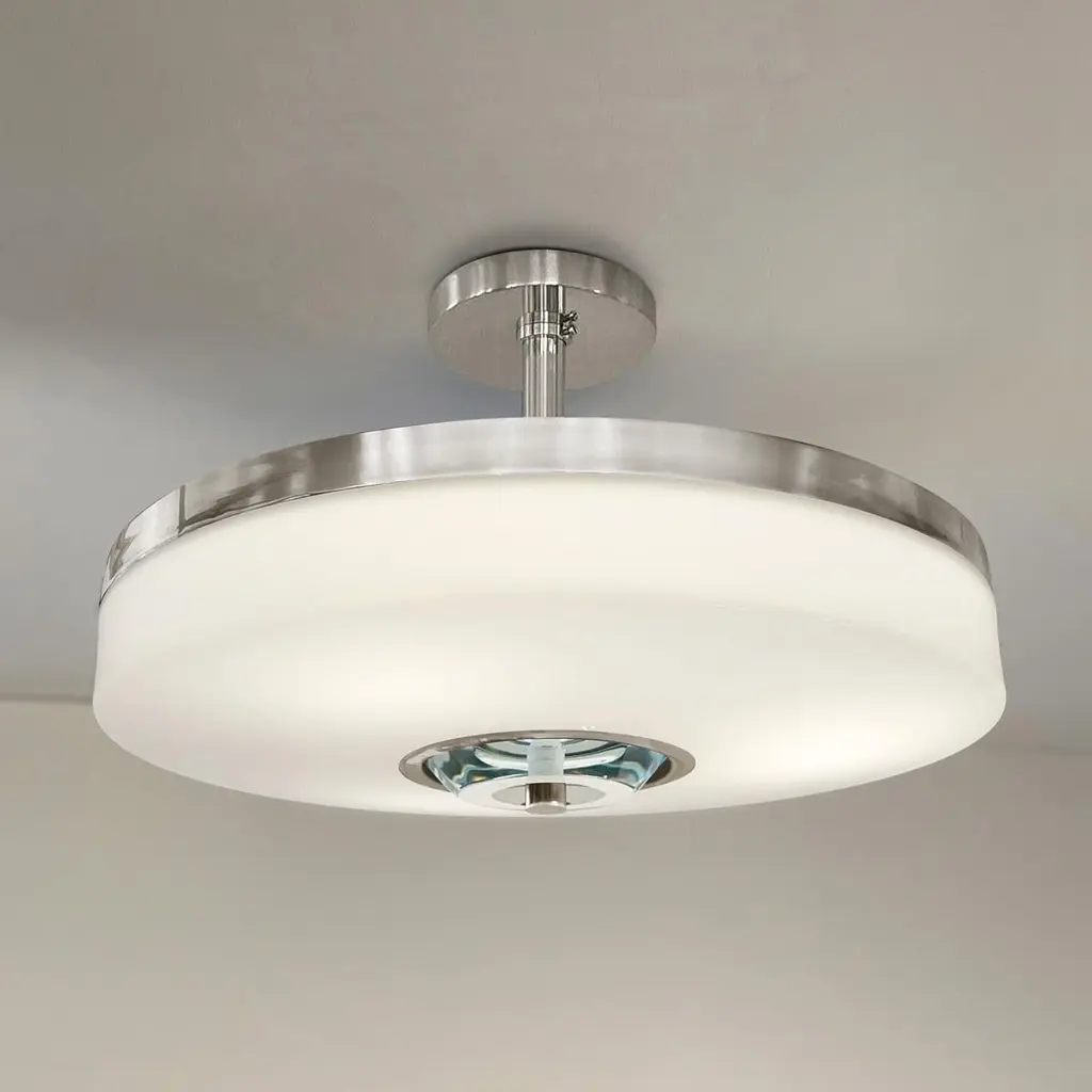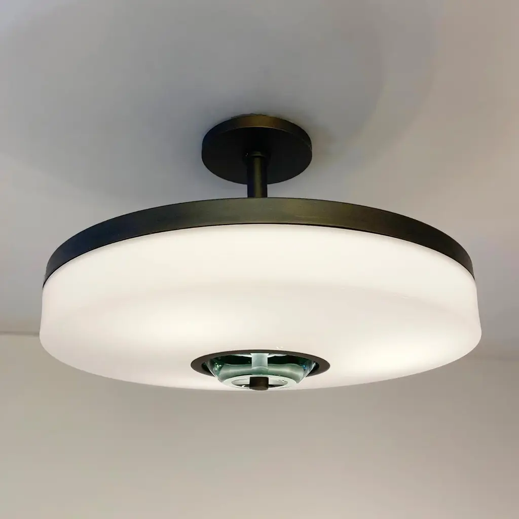 The Iris Piccolo ceiling light is designed around an acrylic shade with a hand carved glass center. This versatile fixture can be installed as a pendant on a stem or as a true flush mount. The first images show the fixture in our Brunito Nero (Black Bronze) finish-subsequent pictures show it in a selection of alternative finishes. Starts at $4,000.00 in polished or satin brass. With premium finishes the price is $4,400.00. For more configurations see the Iris, Iris N.2, Iris N.3 and Iris N.5.Customization Options:Each fixture is hand crafted in Italy and is available in any of our 10 finishes and 8 enamel colors. Compatible with our carved glass. Can be installed as a flush mount or on a stem.Lead Time: 10-12 weeks plus shipping.Diameter: 18”Height: Minimum 5”- stem height as requestedElectrical: Three E12 base LED bulbs up to 40W. UL Listed.Model#: LTZ743B.