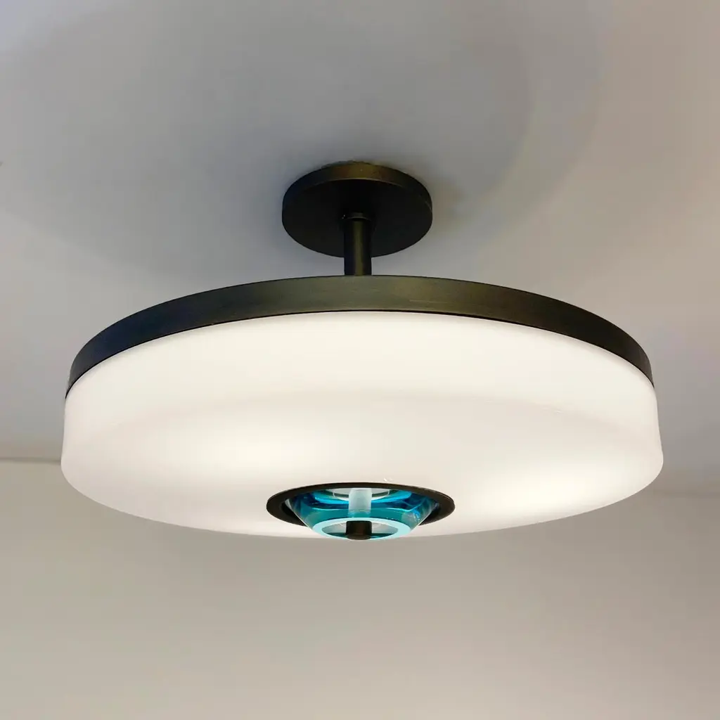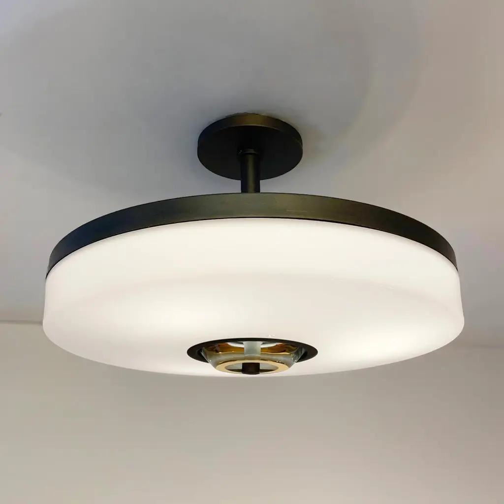 The Iris Piccolo ceiling light is designed around an expansive acrylic shade with a hand carved glass center. This versatile fixture can be installed as a pendant on a stem or as a true flush mount. Shown in our Brunito Nero finish. Price listed for stock model in polished brass. For more configurations see the Iris, Iris N.2, Iris N.3 and Iris N.5.Customization options:Each fixture is hand crafted in Italy and is available in any of our 10 finishes and 8 enamel colors. Compatible with our carved glass. Can be installed as a flush mount or on a stem.Lead Time: 10-12 weeks plus shipping.Diameter: 18”Height: Minimum 5”- stem height as requested.Electrical: Three E12 base LED bulbs up to 40W. UL Listed.Model#: LTZ743B