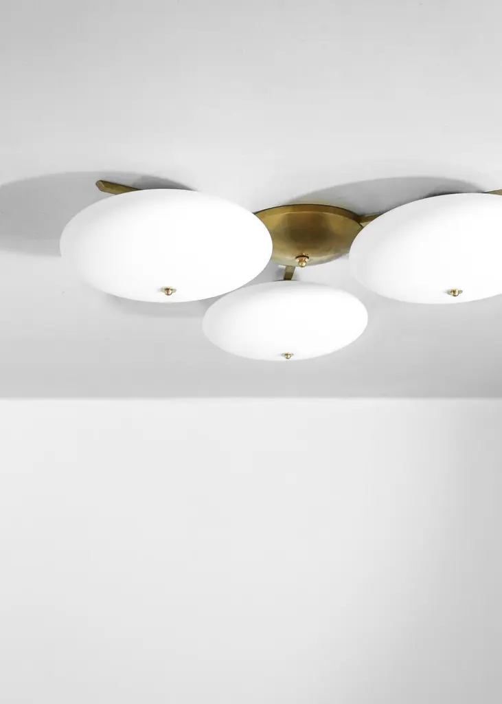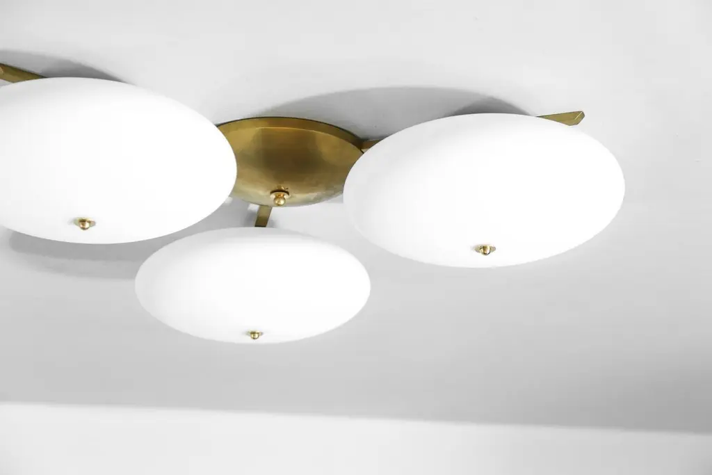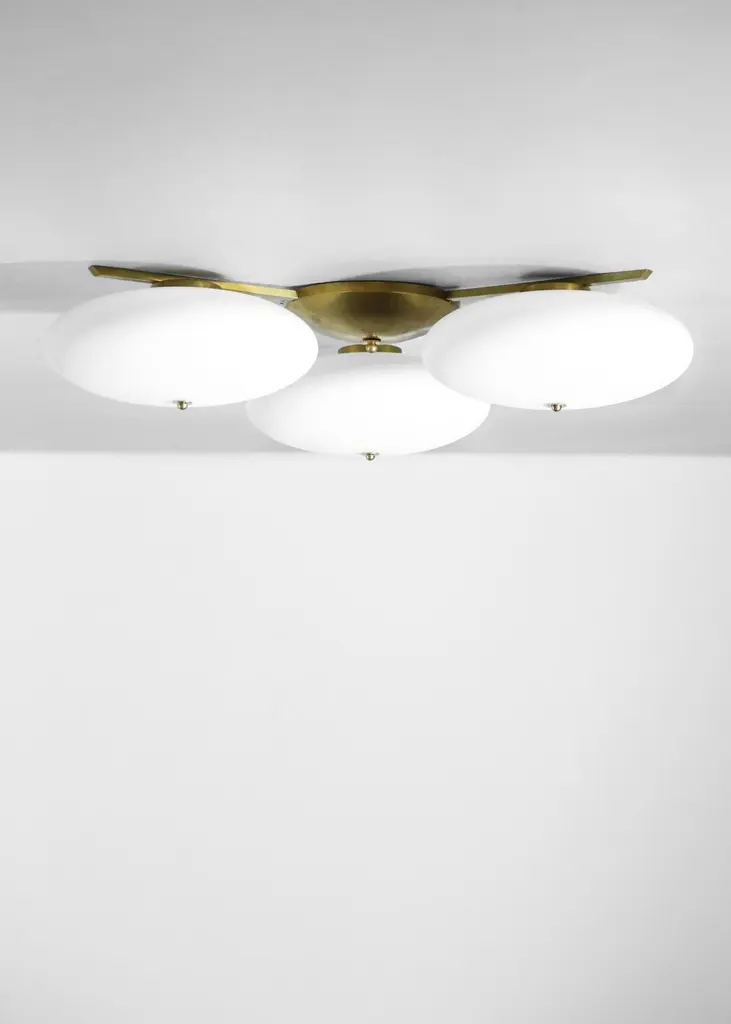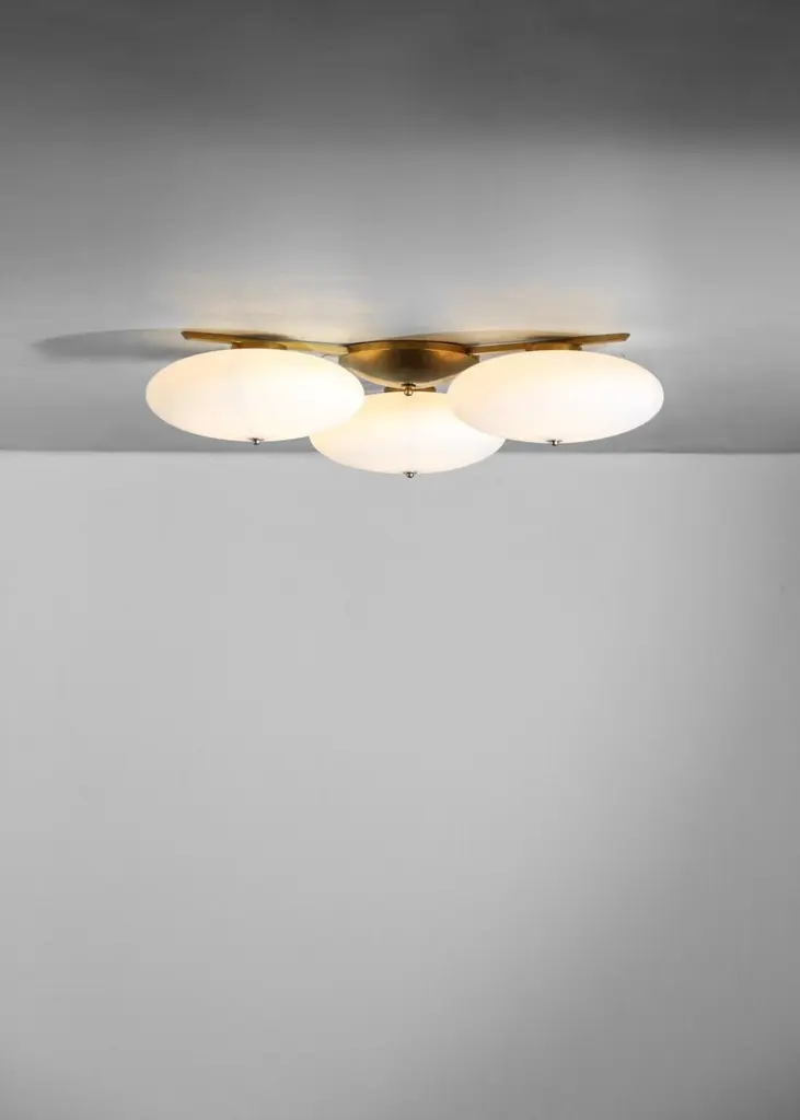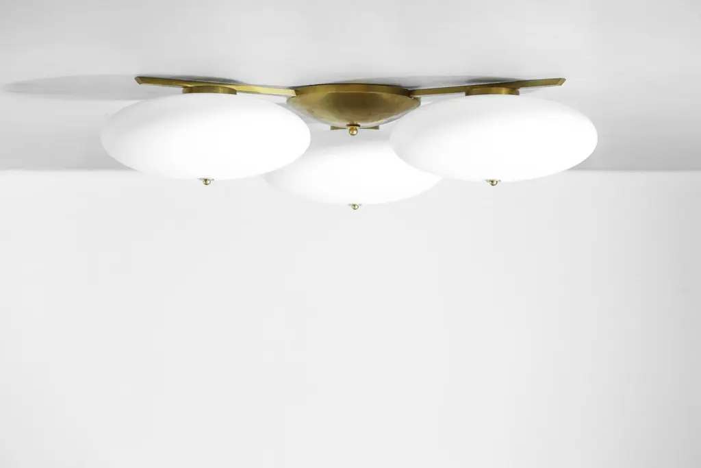 Modern flush mount "Pia" in the style of Angelo Lelli composed of three opaline glass with brass structure. Bulbs LED E27 recommended.