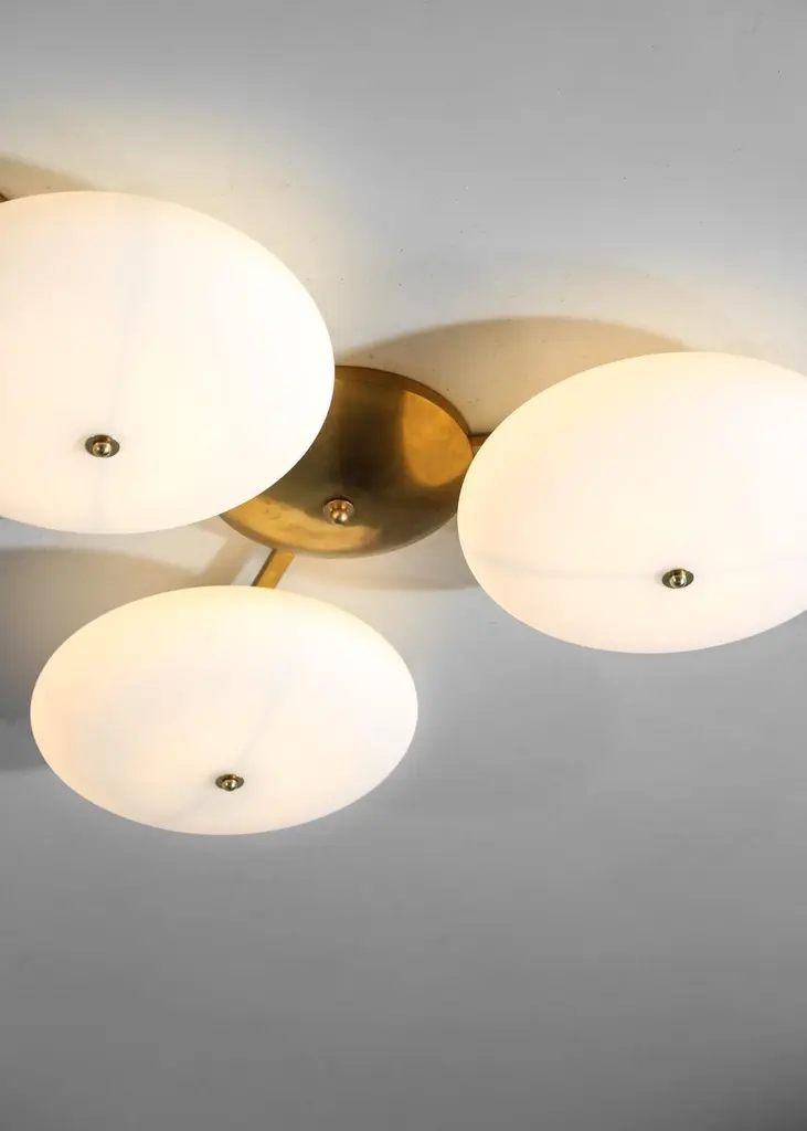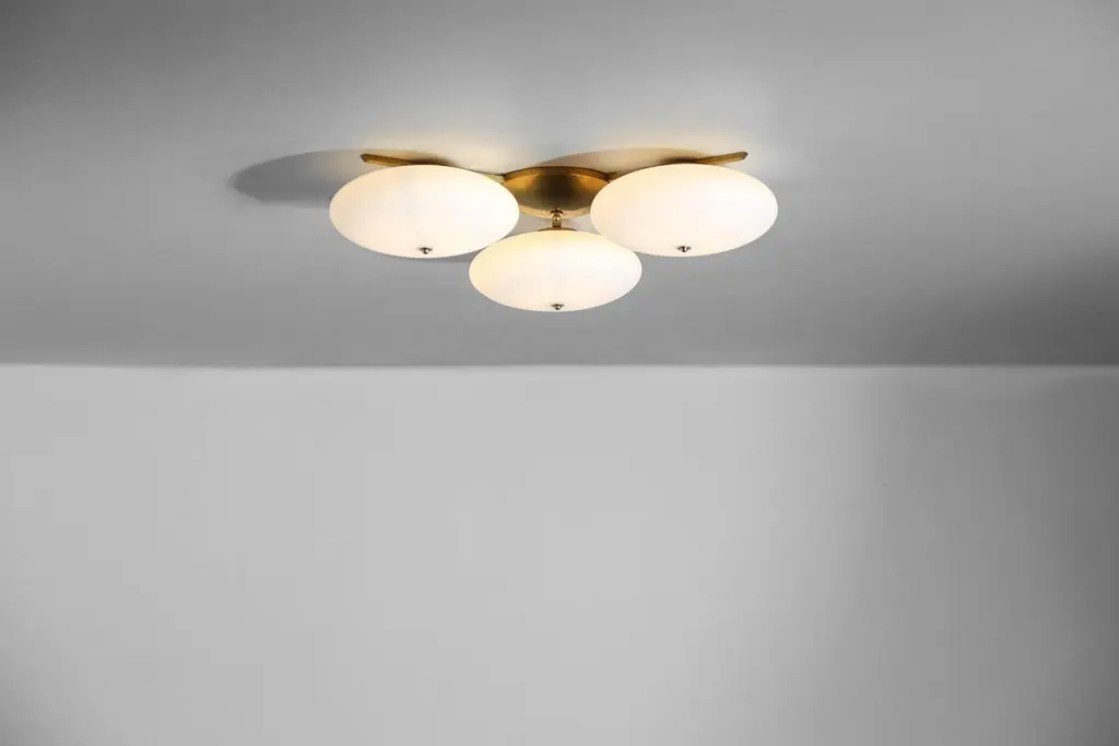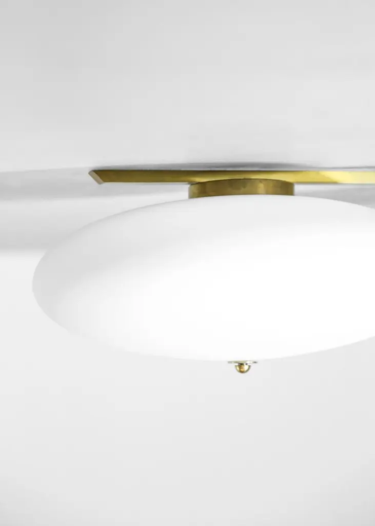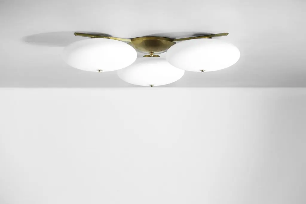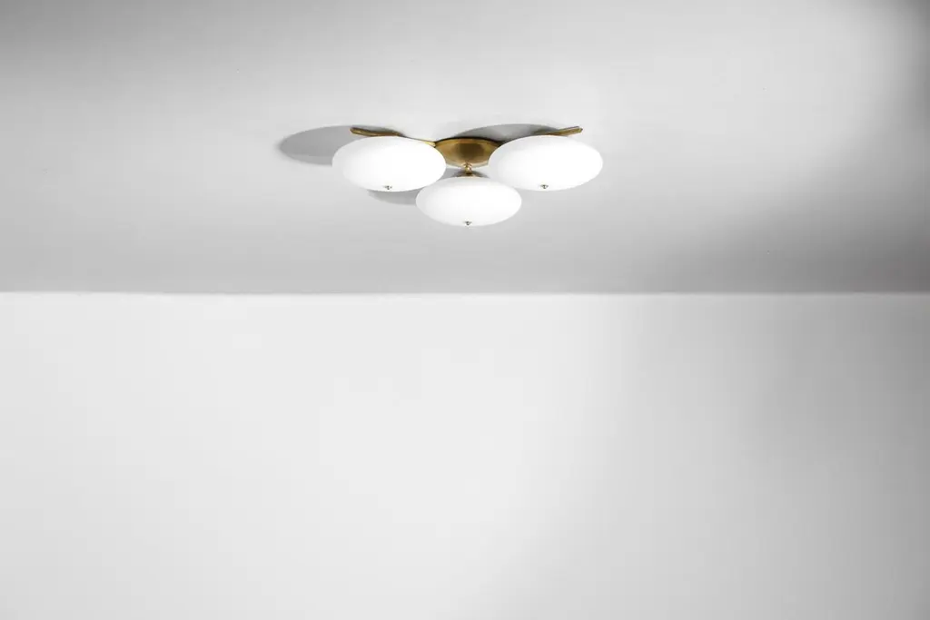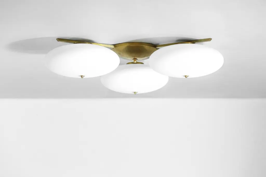 Modern flush mount "Pia" in the style of Angelo Lelli composed of three opaline glass with brass structure. Bulbs LED E27 recommended.
