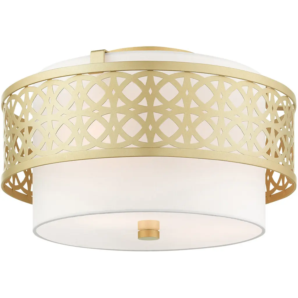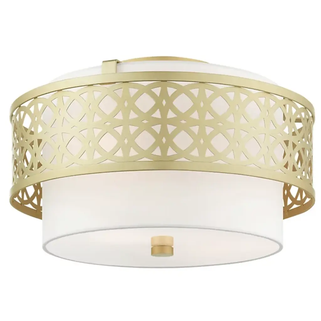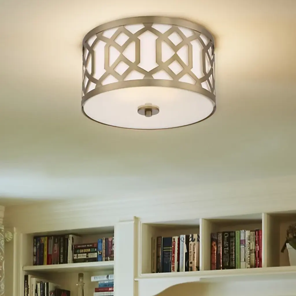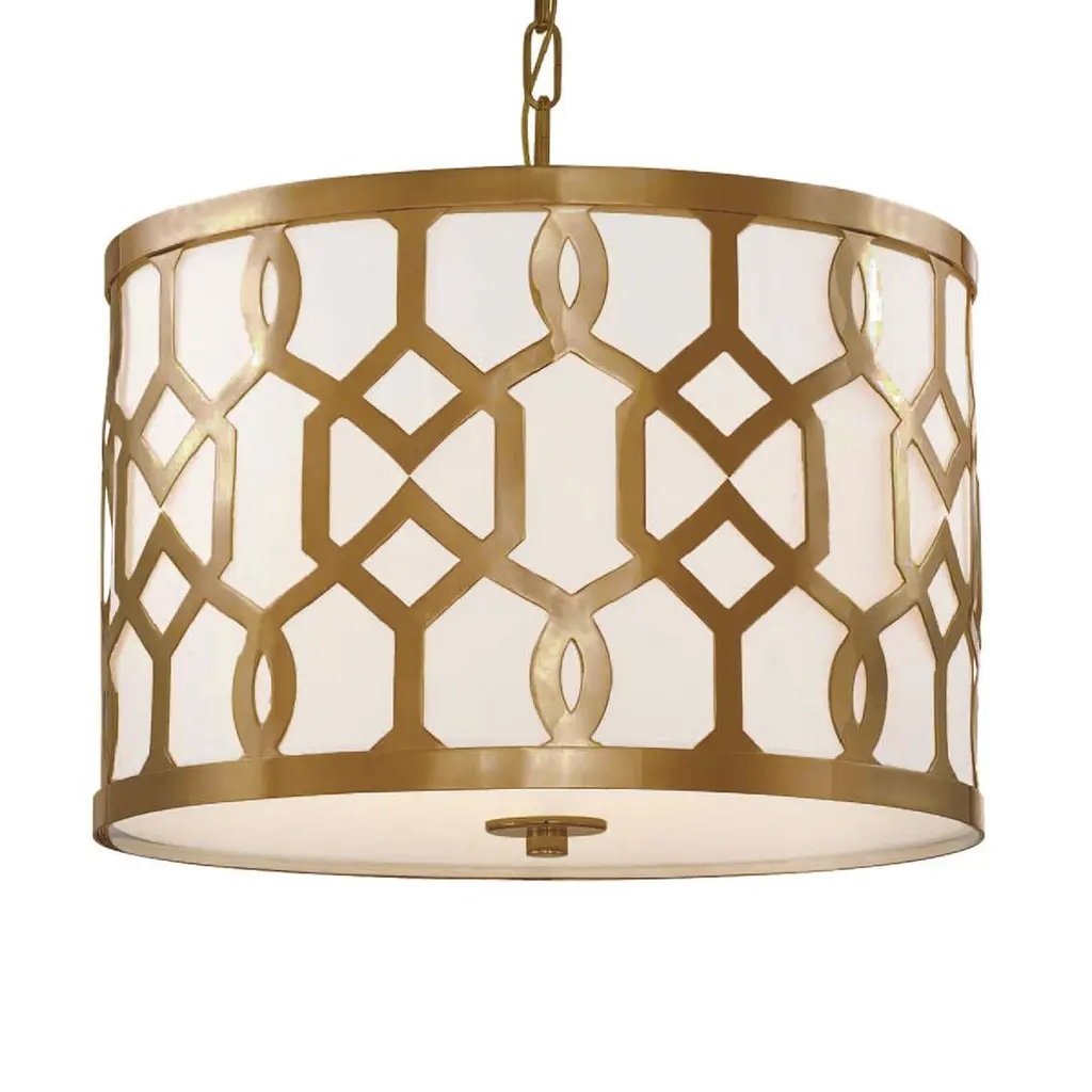 The Crystorama Jennings Flushmount from designer Libby Langdon features an interesting geometric pattern that has a graphic feel without overpowering the space. The linen shade adds a little texture to the piece, while the bottom glass diffuser scatters the illumination just right.