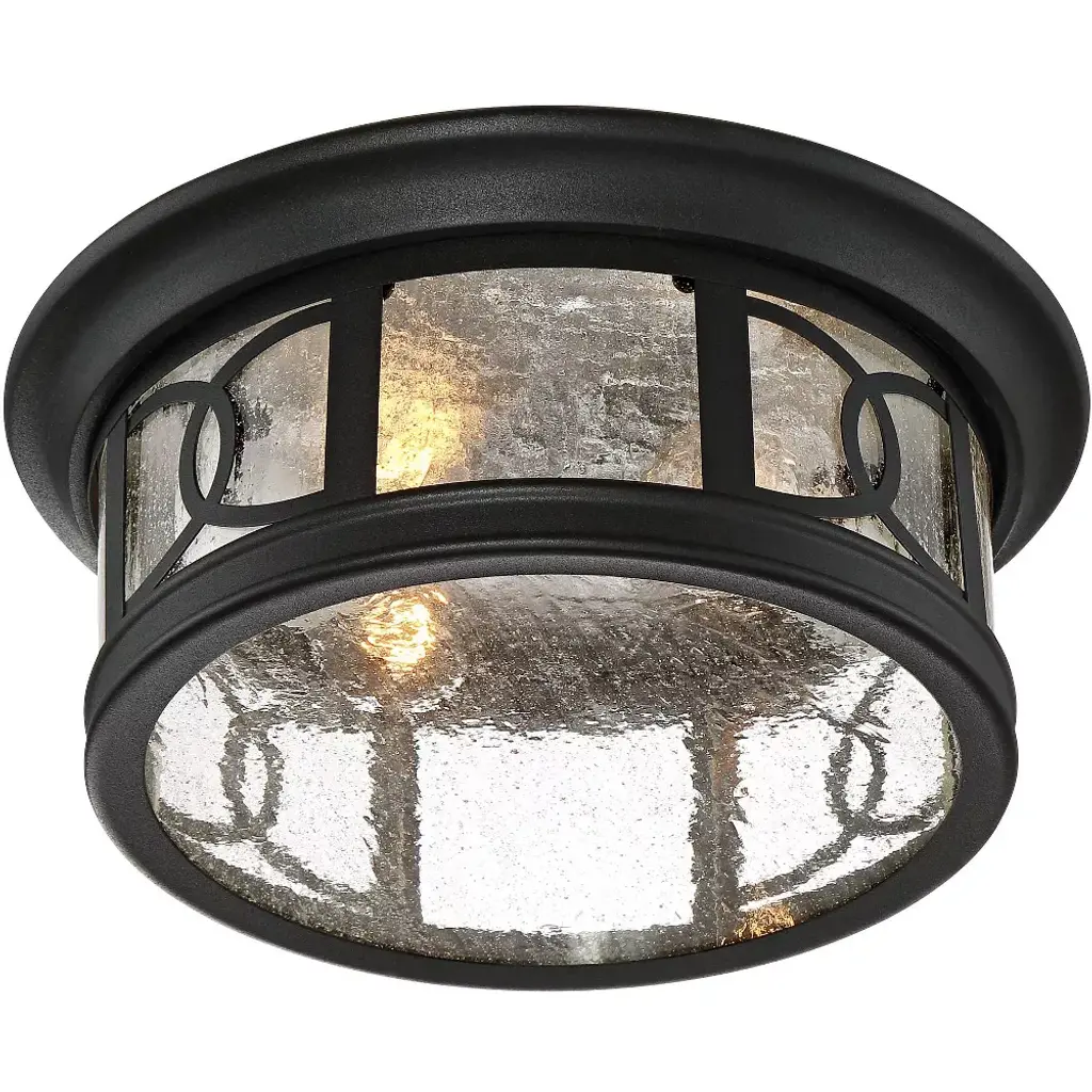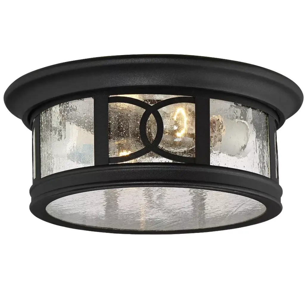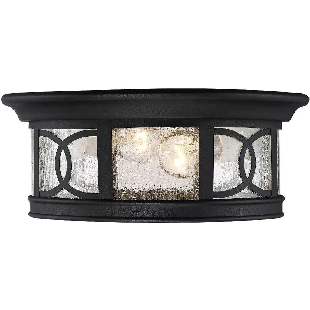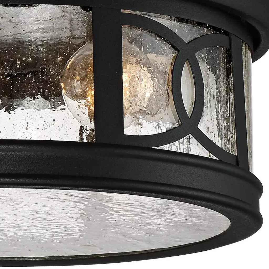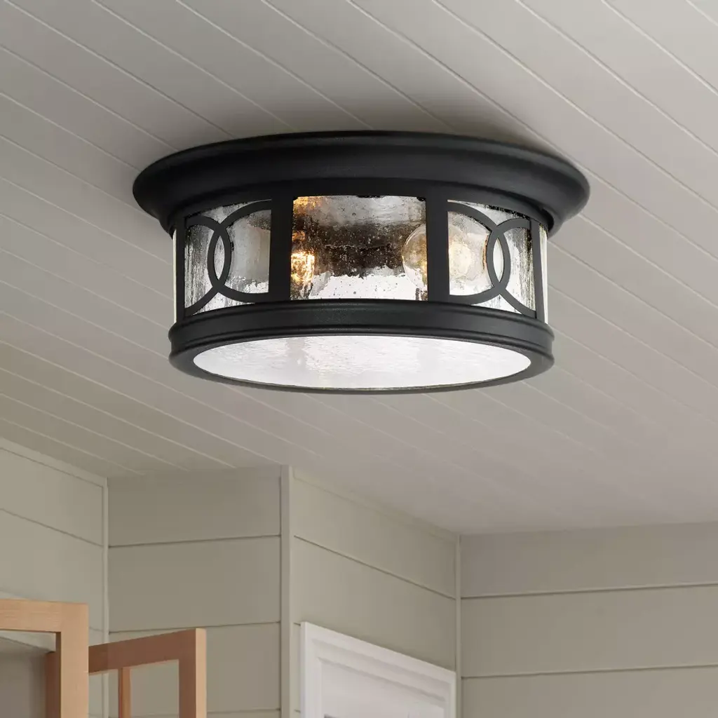 Illuminate your home with this beautiful Mission-style ceiling light from the Capistrano collection by John Timberland. This outdoor ceiling light comes in a black finish steel flushmount frame with an aesthetically pleasing design. The seedy glass gives it a wonderful rain-washed effect.