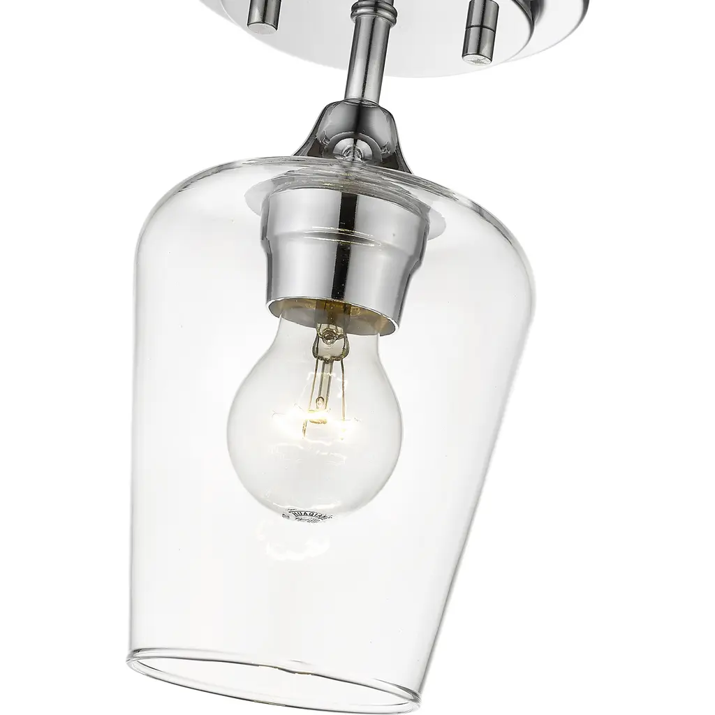 With a novel silhouette resembling an inverted goblet, this ultra-modern one-light flushmount ceiling light captures attention and admiration in a dining area, living space, or bedroom. Keep up with contemporary custom style with this sophisticated light from the Joliet collection. Its large Bordeaux clear glass shade embellishes a radiant chrome finish mount and round canopy, delivering a low-key yet high-class effect.