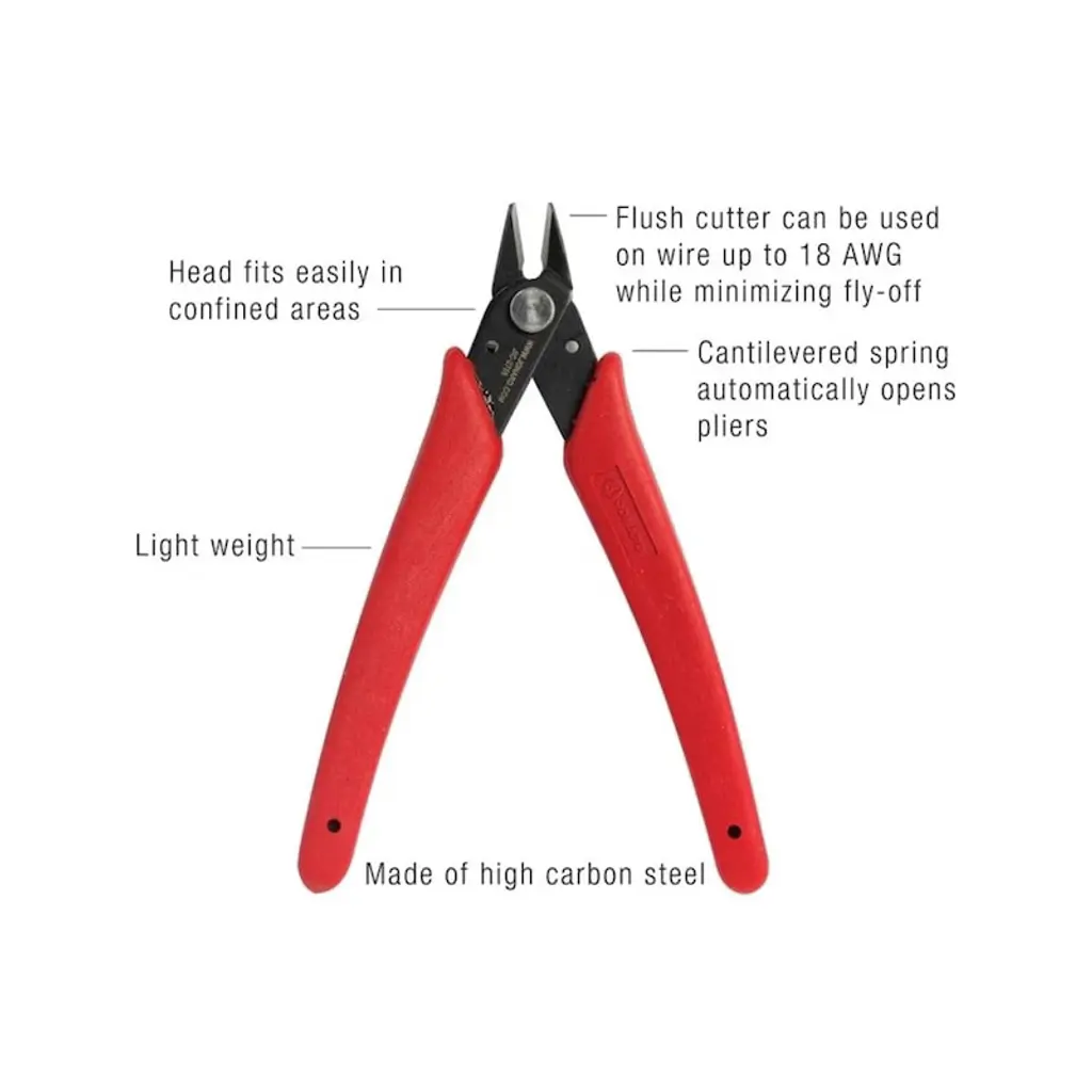 Diagonal Cutting Plier, Plier Type Diagonal Cutting Pliers, Cut Profile Flush, ESD-Safe No, Insulated No, Non-Sparking No, Head Offset Angle 0 Degrees , Nose Shape Oval, Overall Length 5 in, Maximum Jaw Opening 3/8 in, Jaw Length 1/2 in, Jaw Width 1/2 in, Jaw Opening Type Spring Return, Grip Style Standard Cushion, Maximum Wire Cutting Gauge 18 AWG, Voltage Rating Not Rated, Tether Ready No, Additional Tool Functions Wire Cutter, Blade Material Steel, Cutter Length 1/2 in, Features Lightweight