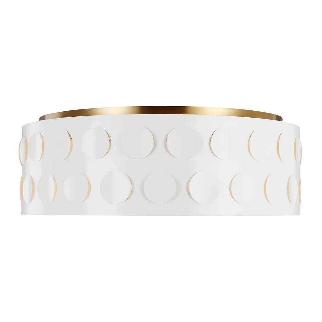 Bring a touch of playfulness and classic sophistication to your space with the Kate Spade New York Dottie Flush Mount from Visual Comfort & Co. This unique flush mount boasts an iconic dot motif, cut into the metal, that creates a charming ambient light effect. The classic metal drum shade and etched glass diffuser perfectly frame the muted glow, making it a great choice for transitional settings in hallways, foyers, bedrooms, bathrooms, or any space in need of overhead illumination. Highlights
