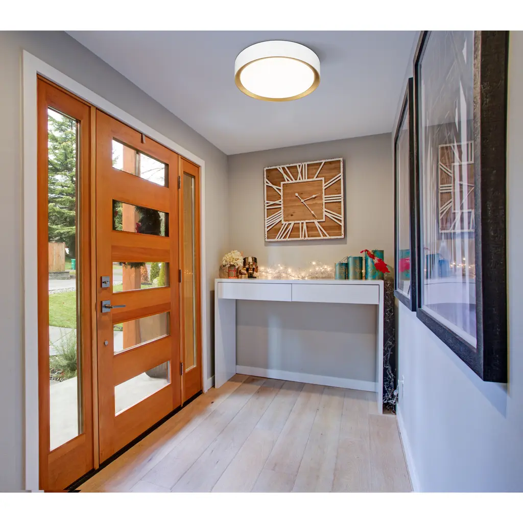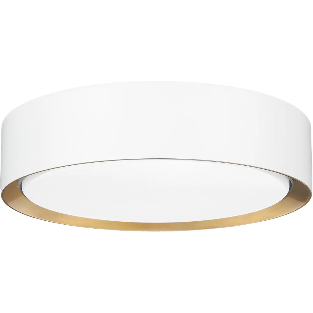 Frosted acrylic and a matte white outer finish create a soft, refined look and feel for this modern one-light flush mount ceiling light. An inner finish of modern gold adds richness and warmth, perfect for understated, sophisticated decor. The light offers integrated LEDs for energy efficient illumination in any room.