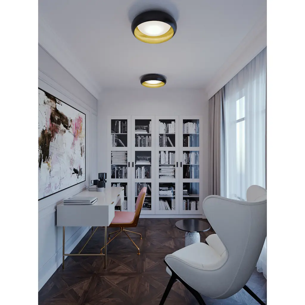 A unique and elegant design, the Kayce LED Flush Mount features a modern look with a black steel shade and gold interior. This flush mount light has five color adjustable color temperature and is sure to catch your guests’ attention. Add this light fixture to your entryway, dining area, or bedroom for a bold accent.