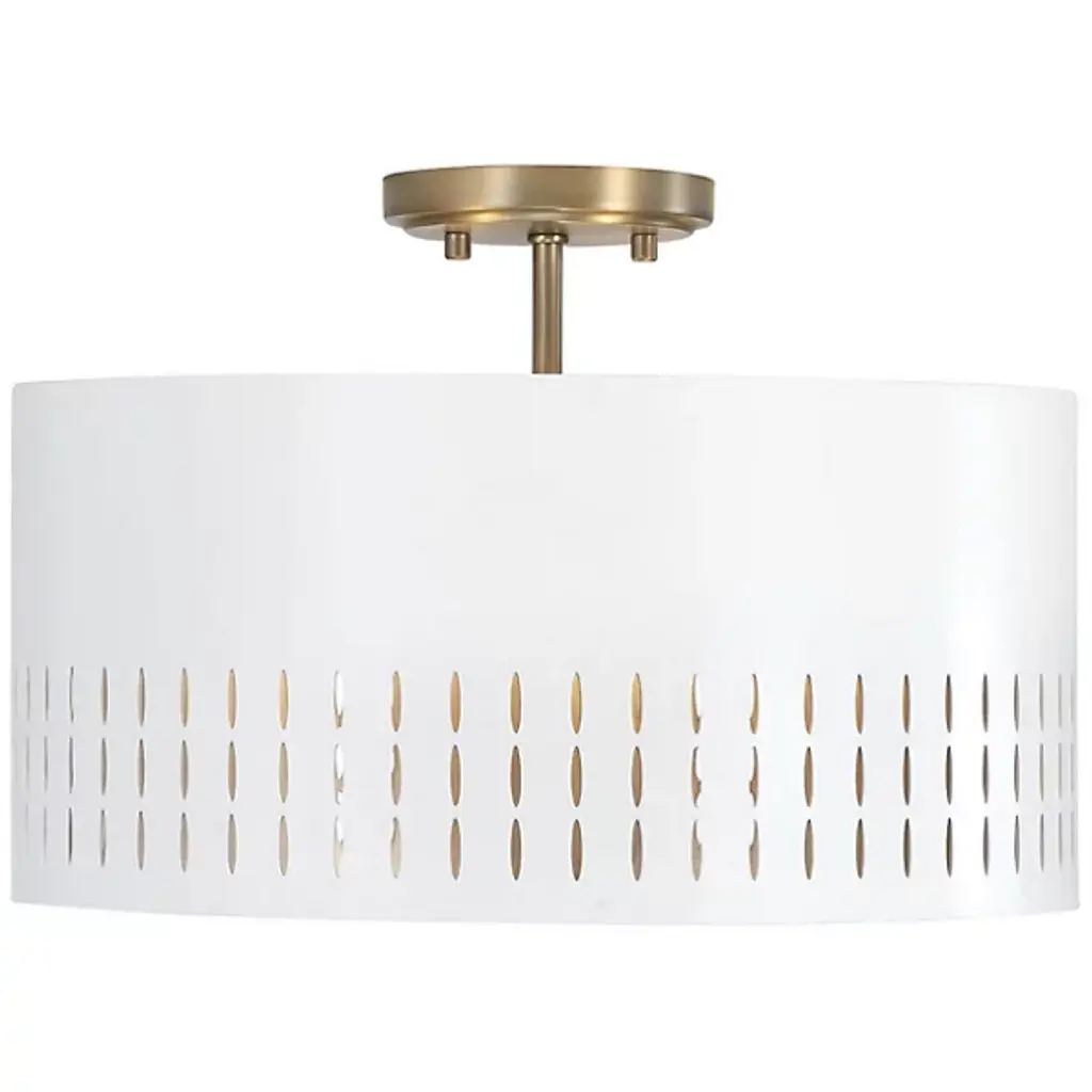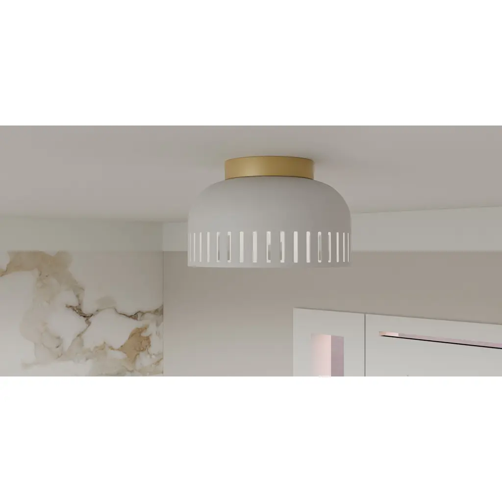 Bring sophisticated style and warmth to your home with Keagan. The sleek metal dome shade features unique geometric cutouts, adding a modern flourish to the minimalist design. The Keagan flush mount ceiling light is available in matte black or white, both finishes pairing beautifully with the shining gold canopy.
