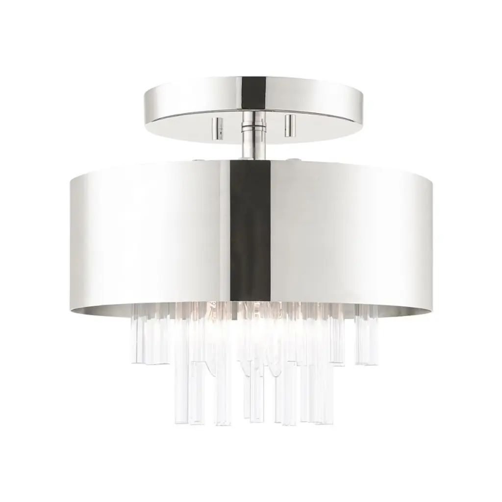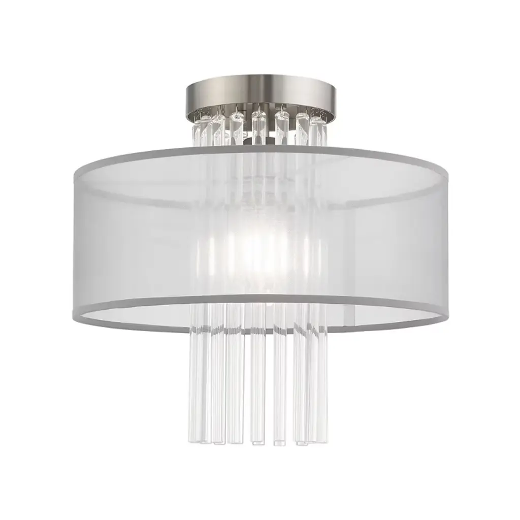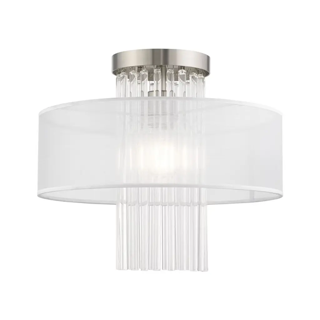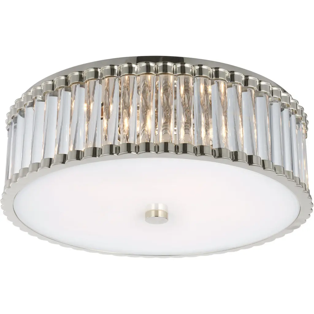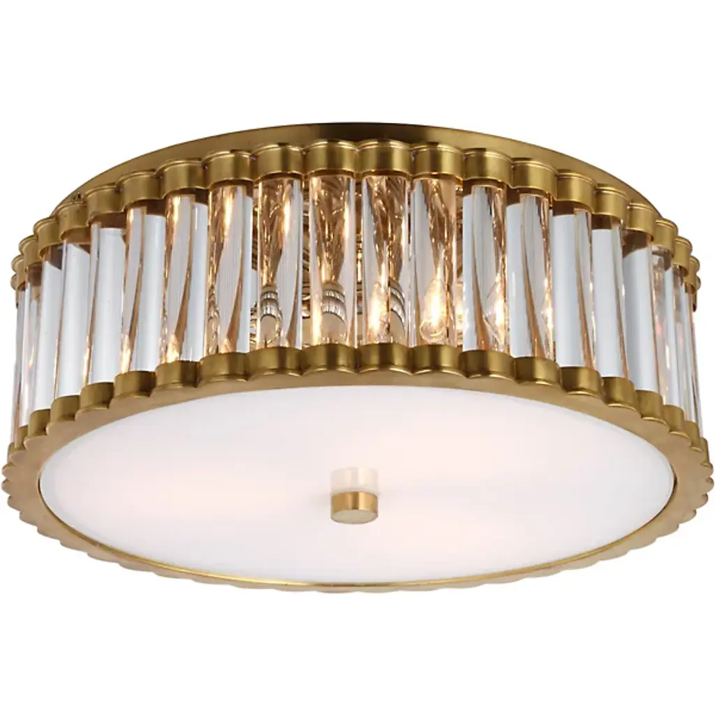 The Kean Flushmount by Visual Comfort Signature, formerly known as Visual Comfort, has an elegant, classy feel that brings a dressed-up touch to the spaces it brightens. Nestled close to the ceiling, a glass diffuser is paired with a circular frame that features a series of beautiful glass rods that are set close to one another, creating a dynamic, textured body that playfully reflects and refracts light throughout its form. The metal frame and minimal finial that hold this structure together has a lovely finish that keeps this design elevated, completing the chic look of this piece.