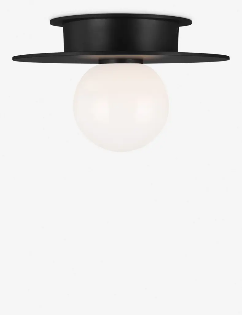 The Kelly Wearstler Nodes Flush Mount from Visual Comfort & Co is a luxurious and sophisticated choice, offering a modern yet timeless design with its simplistic cylindrical shape. Crafted from durable steel and paired with a delicately textured milk glass globe, this gentle fixture will evenly disperse ambient light around your space and make a striking statement in any living or dining room. Highlights Designed by celebrated interior designer Kelly Wearstler Damp Rated and suitable for use in bathrooms and covered patios Milk white glass mouth blown by master craftsmen