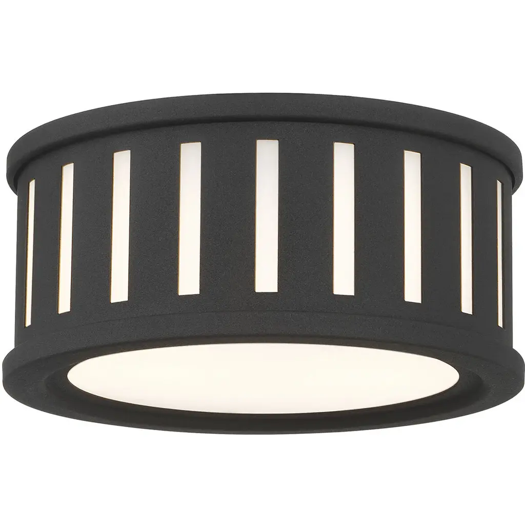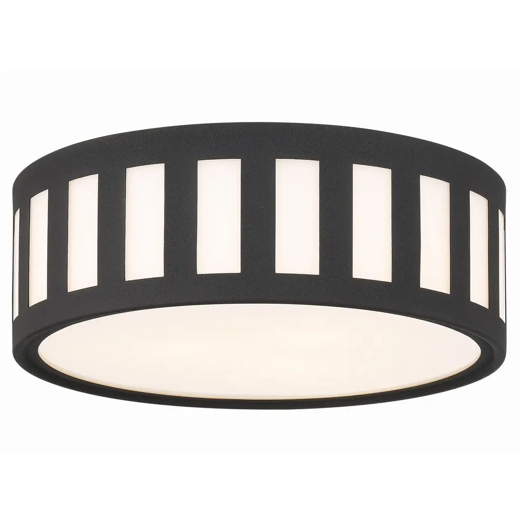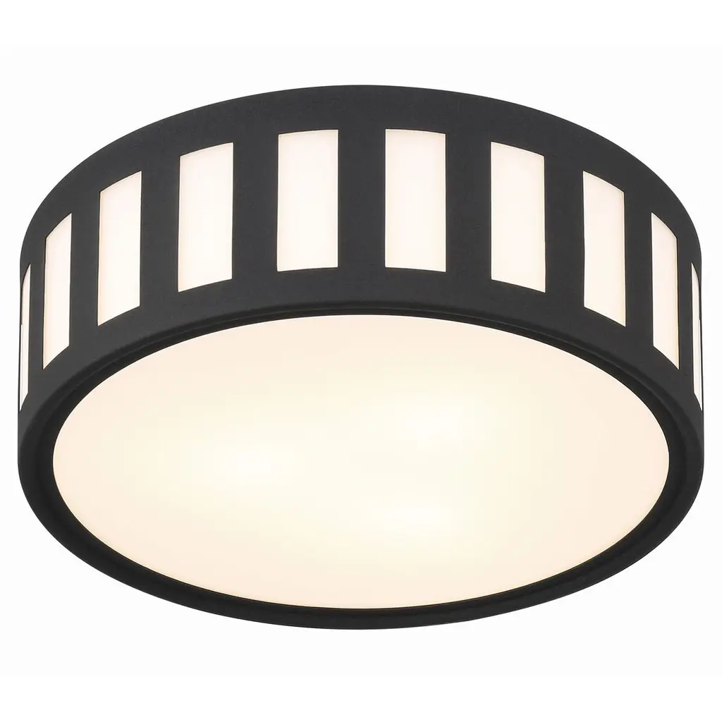 The contemporary Kendal collection makes a statement with its graphic uniform pattern. Its metal frame surrounds white glass in this elegant drum-shaped ceiling mount. The high contrast against white glass is a great way to add a touch of drama to a room.
