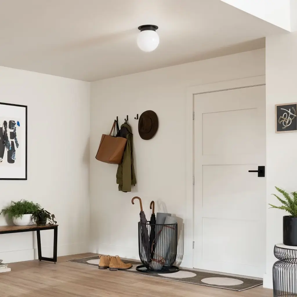 The Albers 1 light flush mount illuminates on its own or in multiples. Its refined black finish complements many design styles. It comes with a globe-shaped opal glass shade. Material: Steel, Finish Color: Black, Width: 8", Height: 8.5", Length: 8", Lamping Type: Incandescent, Number Of Bulbs: 1, Wattage: 75 Watts, Dimmable: Yes,