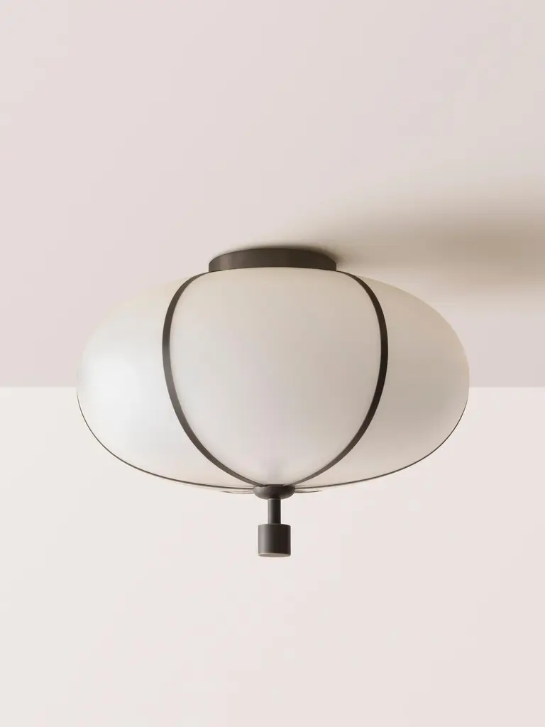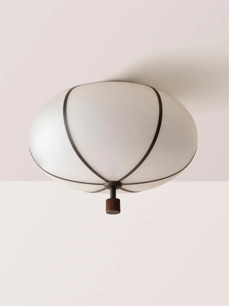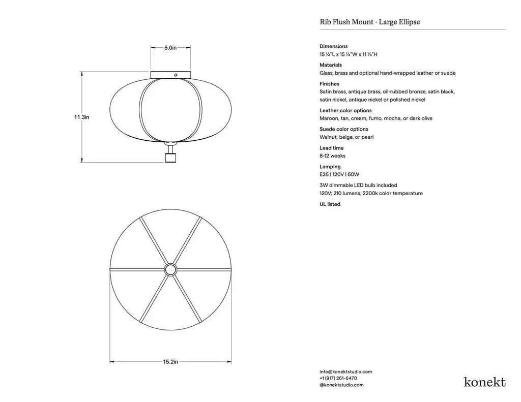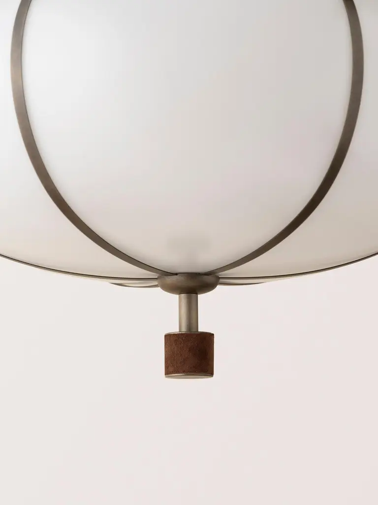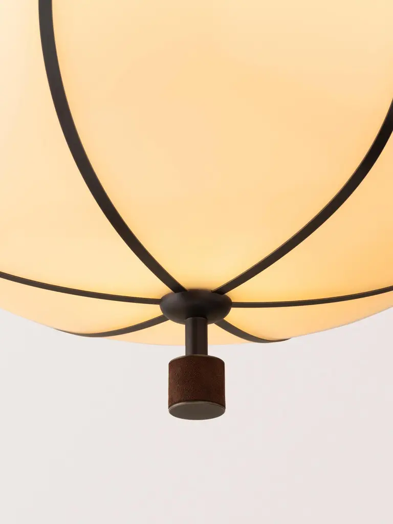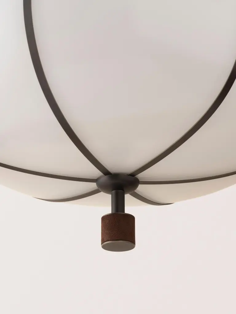 The Rib Flush Mount - Large Ellipse is blown in Italy and delicately framed by thin brass ribs. A cylindrical brass finial, with optional hand-wrapped leather or suede, elongates the fixture and adds a finishing touch of refinement.Available in a variety of metal finishes and leather/suede color options. Leather/suede is optional.