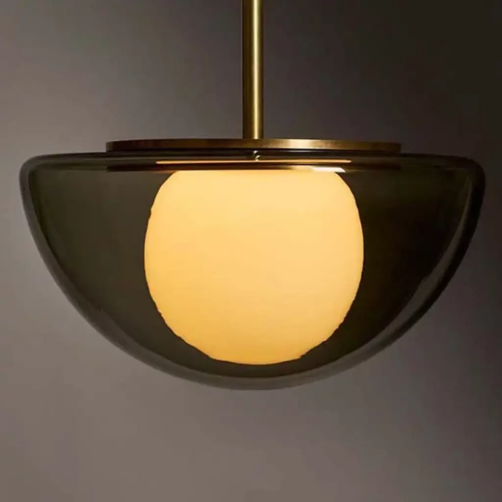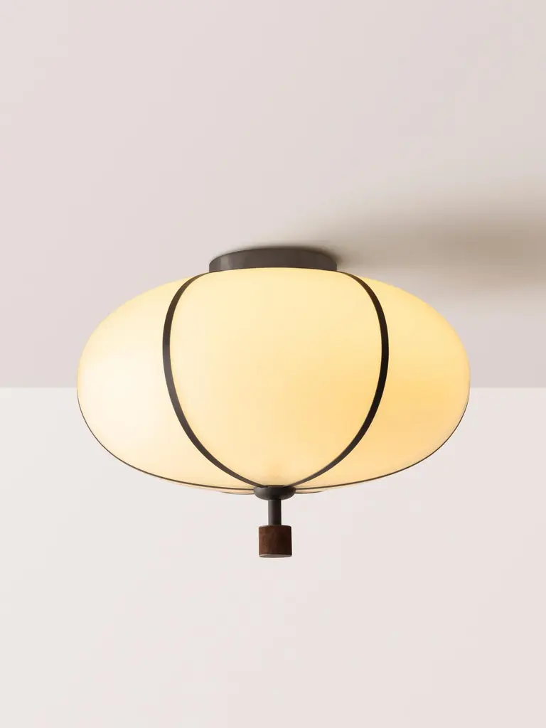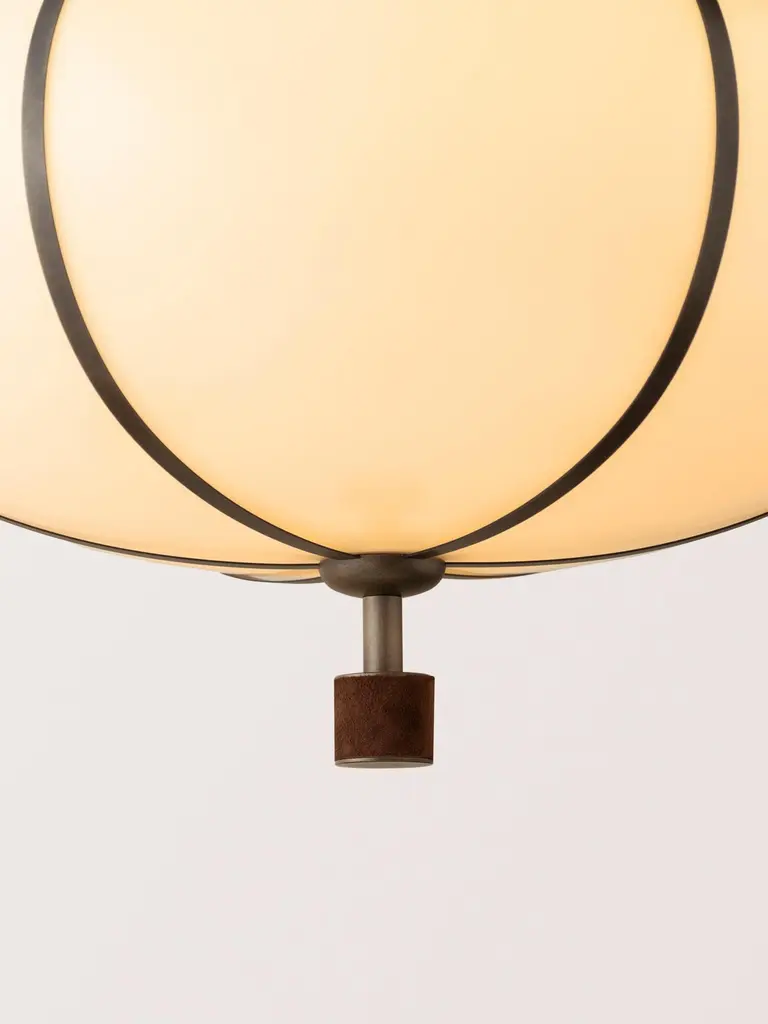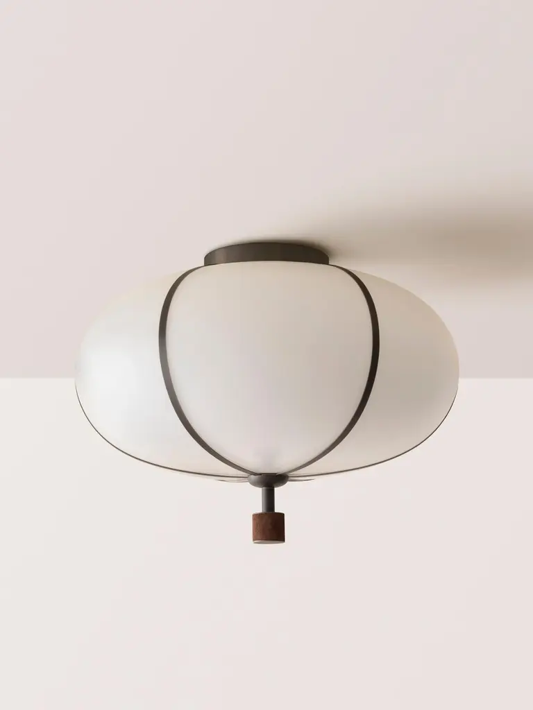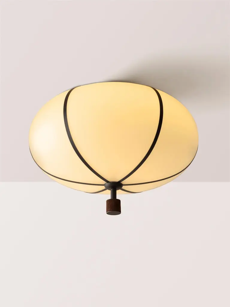 The Rib Flush Mount - Large Ellipse is blown in Italy and delicately framed by thin brass ribs. A cylindrical brass finial, with optional hand-wrapped leather or suede, elongates the fixture and adds a finishing touch of refinement.Available in a variety of metal finishes and leather/suede color options. Leather/suede is optional.