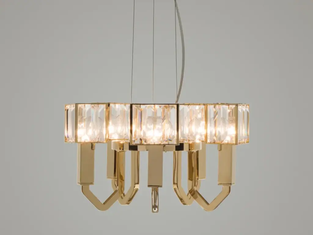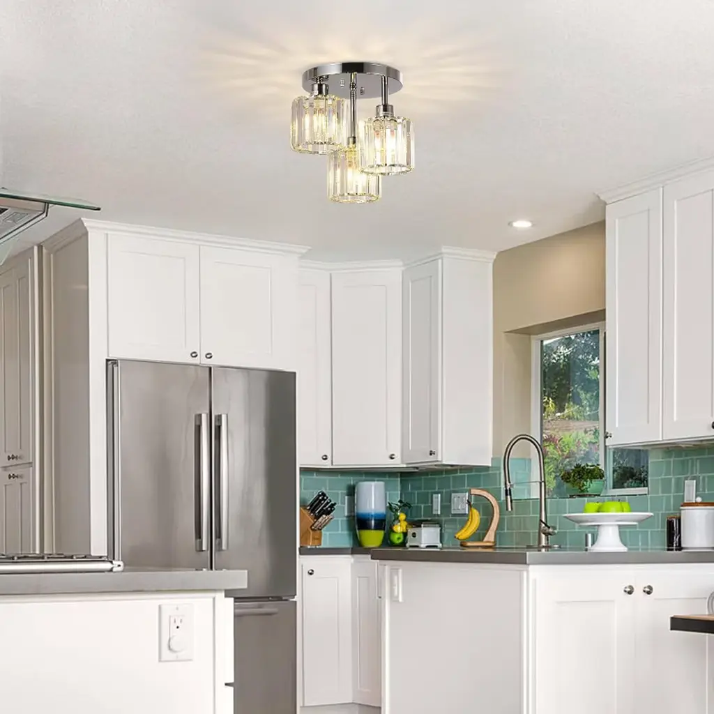 This crystal ceiling lamp is an innovative lighting solution, perfect for spaces with low ceilings. Its unique open design ensures even light distribution. The crystal material has high light transmittance, paired with a gold metal frame. When the kitchen lamp is turned on, the clear crystal lampshade creates a beautiful glow, illuminating your space with charming style.
