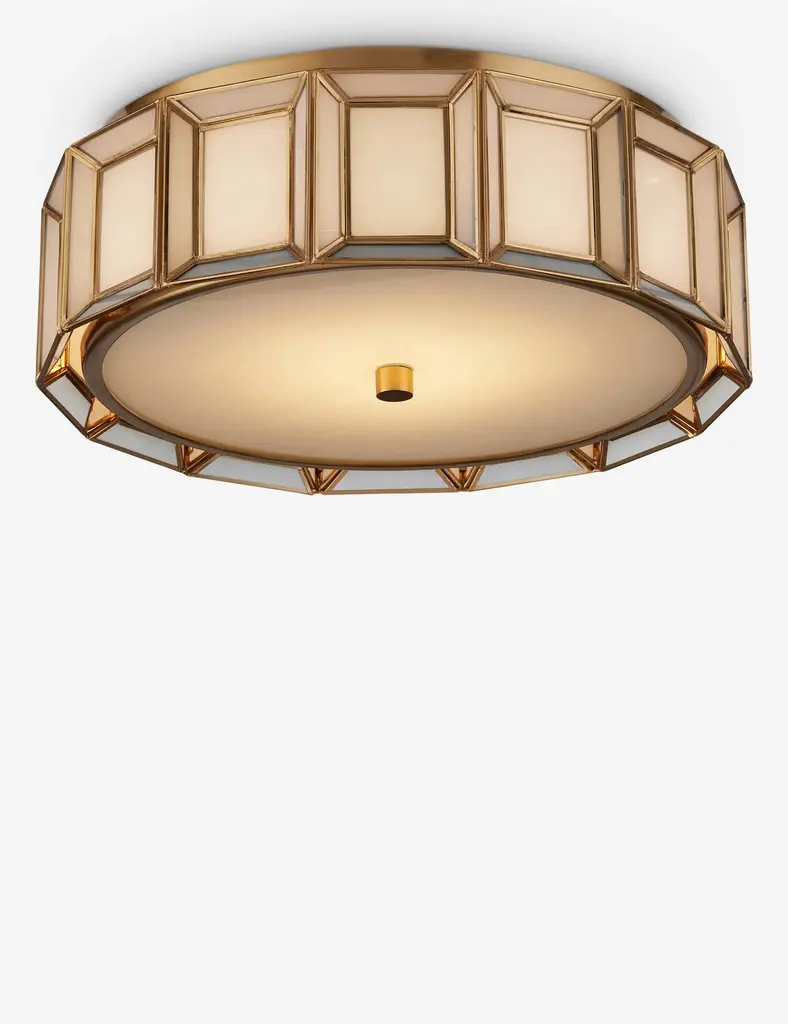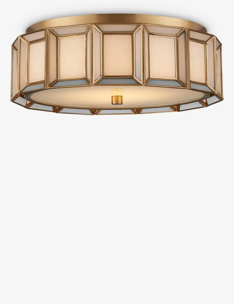 Labarre elevates modern lighting with a touch of elegance. The flush mount's faceted design features translucent milk glass panels in a brass-finished drum frame for a beautifully diffused glow when illuminated. This artfully crafted ceiling light strikes refinement overhead with a compact profile perfect for low ceilings.