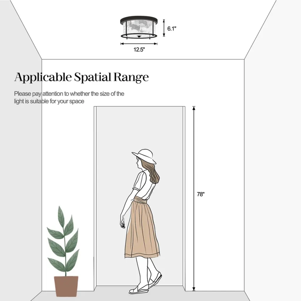 LamQee flush mount ceiling light is made of clear hammered glass with a delicate outer metal frame; and they have different colors such as black, brushed gold, brushed nickel and rustic white, to adapt variety of home styles such as modern, farmhouse, simple and industrial; the bulb is 2-lights, the light passes through the hammered glass, the reflection leaves on the wall and the starburst pattern forms on the ceiling, creating bright, unique, elegant and warm effect